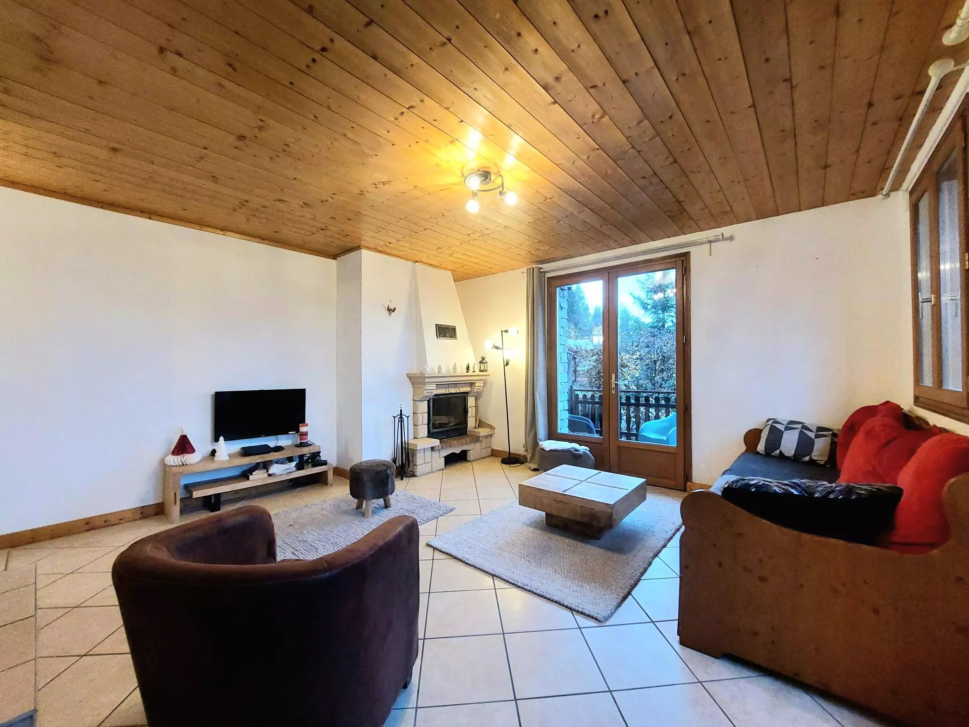 Das Wohnzimmer ist mit einem Kamin (Holz wird nicht gestellt), einem Sofa, einem Sessel und einem Fernseher ausgestattet.