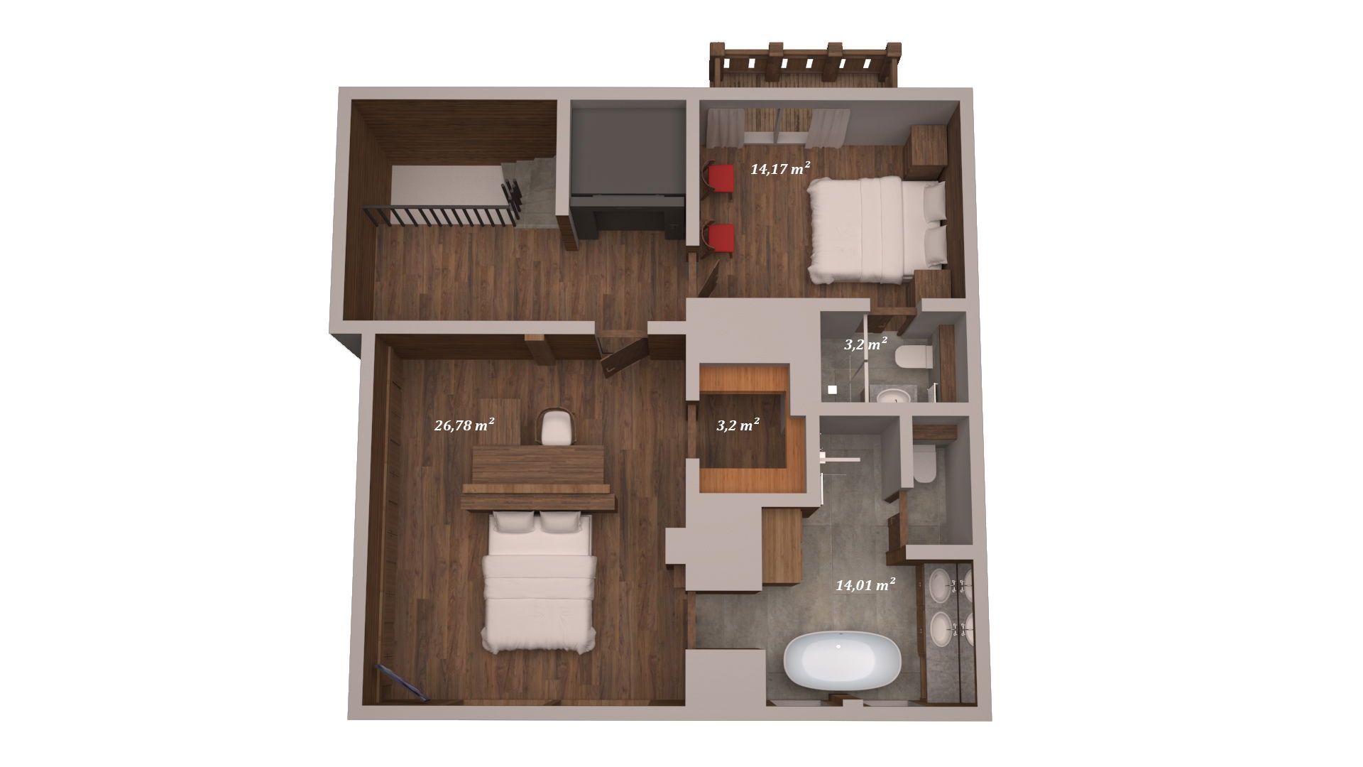 - Schlafzimmer 1: Doppel- oder Einzelzimmer mit eigenem Bad (90x200) mit Duschbad, Toilette und Ankleideraum, TV