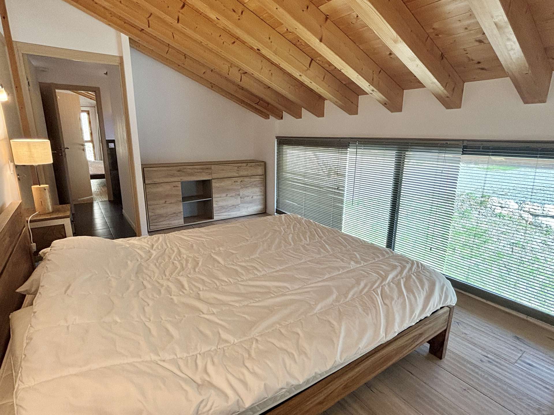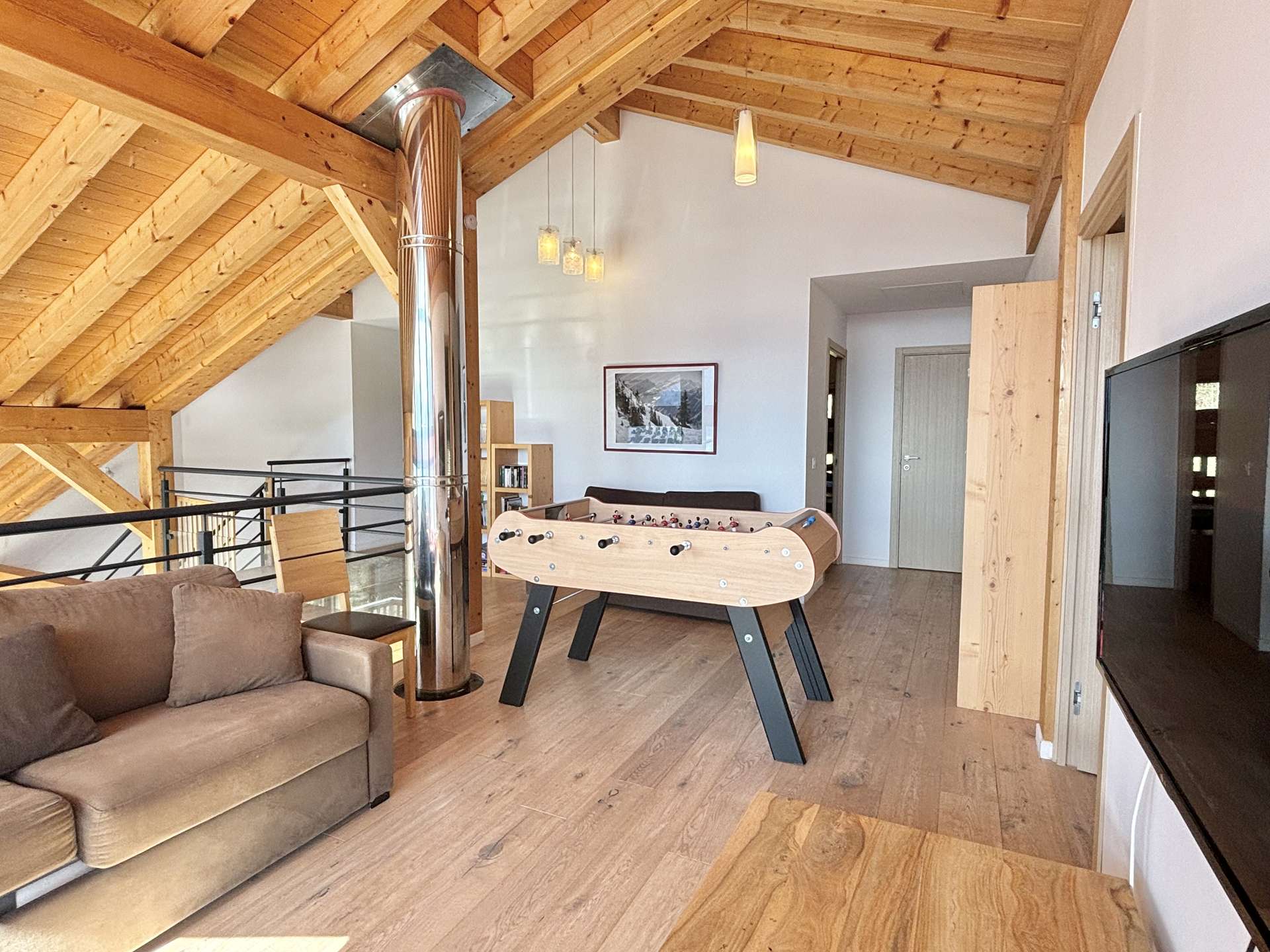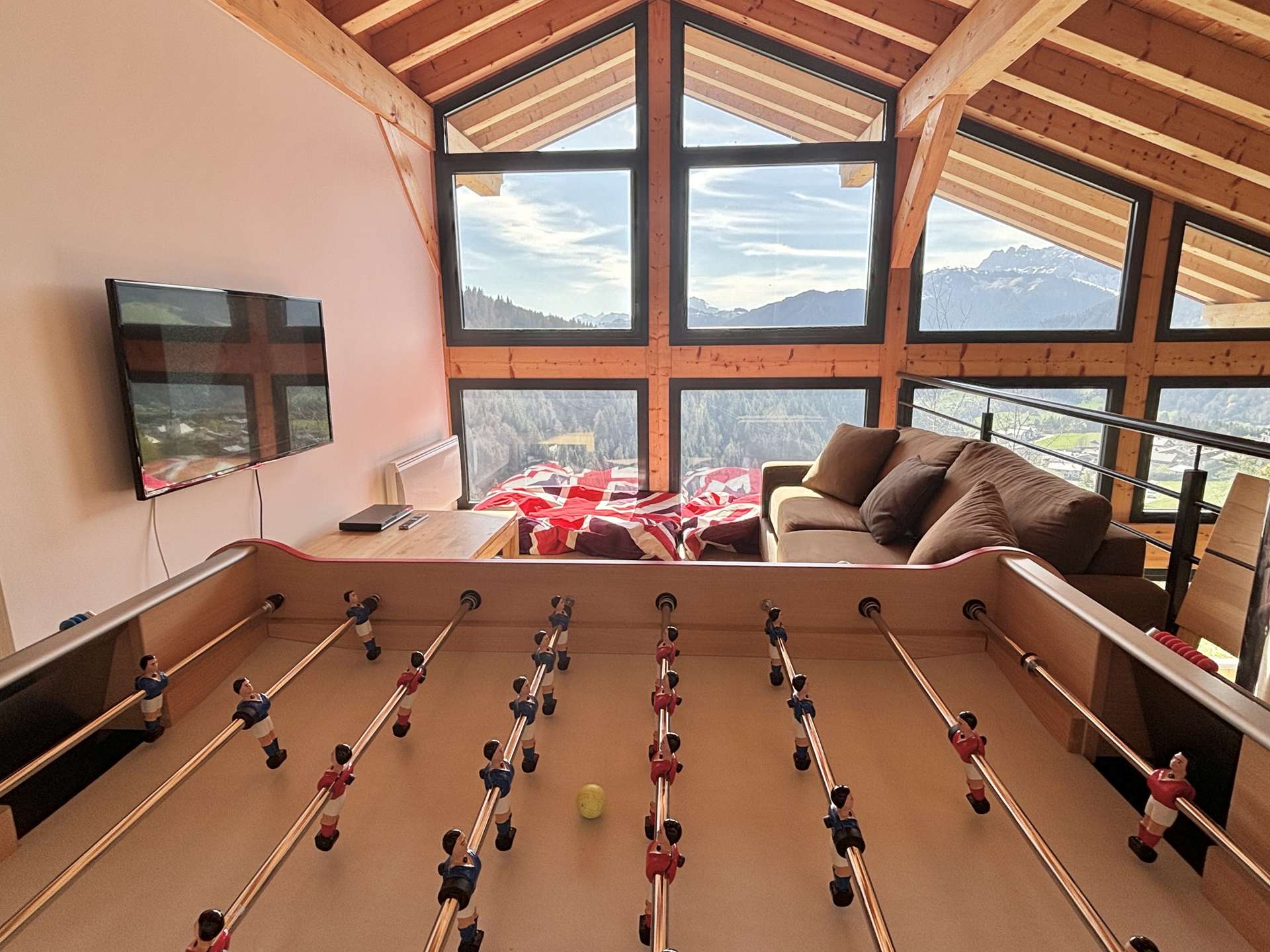 Im ersten Stock befinden sich ein großes, helles Wohn-/Esszimmer mit großen Erkerfenstern, einem Kaminofen, eine voll ausgestattete offene Küche, ein erstes Schlafzimmer mit Doppelbett und Waldblick, ein zweites Schlafzimmer mit Doppelbett und Waldblick, ein drittes Schlafzimmer mit Doppelbett, Ankleidezimmer und Waldblick, ein viertes Schlafzimmer mit zwei Etagenbetten und Waldblick (bitte beachten Sie: Das obere Bett ist nicht für Kinder unter 6 Jahren geeignet), ein fünftes Schlafzimmer mit Doppelbett, Ankleidezimmer und Bergblick, ein sechstes Schlafzimmer mit Doppelbett und Bergblick sowie eine Galerie mit einem Schlafsofa. Das Chalet verfügt über drei Duschräume, ein Badezimmer und vier separate WCs.