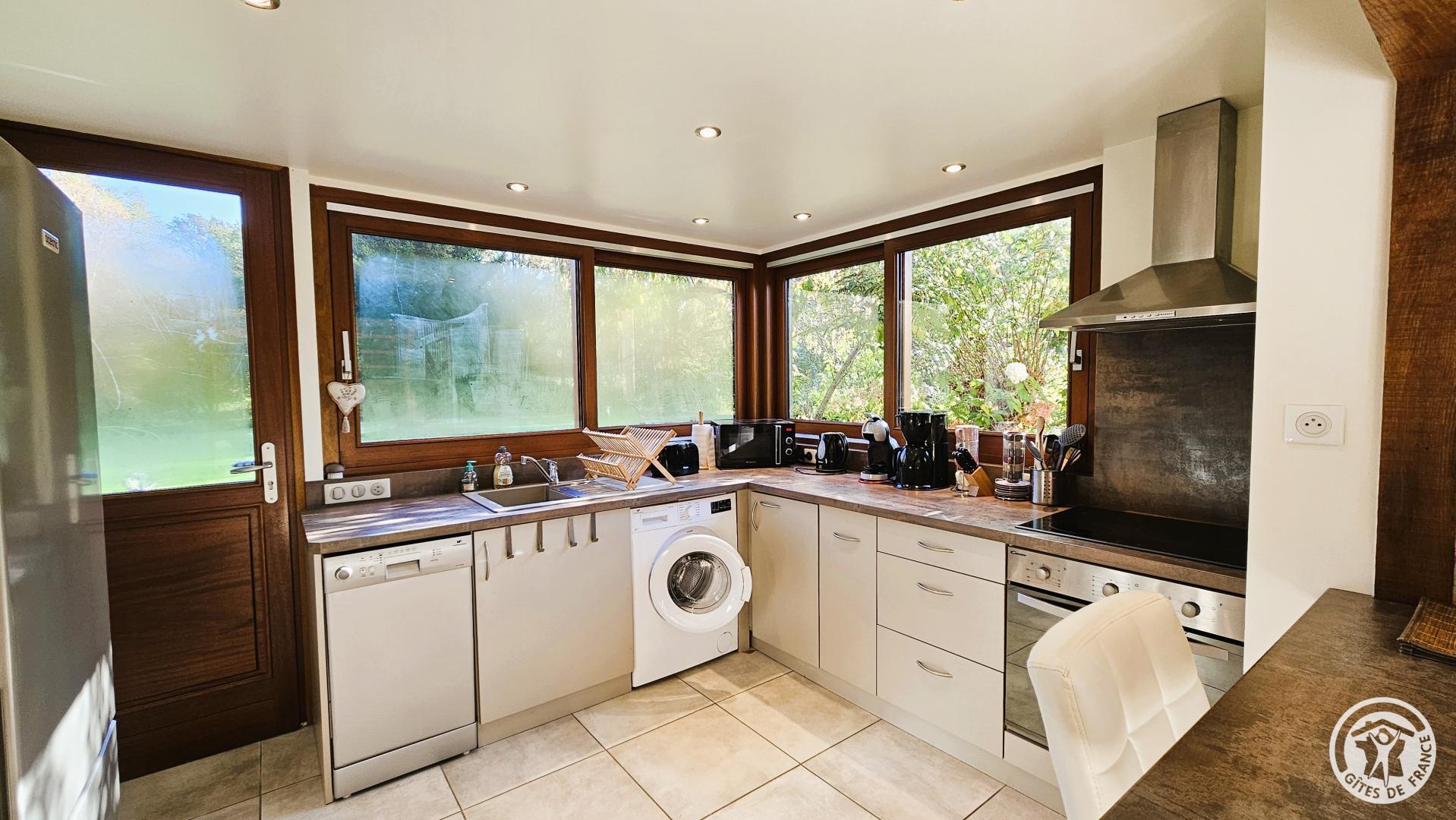 Sie finden eine voll ausgestattete Küche sowie ein gemütliches Wohnzimmer mit einem großen Ecksofa, ideal für Momente der Entspannung.