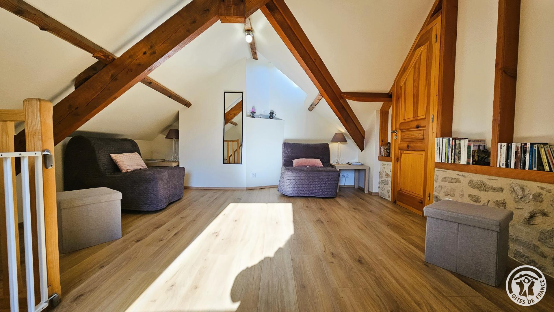 Im Obergeschoss erwartet Sie ein einladendes Schlafzimmer sowie ein Zwischengeschoss, das dank zweier einzelner BZs Platz für zwei weitere Schlafplätze bietet.