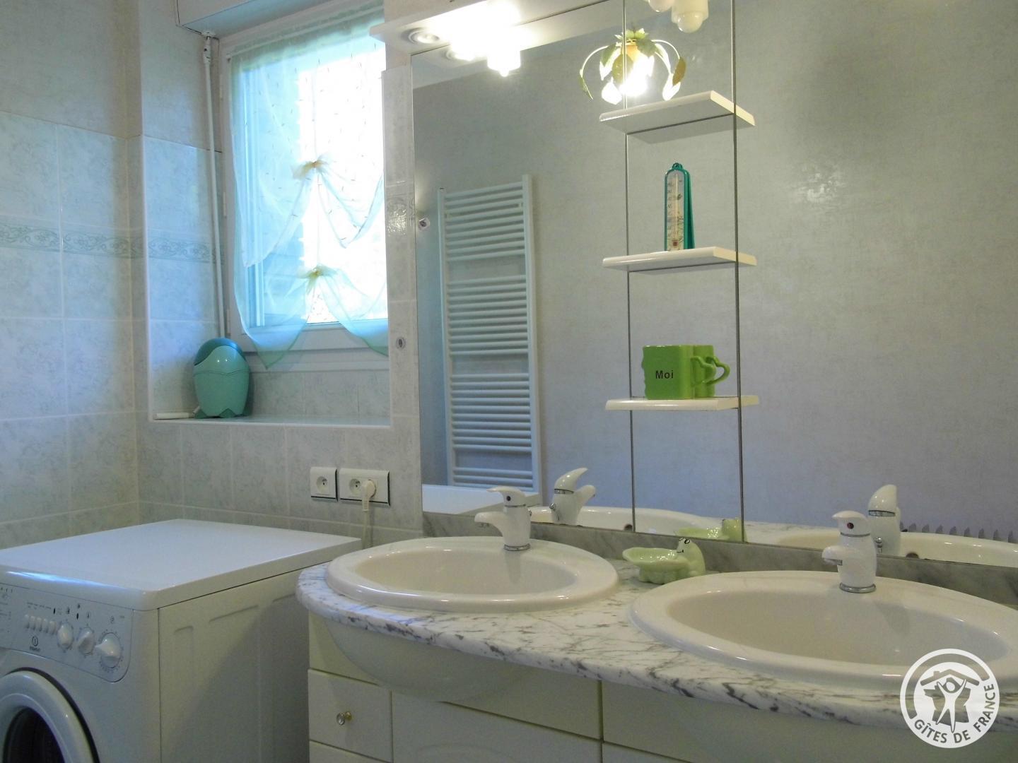 Das Duschbad mit Doppelwaschbecken und Waschmaschine ist von der Toilette getrennt.