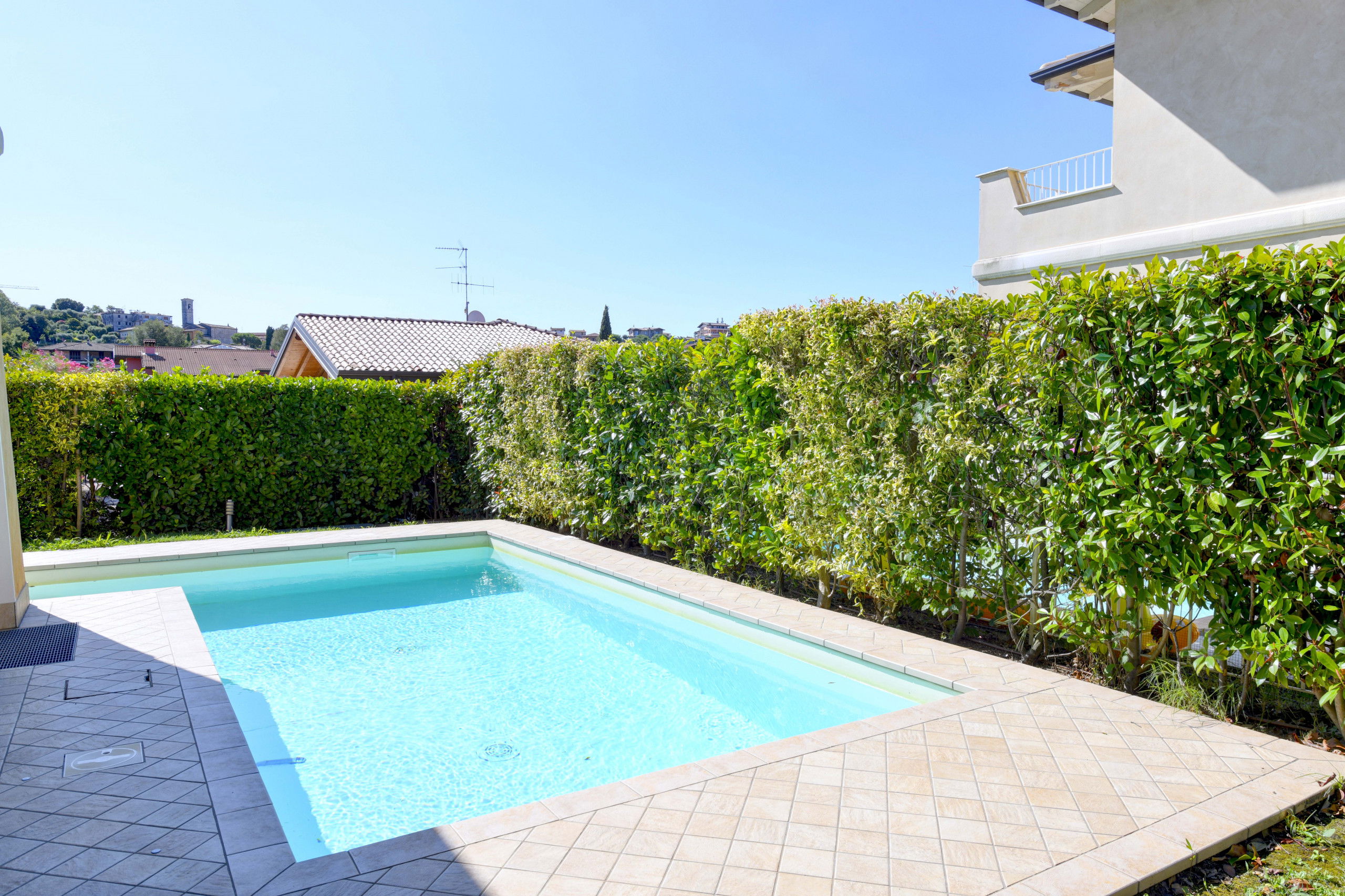 Charmante freistehende Villa mit Pool nahe dem Zentrum von Manerba del Garda, 500 m vom See entfernt. Das große und helle Haus erstreckt sich über drei Etagen, die durch Treppen verbunden sind. Im Untergeschoss großes Wohnzimmer mit Schlafcouch; Der Schlafbereich befindet sich im ersten Stock und besteht aus zwei Doppelzimmern, einem Doppelzimmer und einem Badezimmer.