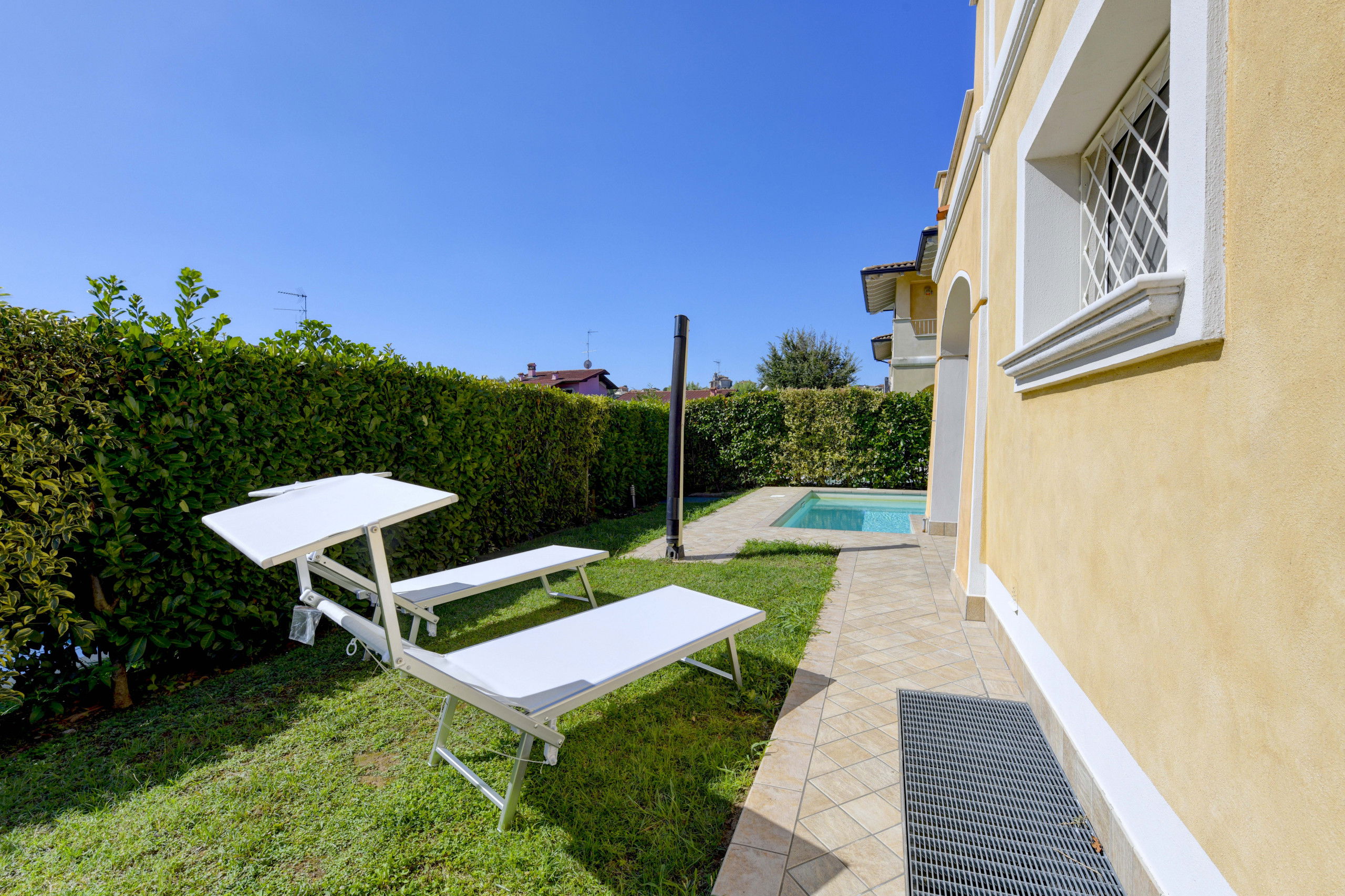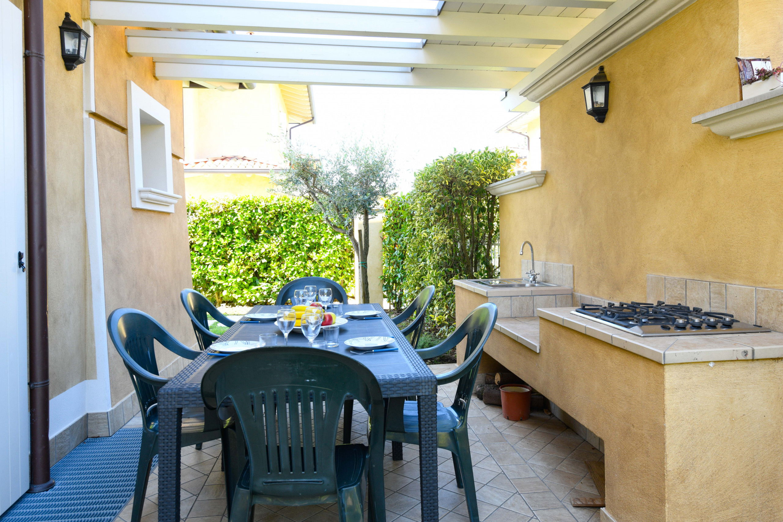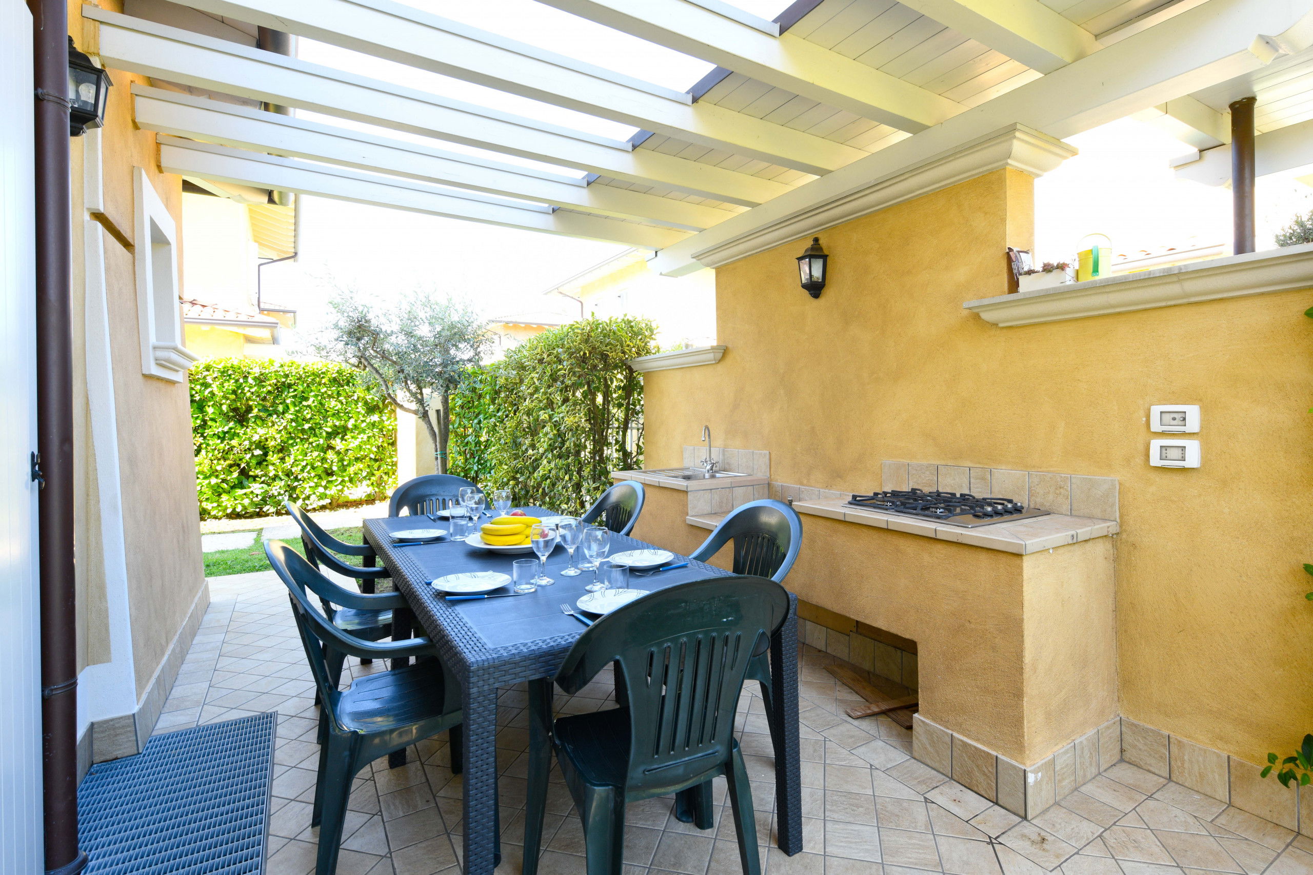Das Anwesen ist von einem großen privaten Außenbereich umgeben, der mit Tisch, Sonnenliegen, Außenküche und Sofas am Pool ausgestattet ist.