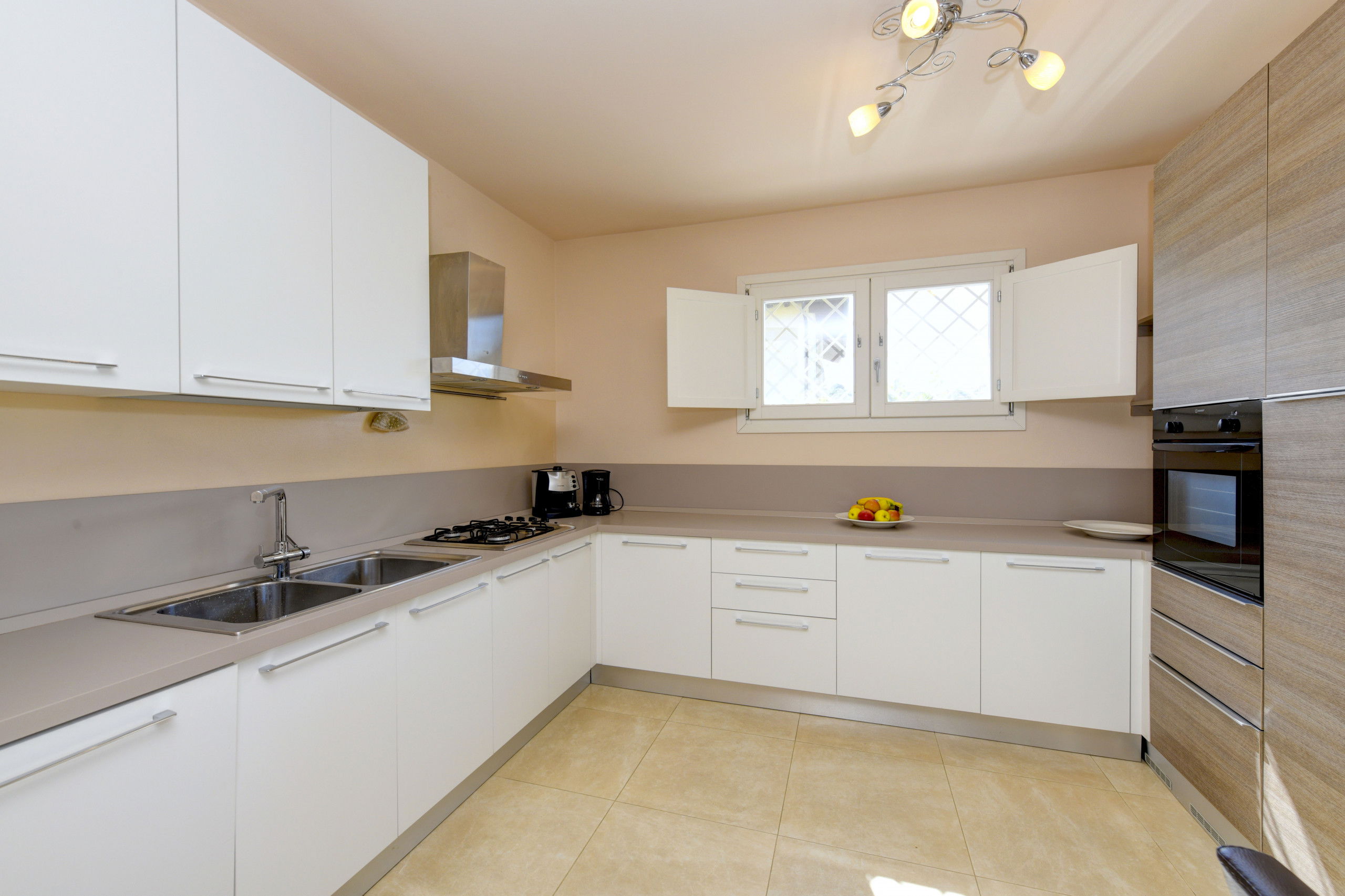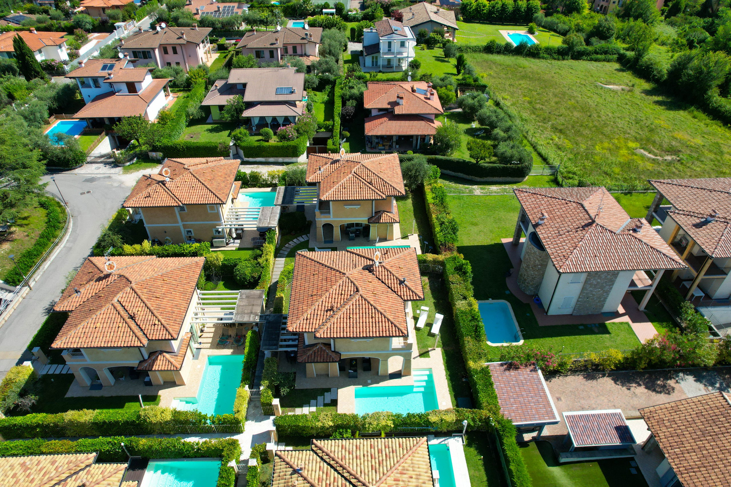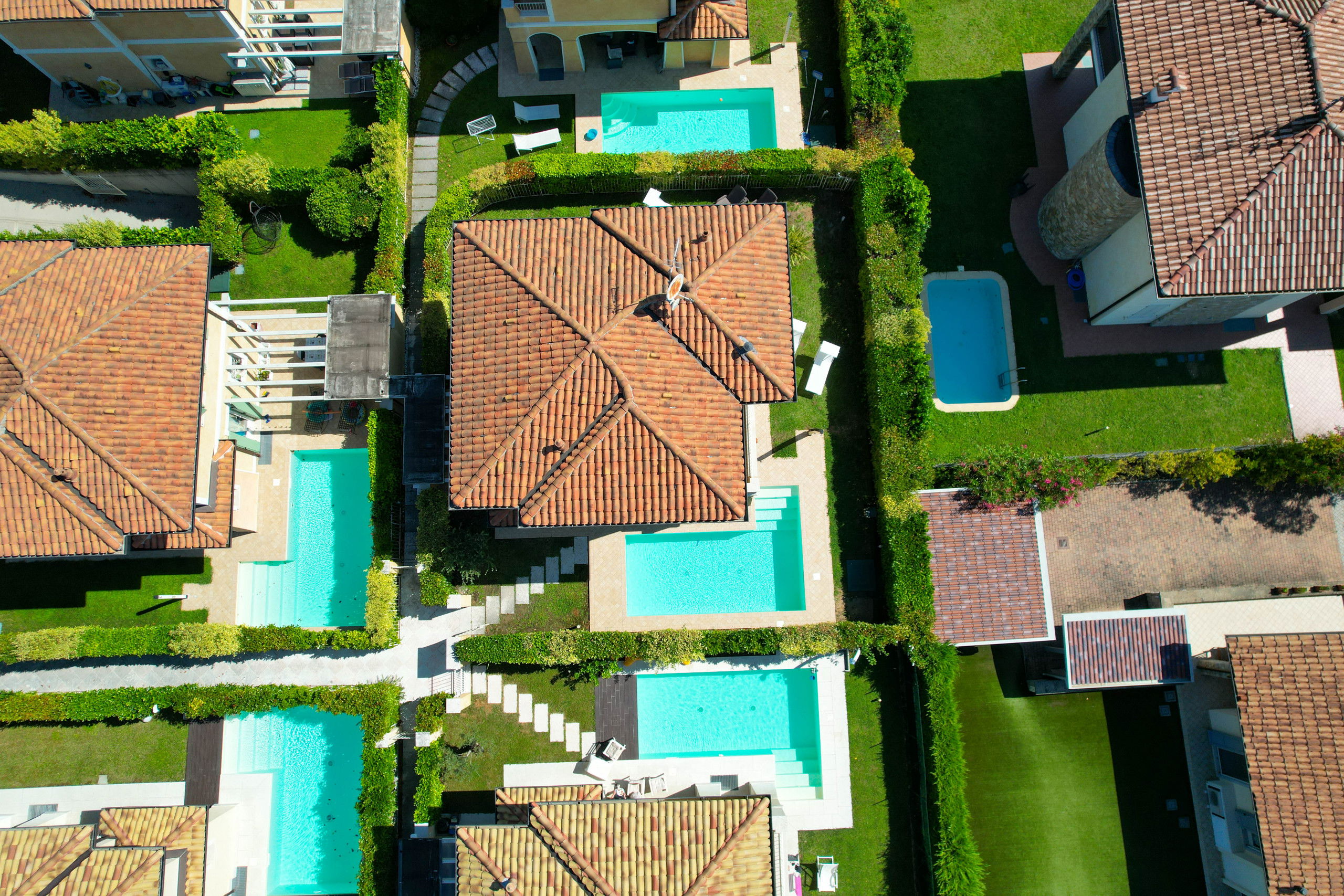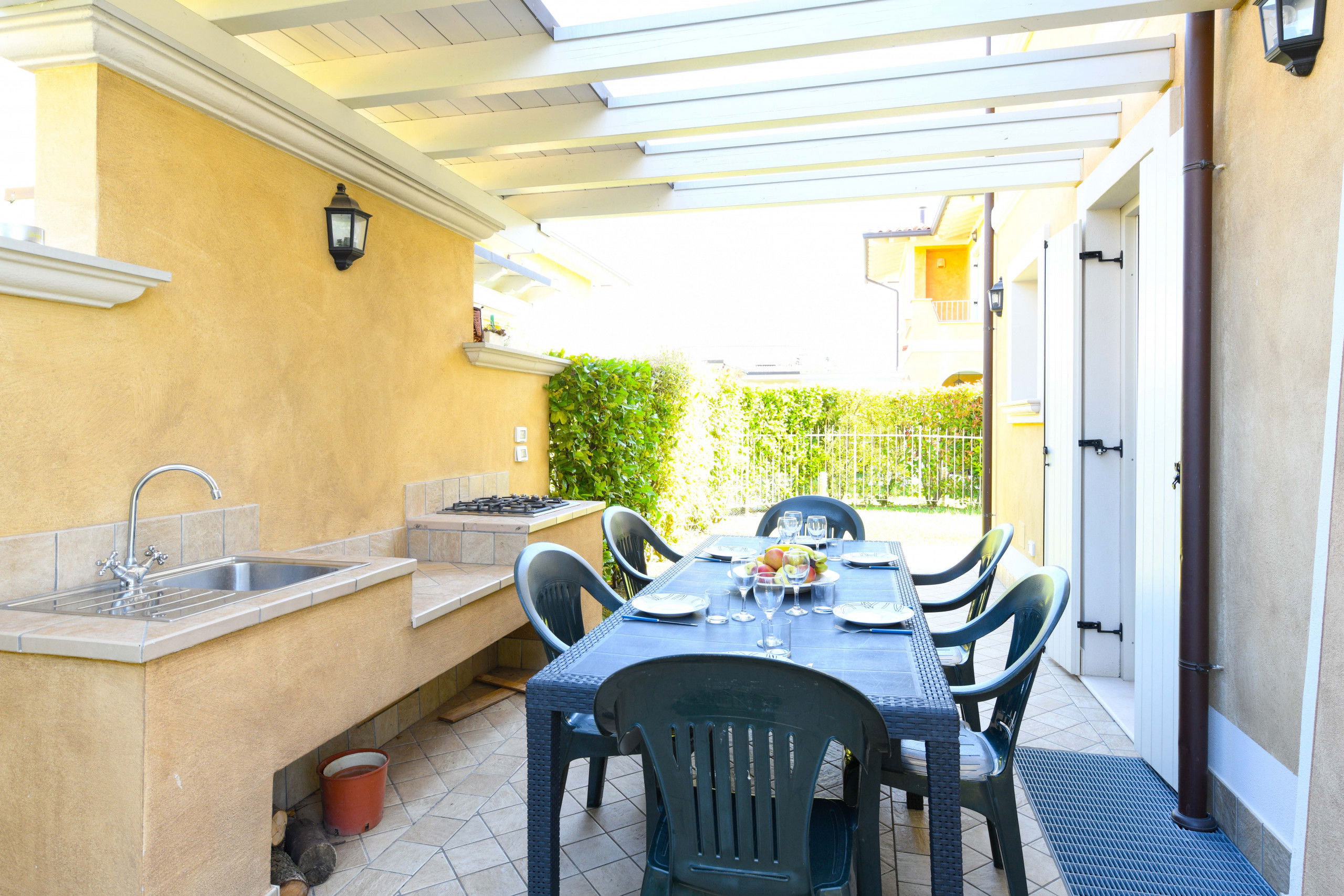 Das Anwesen ist von einem großen privaten Außenbereich umgeben, der mit Tisch, Sonnenliegen, Außenküche und Sofas am Pool ausgestattet ist.