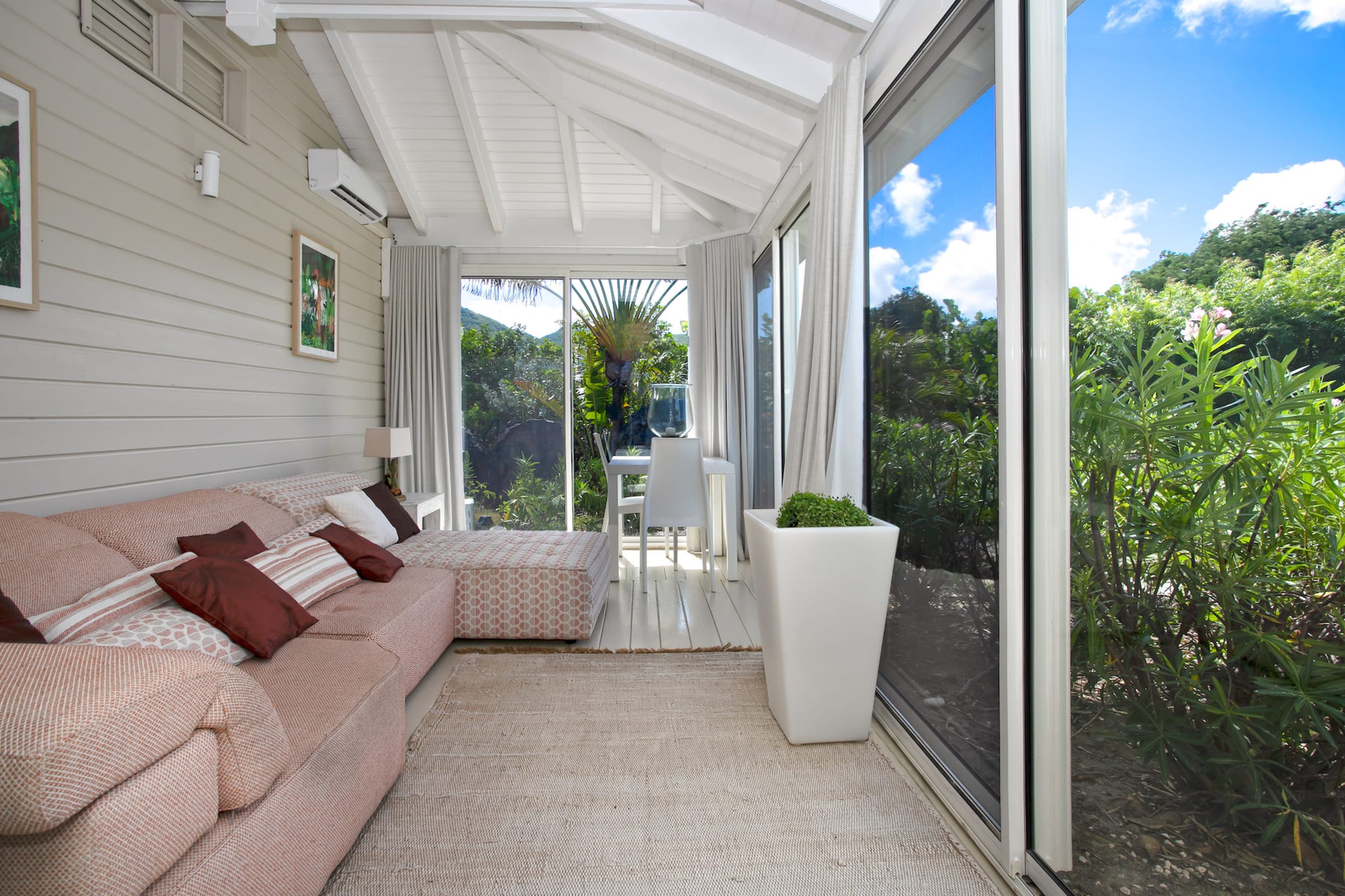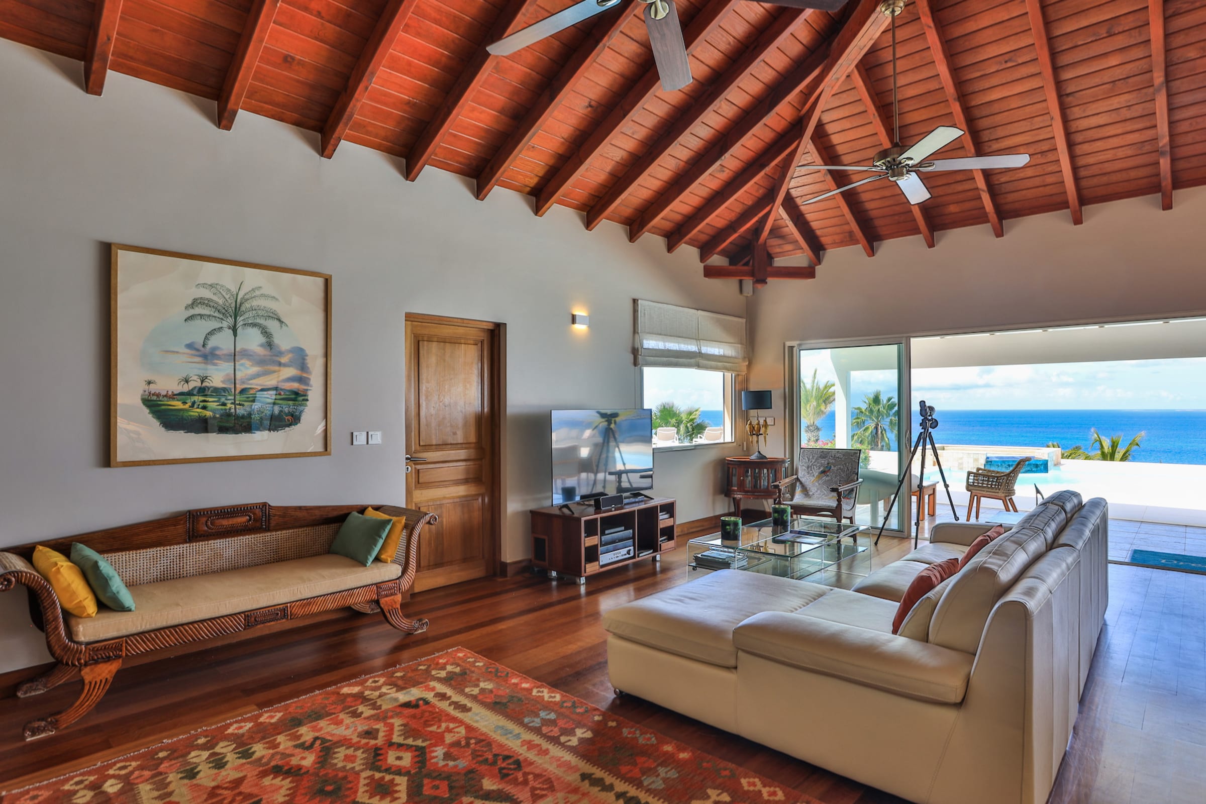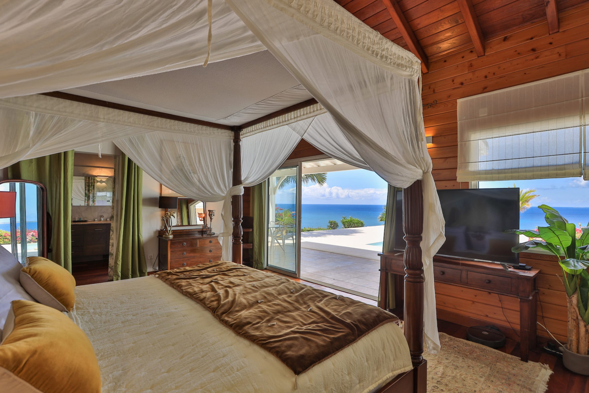 Die großzügige Terrasse, geschmückt mit Palmen und tropischen Blumen, verfügt über zwei beheizte Pools und einen Whirlpool und bietet eine perfekte Oase der Entspannung. Drei der Schlafzimmer bieten einen atemberaubenden Blick auf das Karibische Meer und direkten Zugang zum Pooldeck, sodass Sie die Schönheit der Umgebung jederzeit genießen können. Das fünfte Schlafzimmer, unterhalb des Hauses gelegen und über einen Weg rund um das Haus erreichbar, bietet zusätzliche Privatsphäre für einen ruhigen Aufenthalt. Dieses einzigartige Zimmer ermöglicht es Ihnen, Ihren Urlaub mit atemberaubendem Meerblick und kleiner privater Terrasse, ideal für Momente der Entspannung und Besinnung, in vollen Zügen zu genießen.
