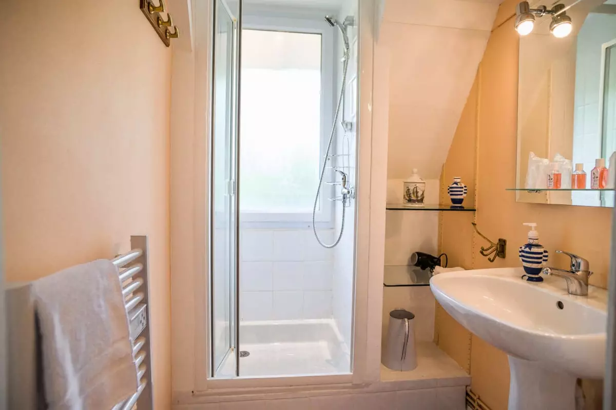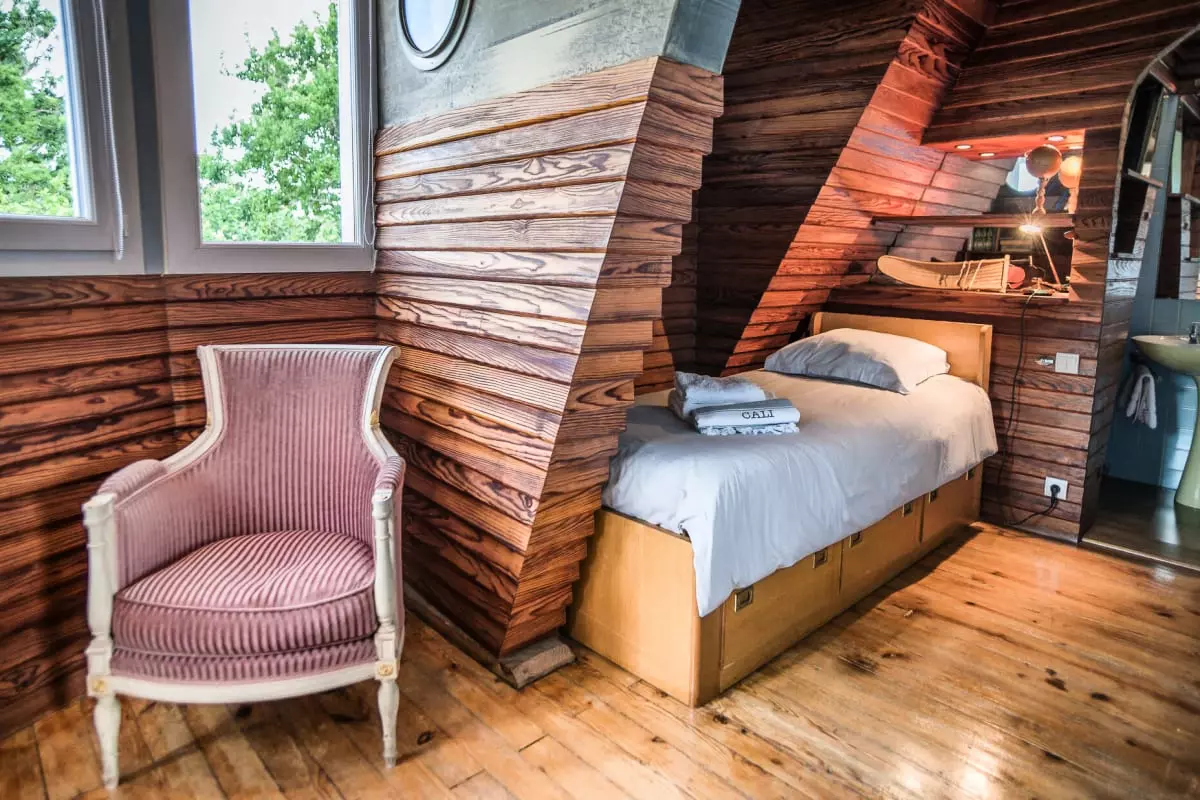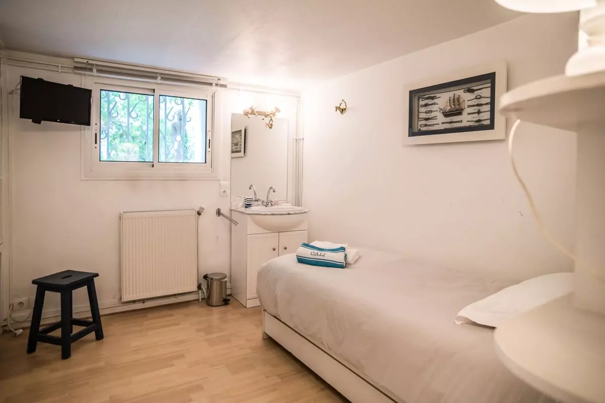 - ein „Bootskabinen“-Zimmer; (90cm Bett) und Waschbecken.