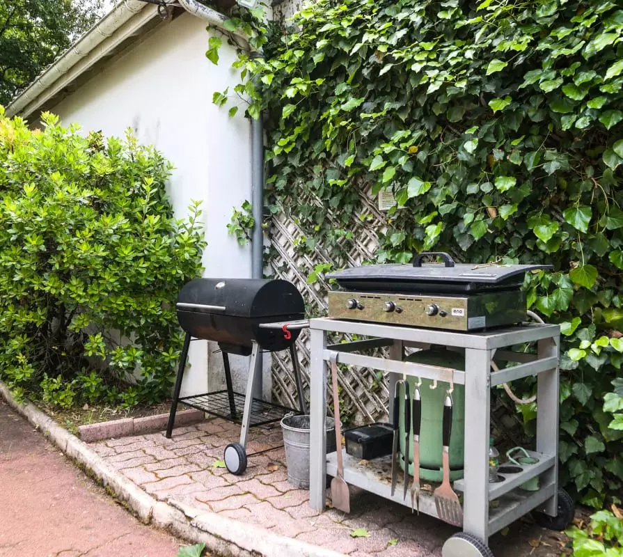 Daneben eine Gasgrillplatte und ein Grill.