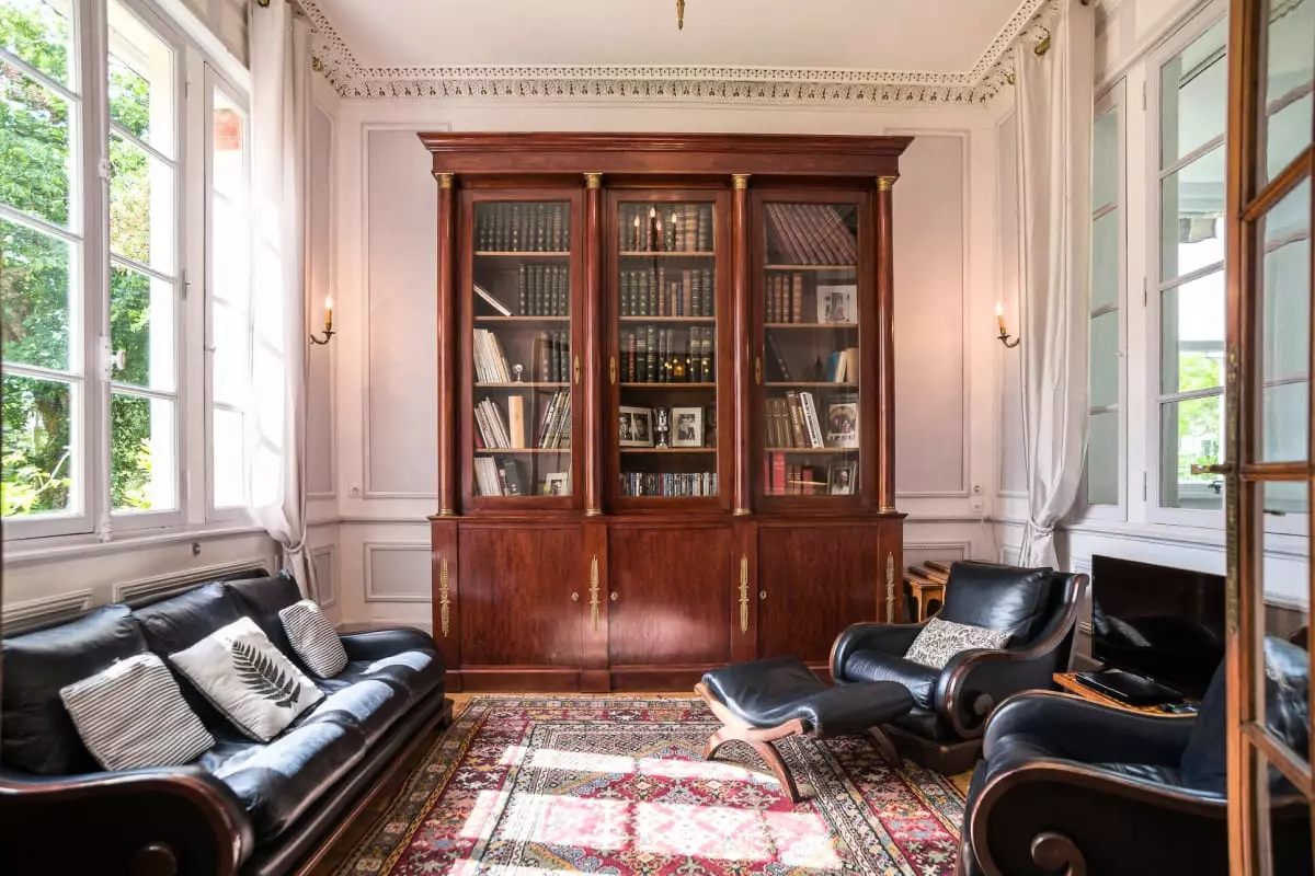 Das kleine Wohnzimmer mit Bibliothek bietet einen freien Blick auf den Garten und die Veranda.