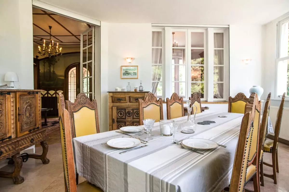Auf der Veranda, die im Winter dank ihrer Erkerfenster warm und hell ist und im Sommer durch Jalousien geschützt wird, können an ihrem langen Tisch Familienessen stattfinden.