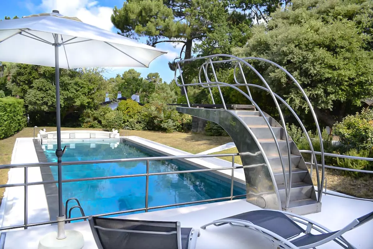 Es verfügt über einen Garten von über 2200 m2 und im Sommer über einen außergewöhnlichen, sicheren Edelstahlpool mit sehr großen Abmessungen – 21 m x 7 m –, der mit einem 3 m hohen Sprungbrett ausgestattet ist (Tiefe von 3,5 m unter dem Sprungbrett). Der Swimmingpool ist vom 12.07. bis 20.09. bei günstigen Wetterbedingungen geöffnet.
