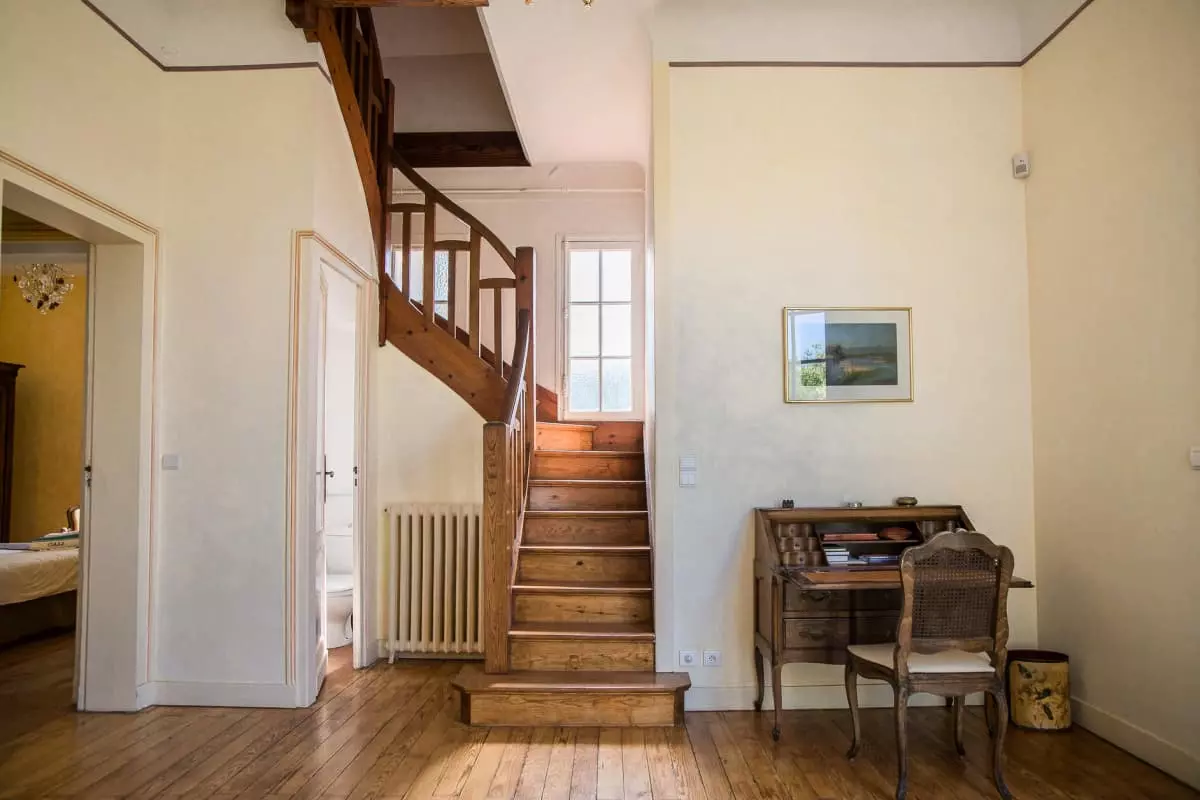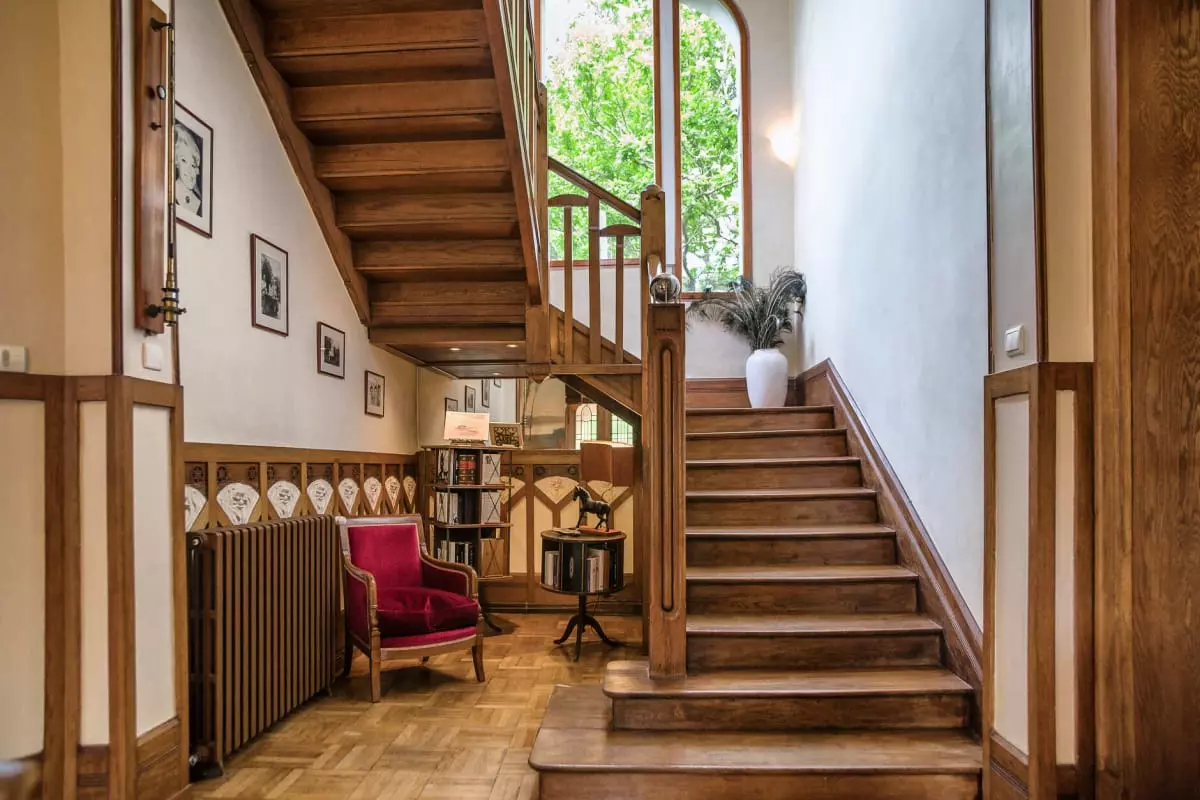 Über eine breite Holztreppe gelangt man in die Diele im 1. Obergeschoss.