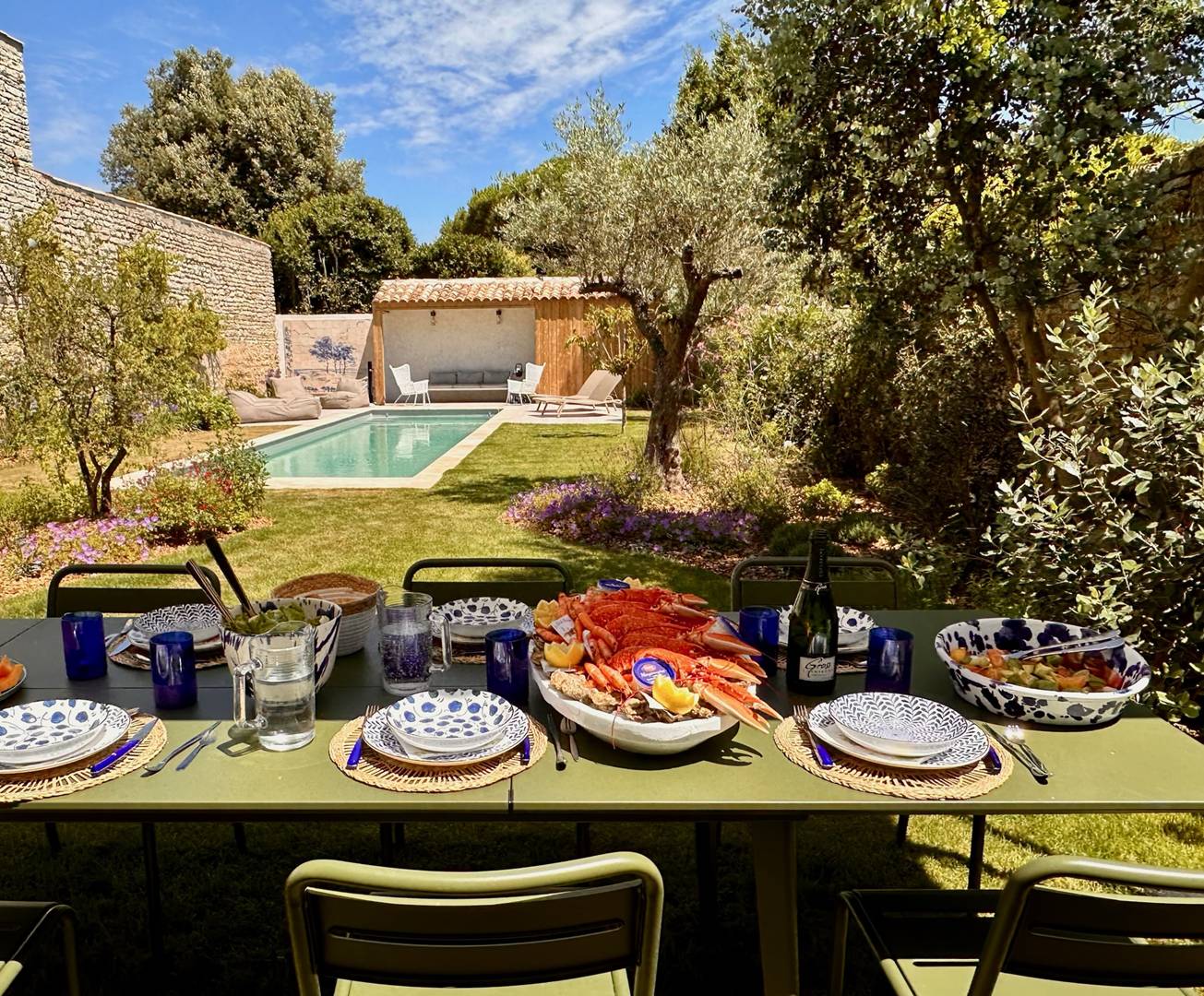 * Essen im Freien: Esstisch für 8 bis 14 Sitzplätze im Garten, der durch einen Sonnenschirm geschützt werden kann + 4 Barhocker vor der Sommerküche