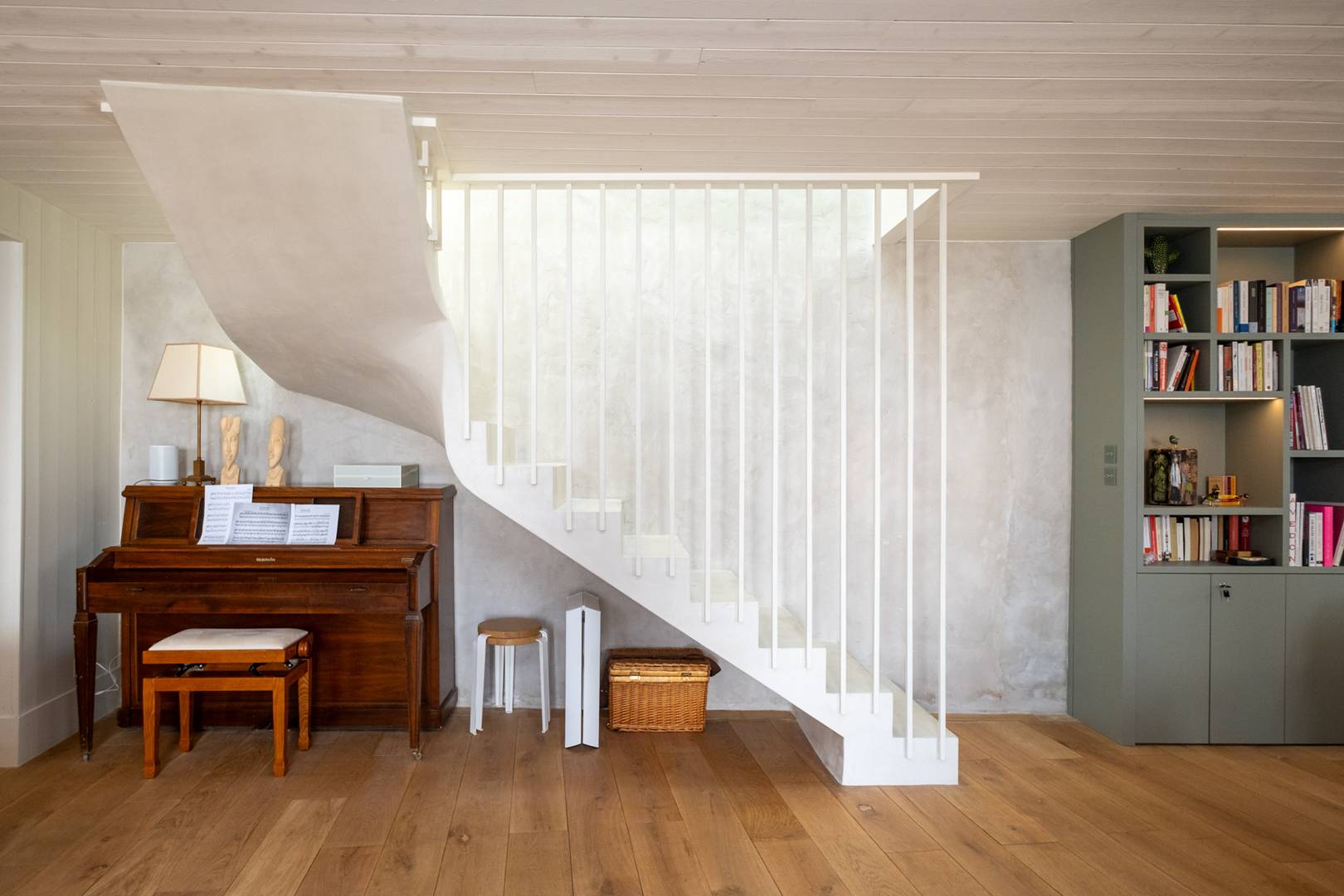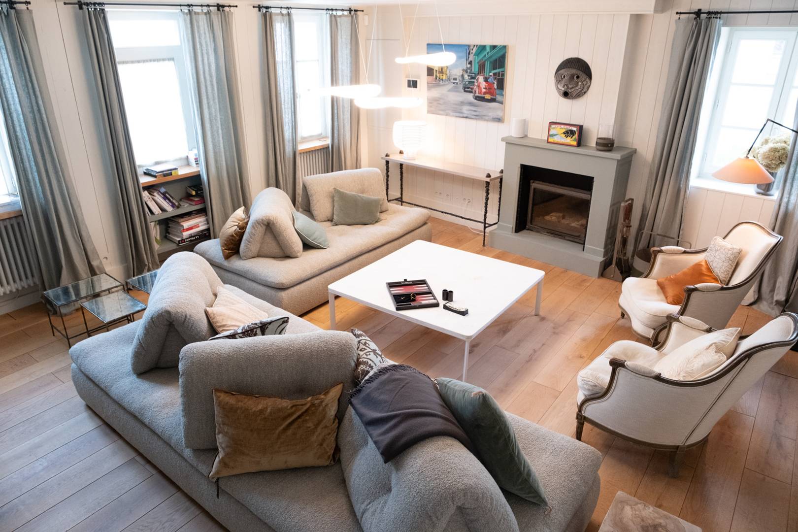 * Eine Bibliothekslounge mit Kamin und Klavier im „Grande“-Haus