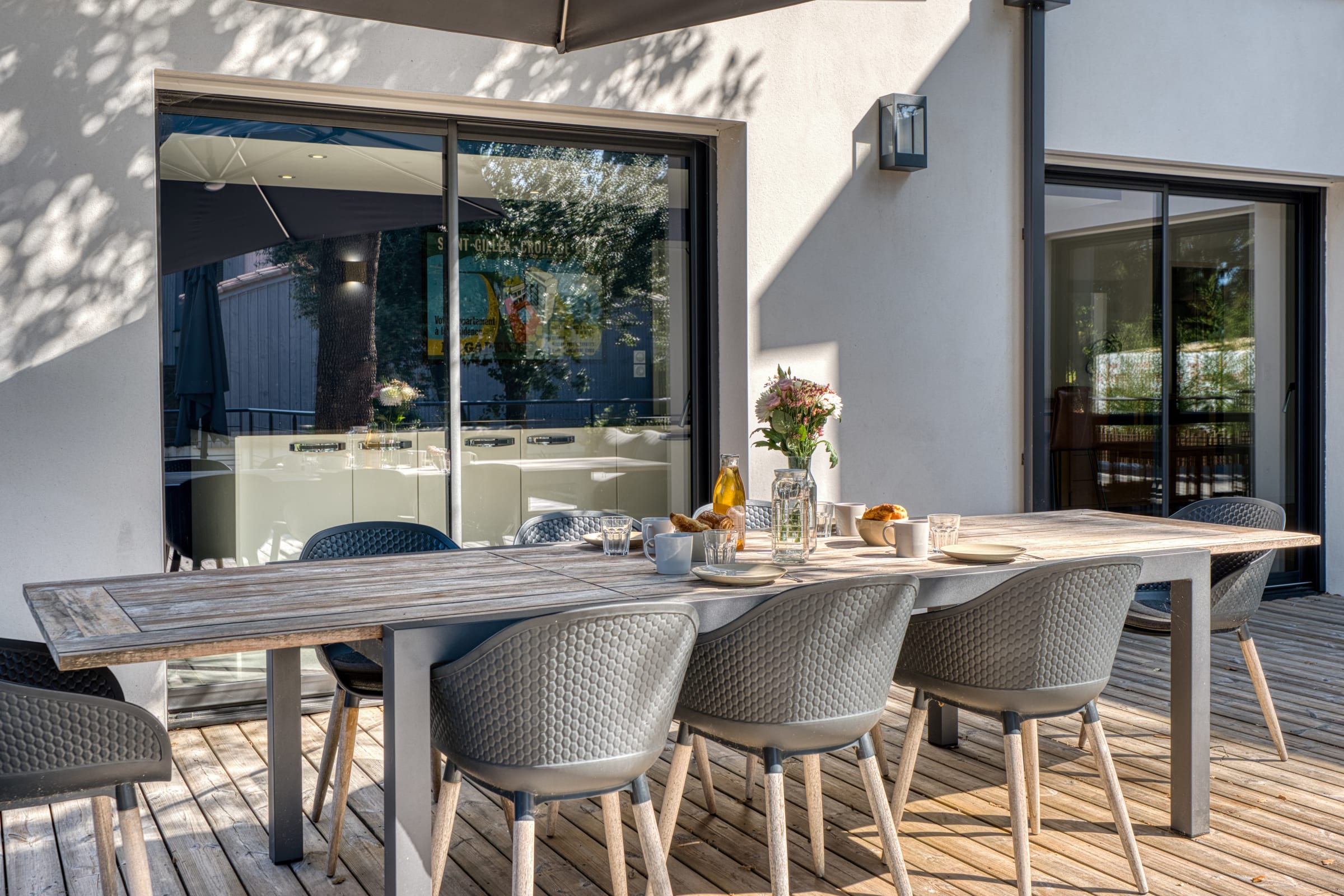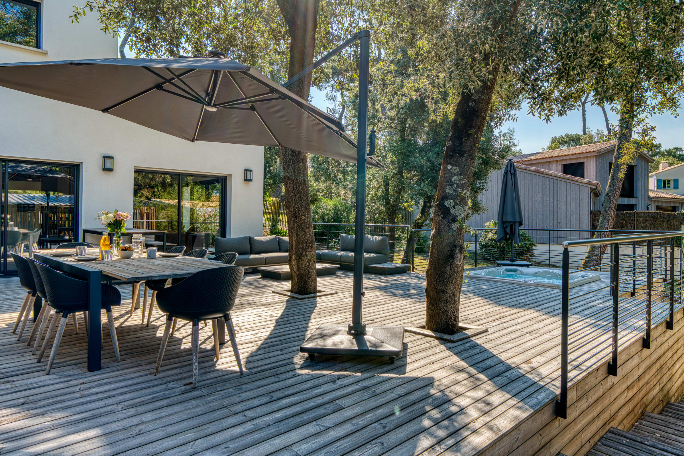Der Außenbereich der Villa wurde als ein wahrer Kokon der Privatsphäre gestaltet, abgetrennt von der Welt. Die große Terrasse lädt Sie ein, draußen zu leben: Sie finden dort einen gemütlichen Essbereich, eine elektrische Plancha für Ihre Sommergrillfeste sowie eine komplette Gartenlounge mit Liegestühlen. Für absolute Entspannung erwartet Sie ein luxuriöser privater Außen-Whirlpool für lange Momente der Entspannung unter den Pinien.