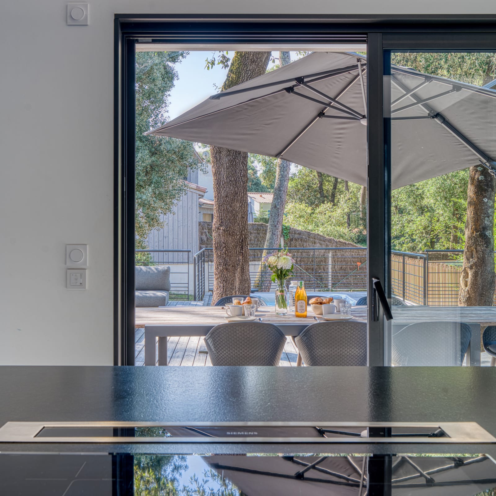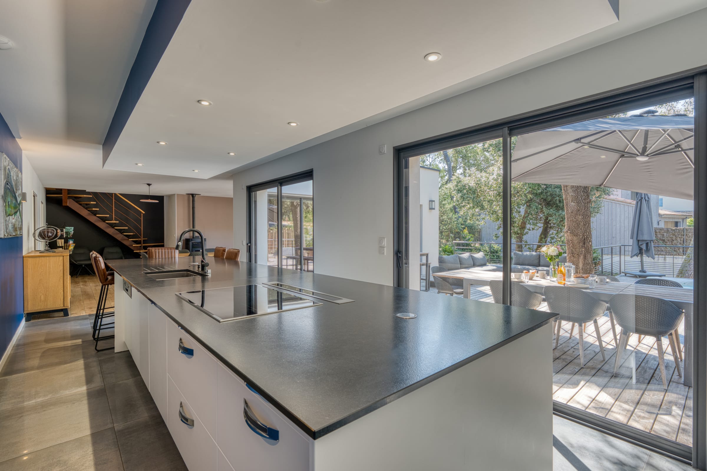 Das Herz der Villa öffnet sich zu einem besonders hellen und gemütlichen Wohnbereich, der für Geselligkeit konzipiert ist. Er beherbergt ein gemütliches Wohnzimmer mit TV-Bereich und Pelletofen, der angenehme Abende während Ihrer Nebensaison-Aufenthalte verspricht. Darüber hinaus entdecken Sie eine schöne, amerikanische Küche, die vollständig ausgestattet ist (amerikanischer Kühlschrank, Gefrierschrank, Induktionskochfeld, Backofen, Mikrowelle, Geschirrspüler, Nespresso- und Filterkaffeemaschinen usw.), sodass Sie Ihre Mahlzeiten leicht zubereiten können, während Sie die Gesellschaft Ihrer Lieben genießen.