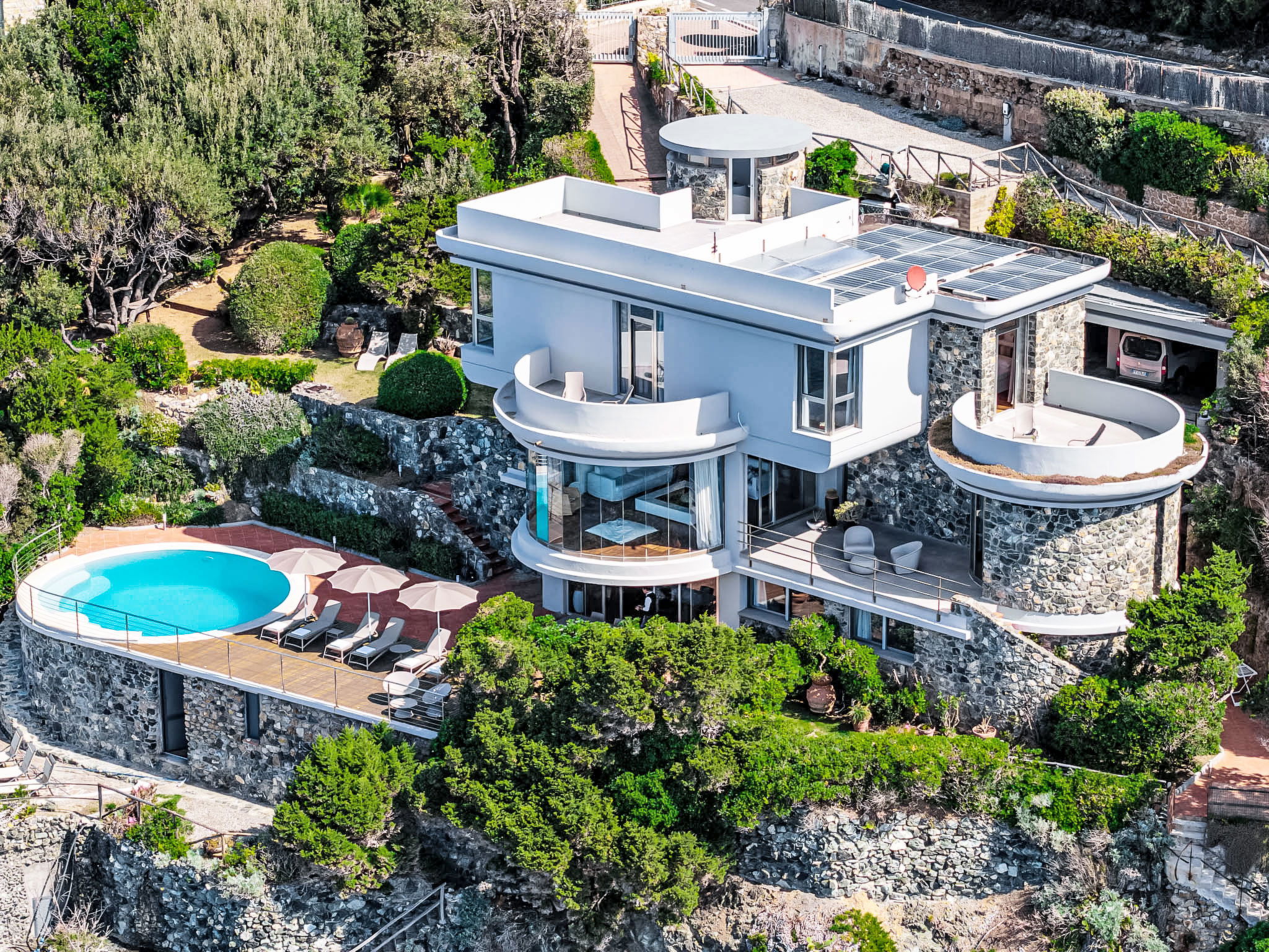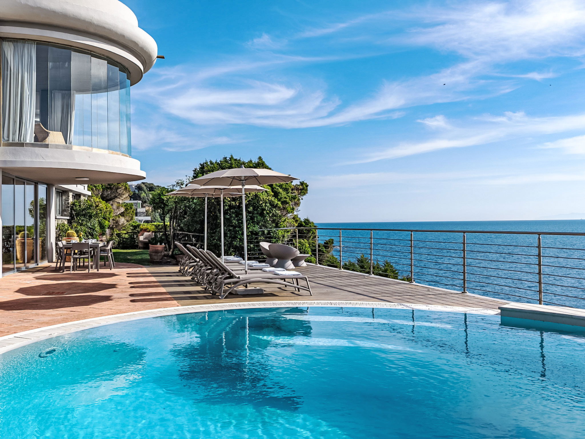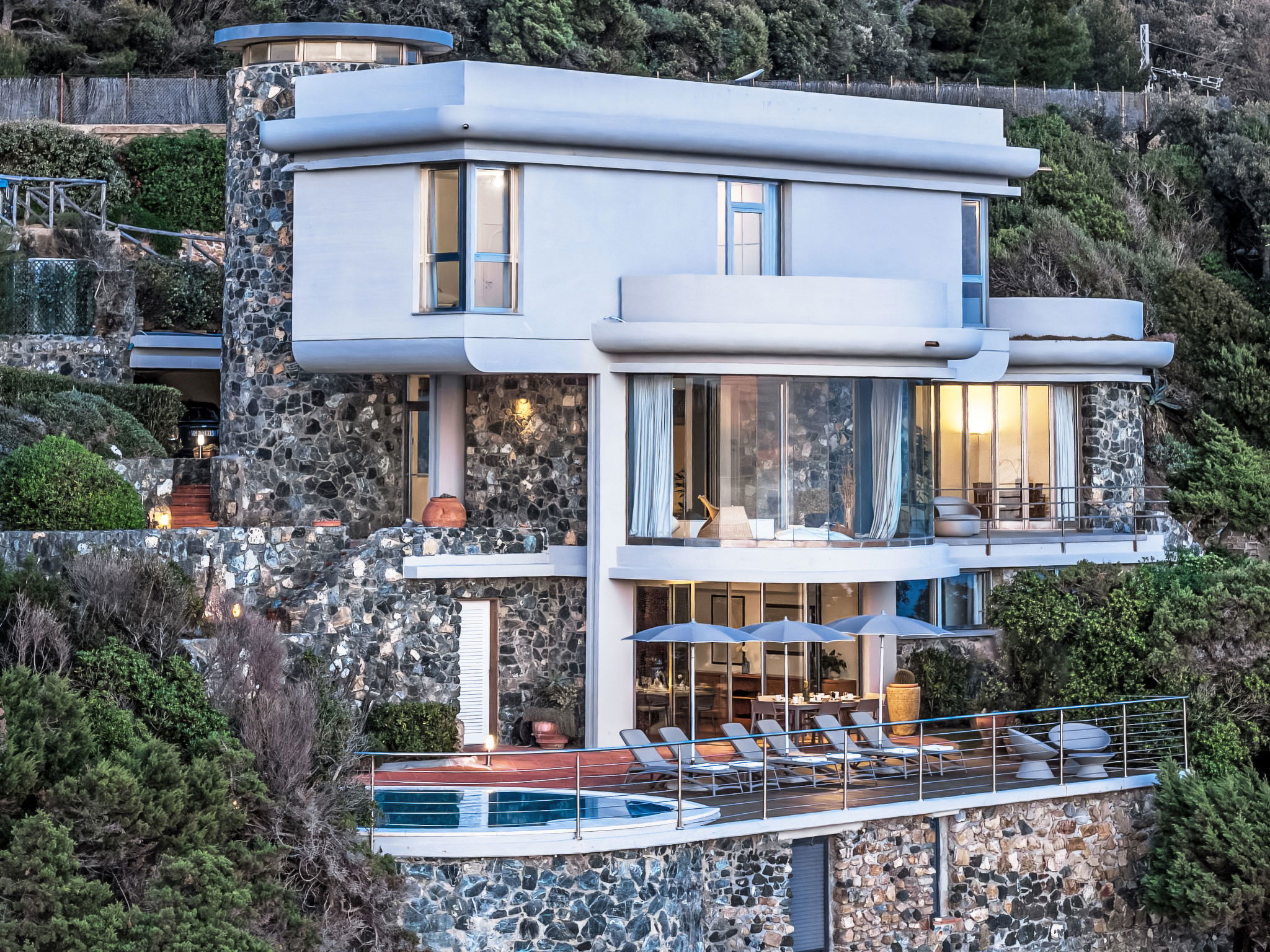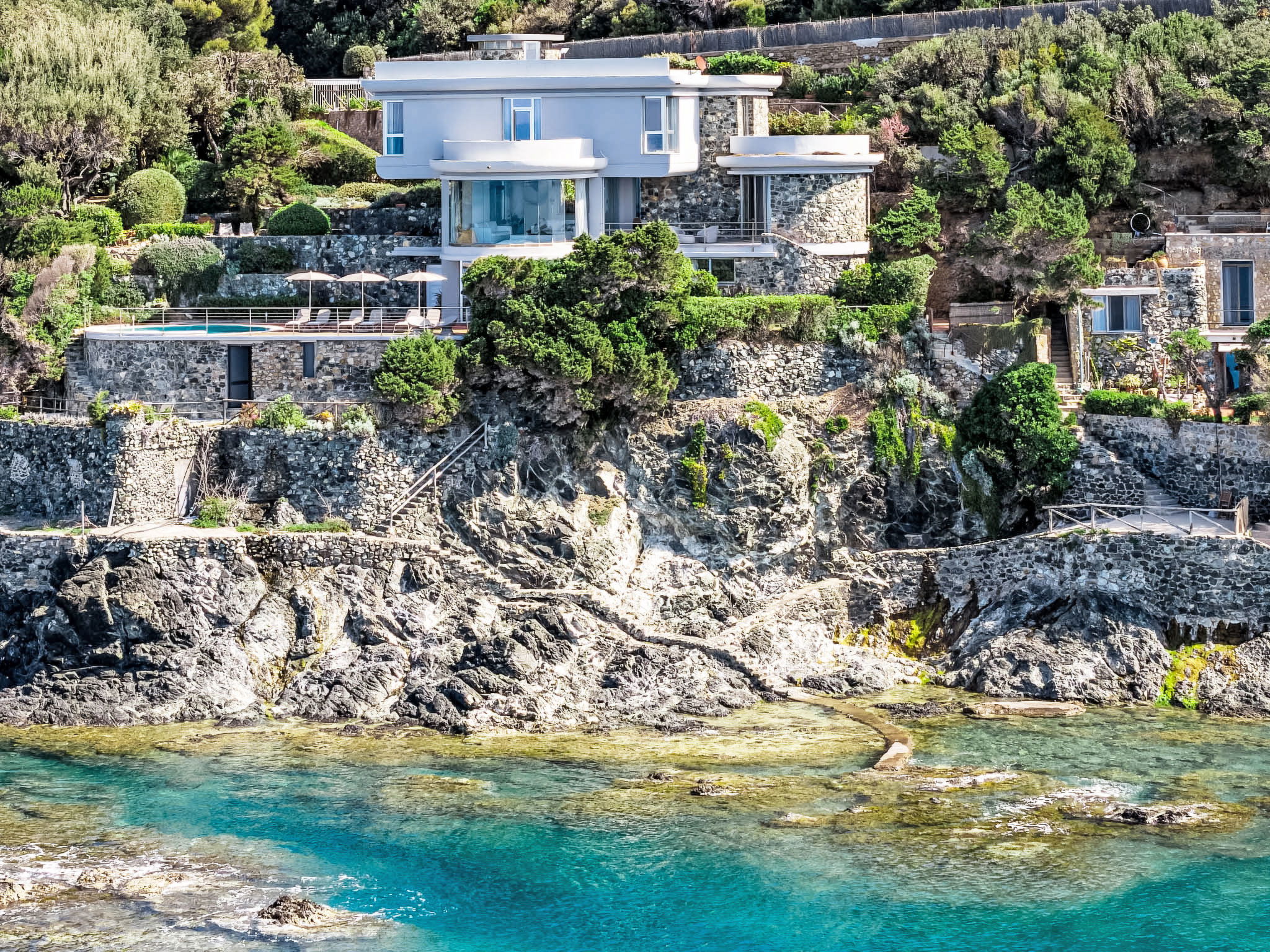 "Vistamare", 8-Zimmer-Haus 450 m2 auf 3 Stockwerken. Renoviert im Jahre 2022, schön und geschmackvoll eingerichtet: 1 Doppelzimmer mit 1 Doppelbett. 1 Zimmer mit 2 Betten (80 cm). Esszimmer mit Esstisch. Ausgang zur Terrasse. Küche (Backofen, Geschirrspüler, 5 Induktionskochplatten, Toaster, Wasserkocher, Mikrowelle, Tiefkühler, elektrische Kaffeemaschine). Ausgang zum Garten. Dusche/WC. Obergeschoss: (Wendeltreppe) Wohnzimmer mit TV, Stereoanlage und DVD. Ausgang zur Terrasse. 2. Obergeschoss: 2 Doppelzimmer. 1 Doppelzimmer. Ausgang zum Balkon. 1 Zimmer mit 2 Betten. Ausgang zum Balkon. 2 Duschen/WC. E-Heizung, Klimaanlage. Parkettboden. Balkon, 3 Terrassen teilweise überdacht. Terrassenmöbel, Abstellkammer. Herrliche Sicht auf das Meer. Zur Verfügung: Waschmaschine, Safe, Bügeleisen, Kinderhochstuhl, Babybett bis 3 Jahre, Haartrockner. Internet (WLAN, gratis). Bitte beachten: Maximal 2 Haustiere/Hunde erlaubt. Feuerlöscher. IT049017B4ZSMZZVZD