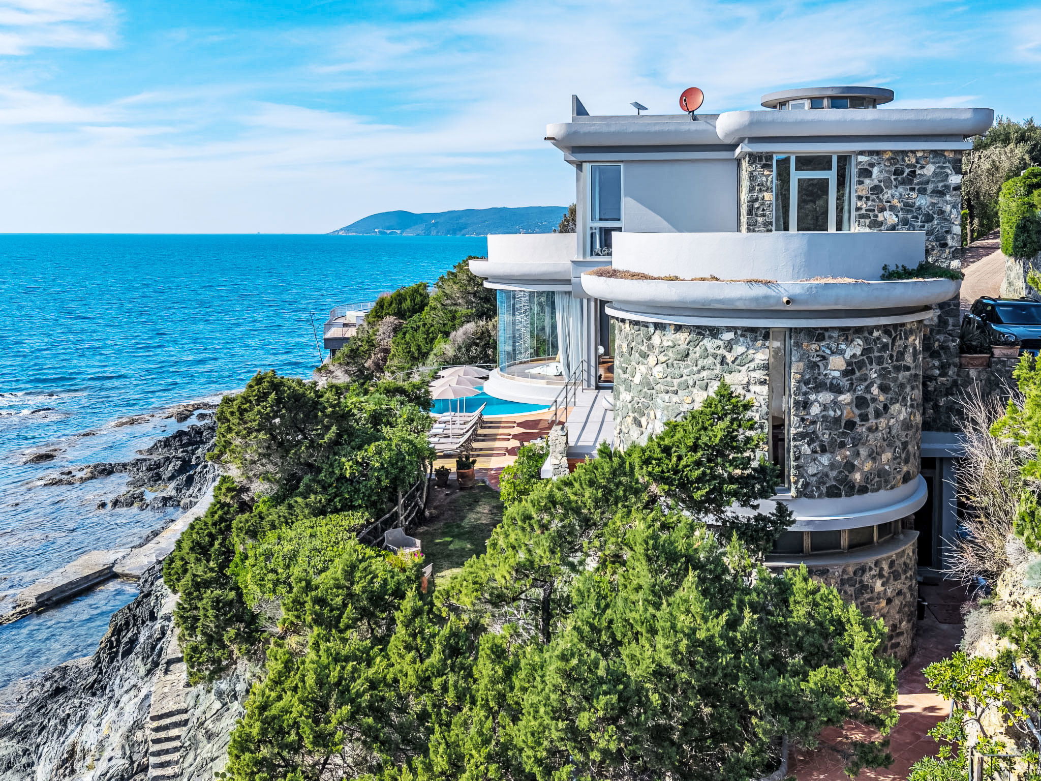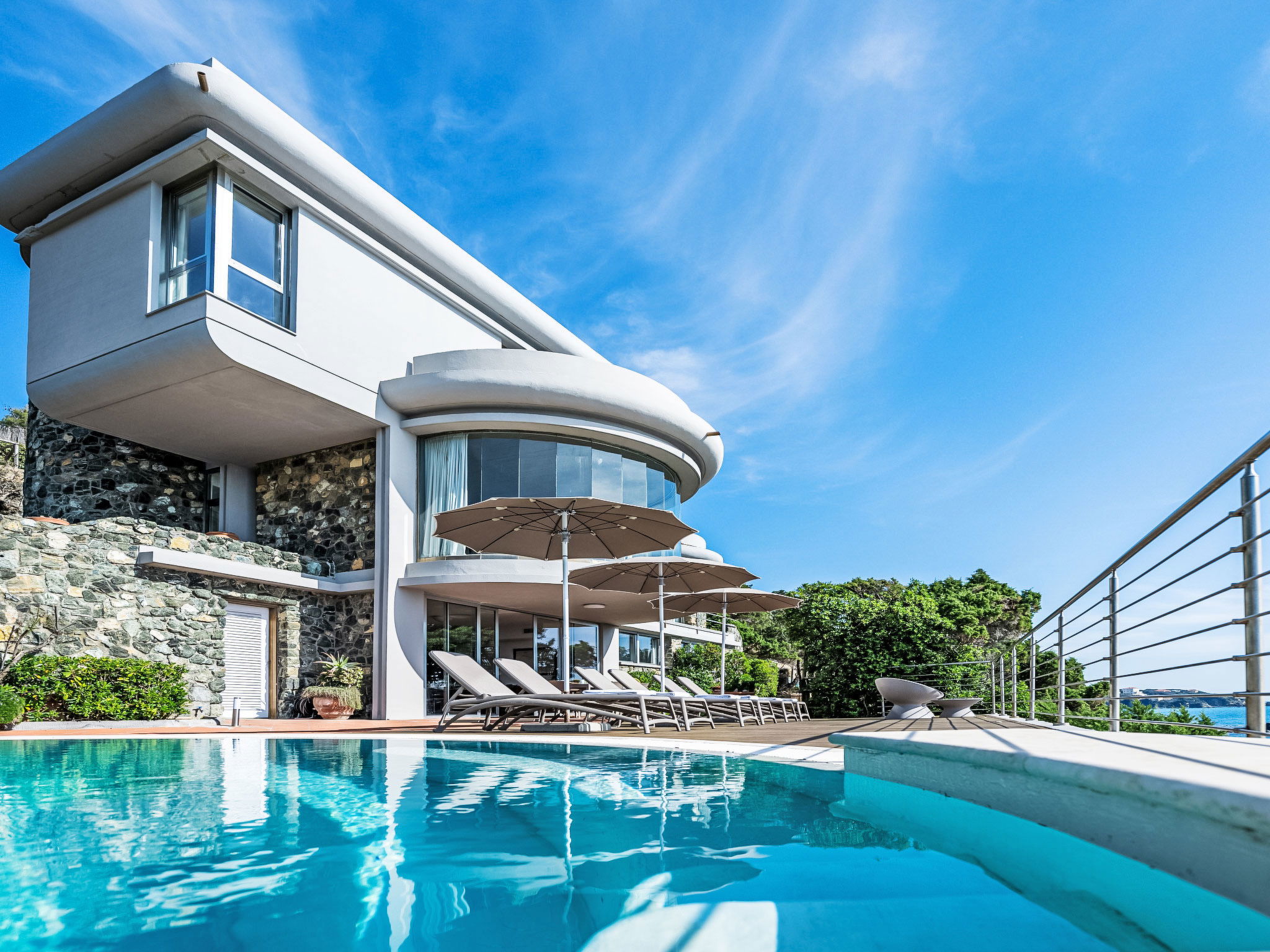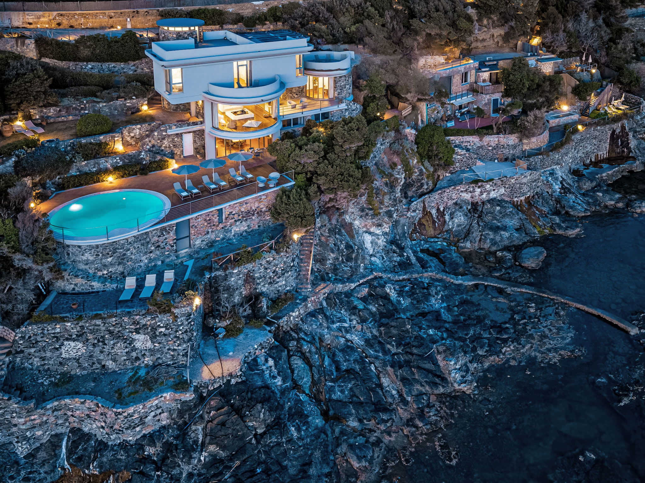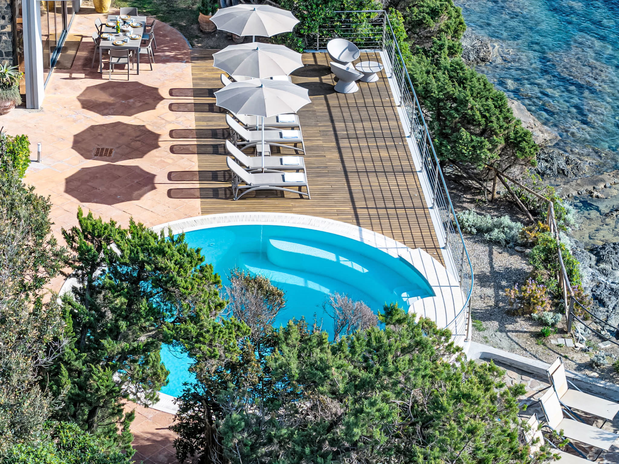 "Vistamare", 8-Zimmer-Haus 450 m2 auf 3 Stockwerken. Renoviert im Jahre 2022, schön und geschmackvoll eingerichtet: 1 Doppelzimmer mit 1 Doppelbett. 1 Zimmer mit 2 Betten (80 cm). Esszimmer mit Esstisch. Ausgang zur Terrasse. Küche (Backofen, Geschirrspüler, 5 Induktionskochplatten, Toaster, Wasserkocher, Mikrowelle, Tiefkühler, elektrische Kaffeemaschine). Ausgang zum Garten. Dusche/WC. Obergeschoss: (Wendeltreppe) Wohnzimmer mit TV, Stereoanlage und DVD. Ausgang zur Terrasse. 2. Obergeschoss: 2 Doppelzimmer. 1 Doppelzimmer. Ausgang zum Balkon. 1 Zimmer mit 2 Betten. Ausgang zum Balkon. 2 Duschen/WC. E-Heizung, Klimaanlage. Parkettboden. Balkon, 3 Terrassen teilweise überdacht. Terrassenmöbel, Abstellkammer. Herrliche Sicht auf das Meer. Zur Verfügung: Waschmaschine, Safe, Bügeleisen, Kinderhochstuhl, Babybett bis 3 Jahre, Haartrockner. Internet (WLAN, gratis). Bitte beachten: Maximal 2 Haustiere/Hunde erlaubt. Feuerlöscher. IT049017B4ZSMZZVZD