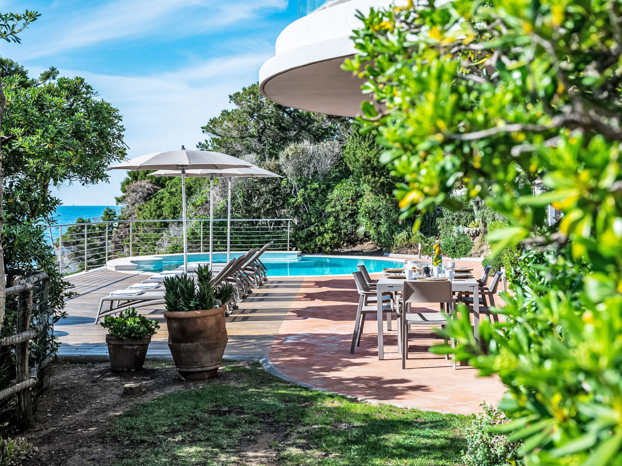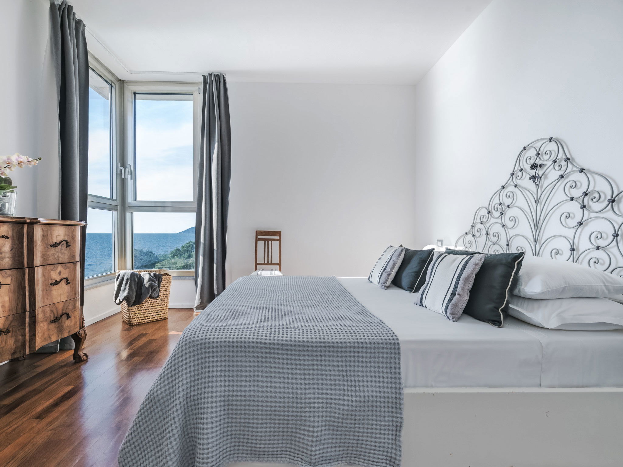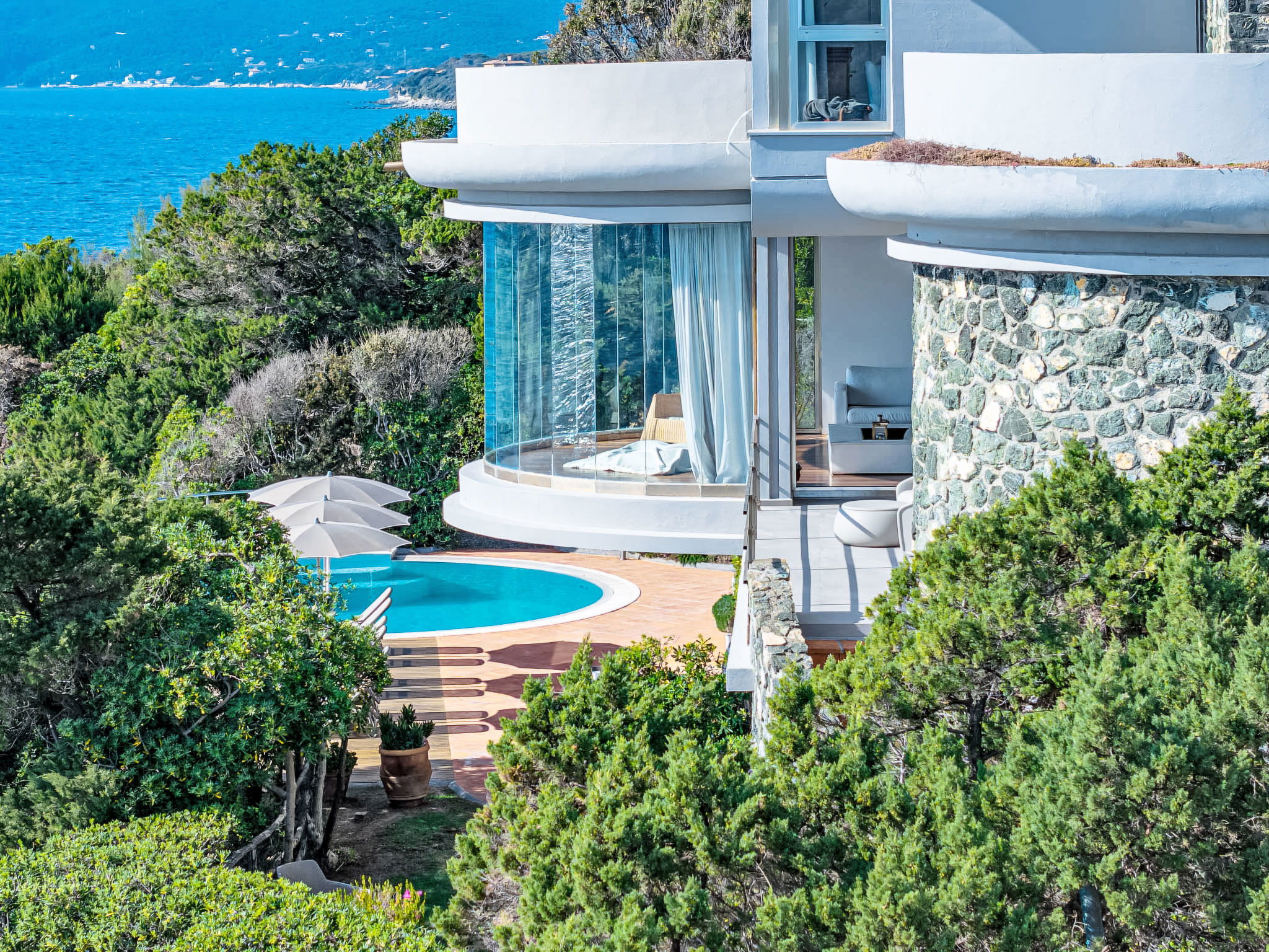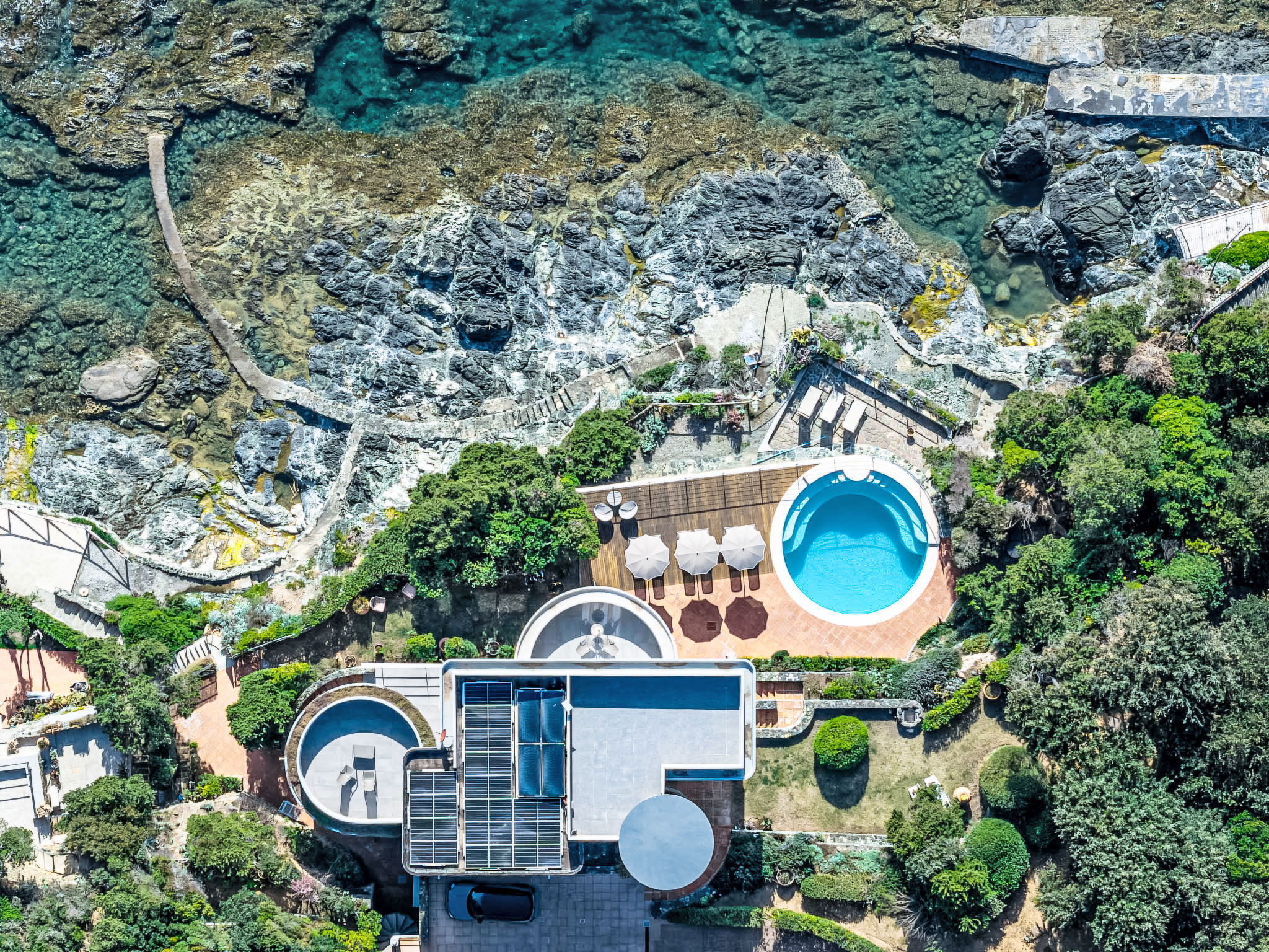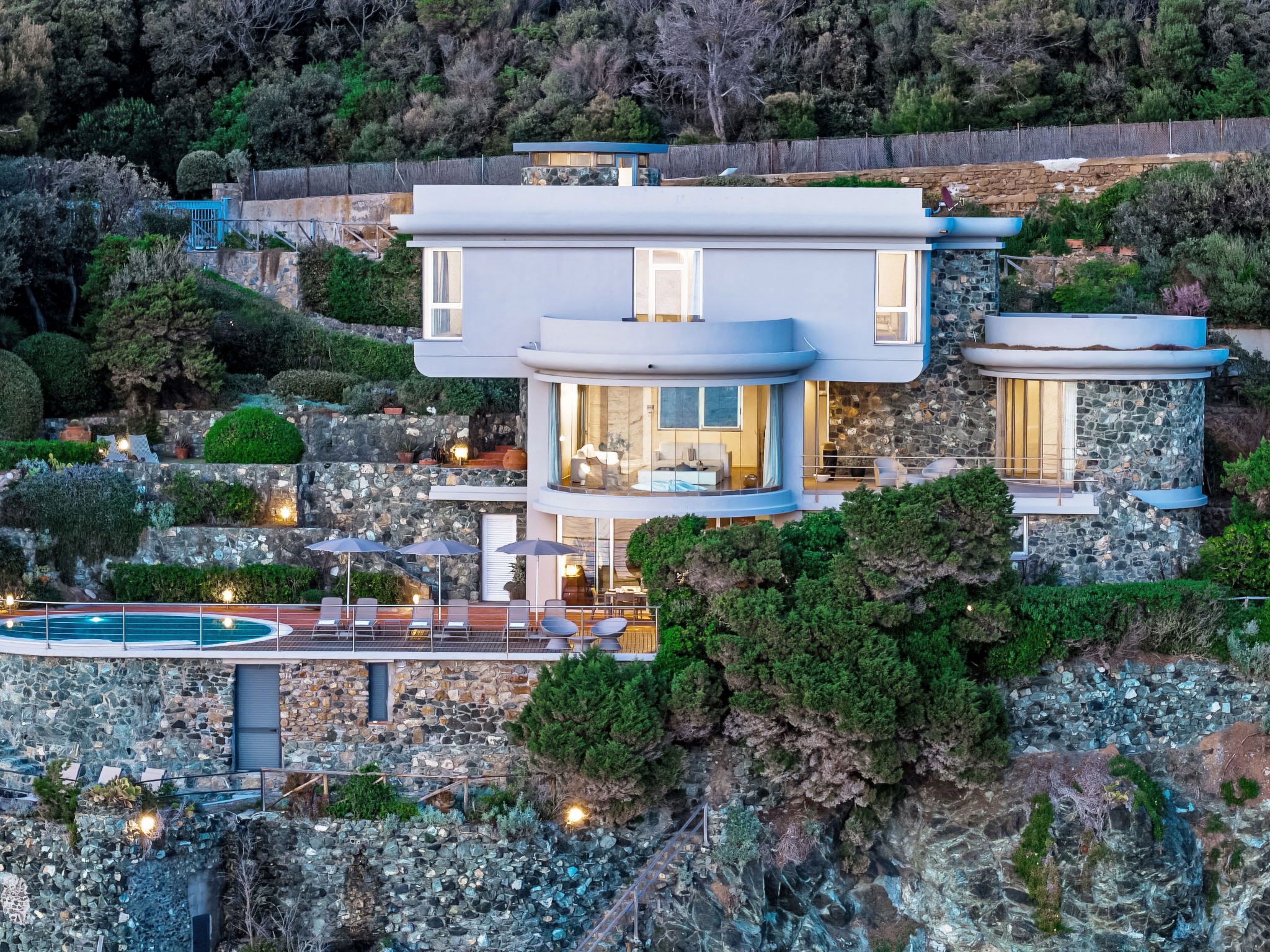 "Vistamare", 8-Zimmer-Haus 450 m2 auf 3 Stockwerken. Renoviert im Jahre 2022, schön und geschmackvoll eingerichtet: 1 Doppelzimmer mit 1 Doppelbett. 1 Zimmer mit 2 Betten (80 cm). Esszimmer mit Esstisch. Ausgang zur Terrasse. Küche (Backofen, Geschirrspüler, 5 Induktionskochplatten, Toaster, Wasserkocher, Mikrowelle, Tiefkühler, elektrische Kaffeemaschine). Ausgang zum Garten. Dusche/WC. Obergeschoss: (Wendeltreppe) Wohnzimmer mit TV, Stereoanlage und DVD. Ausgang zur Terrasse. 2. Obergeschoss: 2 Doppelzimmer. 1 Doppelzimmer. Ausgang zum Balkon. 1 Zimmer mit 2 Betten. Ausgang zum Balkon. 2 Duschen/WC. E-Heizung, Klimaanlage. Parkettboden. Balkon, 3 Terrassen teilweise überdacht. Terrassenmöbel, Abstellkammer. Herrliche Sicht auf das Meer. Zur Verfügung: Waschmaschine, Safe, Bügeleisen, Kinderhochstuhl, Babybett bis 3 Jahre, Haartrockner. Internet (WLAN, gratis). Bitte beachten: Maximal 2 Haustiere/Hunde erlaubt. Feuerlöscher. IT049017B4ZSMZZVZD
