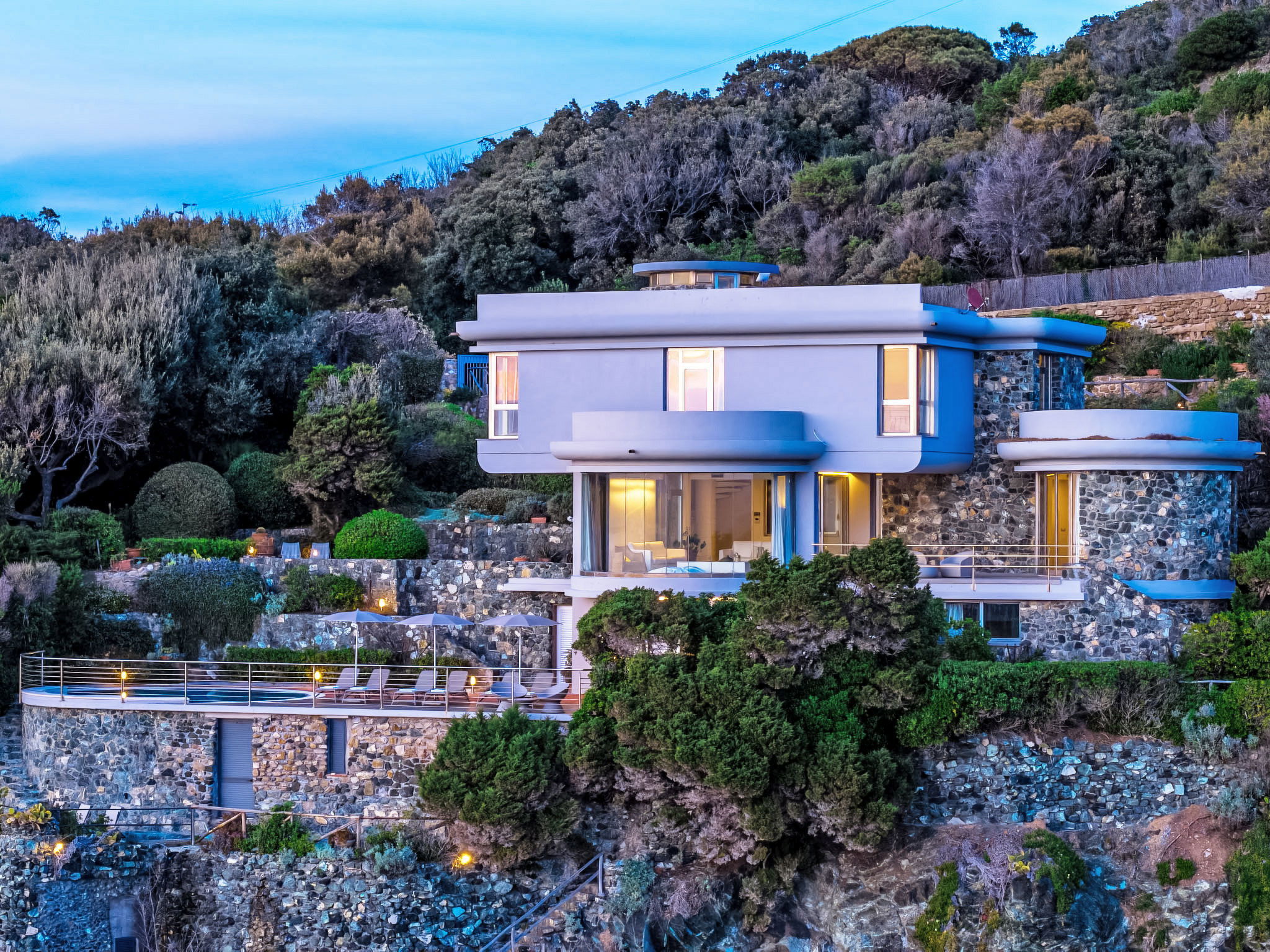 Moderne Villa "Vistamare", auf 3 Stockwerken, renoviert im Jahre 2022, umgeben von Bäumen. 1.5 km vom Zentrum von Castiglioncello, 13 km vom Zentrum von Cecina, 20 km vom Zentrum von Livorno, am Hang, 30 m vom Meer, direkter Zugang zum Strand. Zur Alleinbenutzung: Grundstück 900 m2 (eingezäunt), terrassierter Garten mit Pflanzen und Bäumen, Schwimmbad (7 m Durchmesser, saisonale Verfügbarkeit: 03.Apr. - 30.Okt.) mit Meerwasser. Dusche/WC im Poolbereich, Aussendusche, Grill, Badeplatz. Treppenweg bis zum Haus. Parkplatz (für 4 Autos, überdacht). Einkaufsgeschäft 1.5 km, Supermarkt 1.5 km, Bäckerei 1.5 km, Bushaltestelle 250 m, Bahnstation "Castiglioncello" 2 km, Sandstrand "Baia del Quercietano" 1.5 km, Felsstrand 30 m. Jacht-Hafen 4 km, Tennis 2 km, Minigolf 2 km. Nahe gelegene Sehenswürdigkeiten: Pisa 40 km, Lucca 65 km, Firenze 110 km. Der Besitzer akzeptiert keine Jugendgruppen.