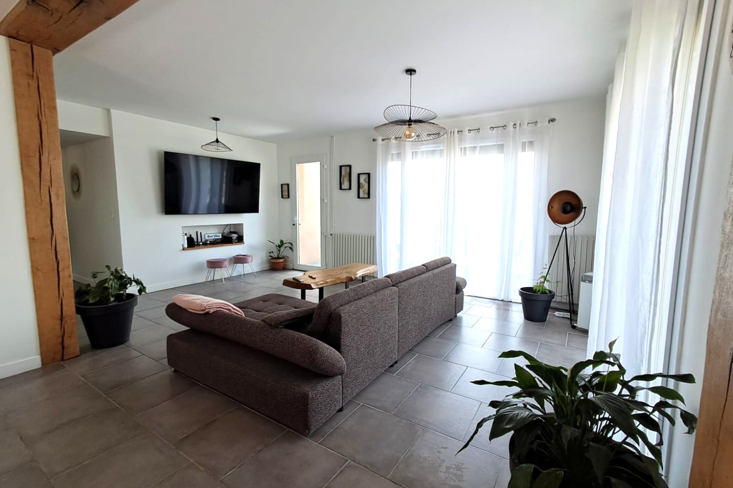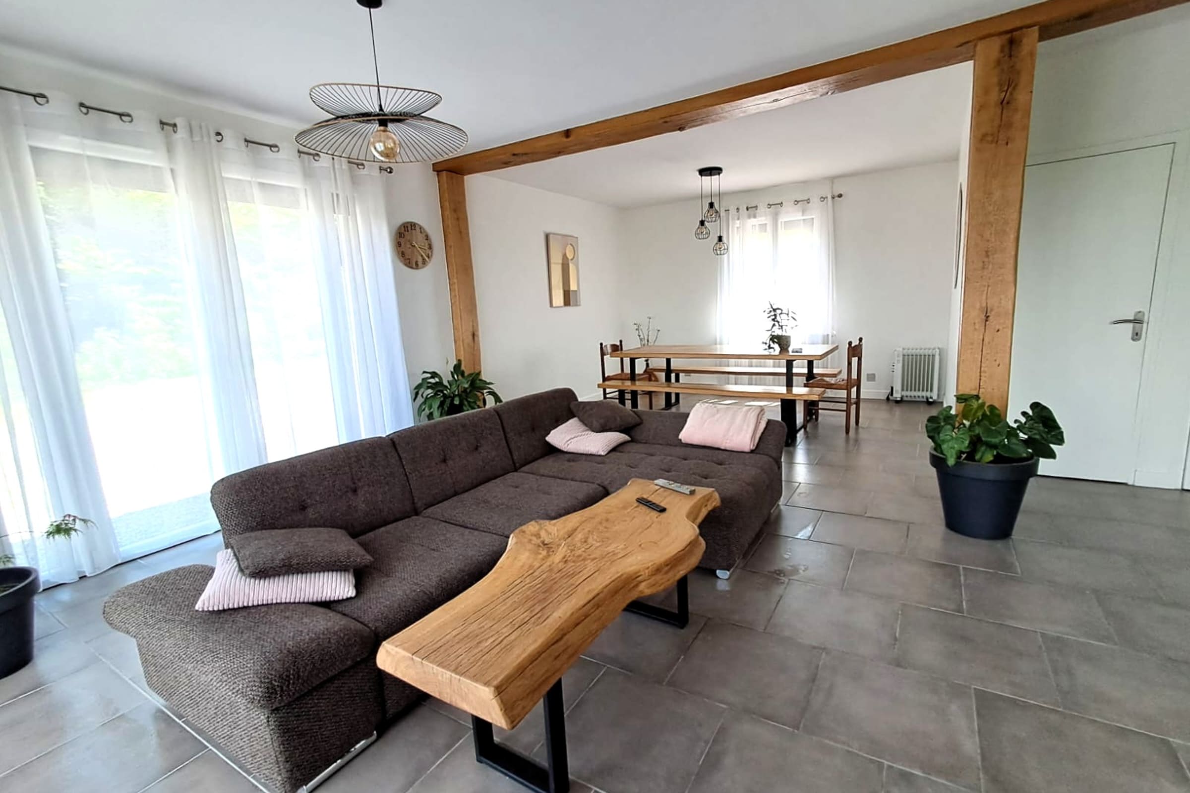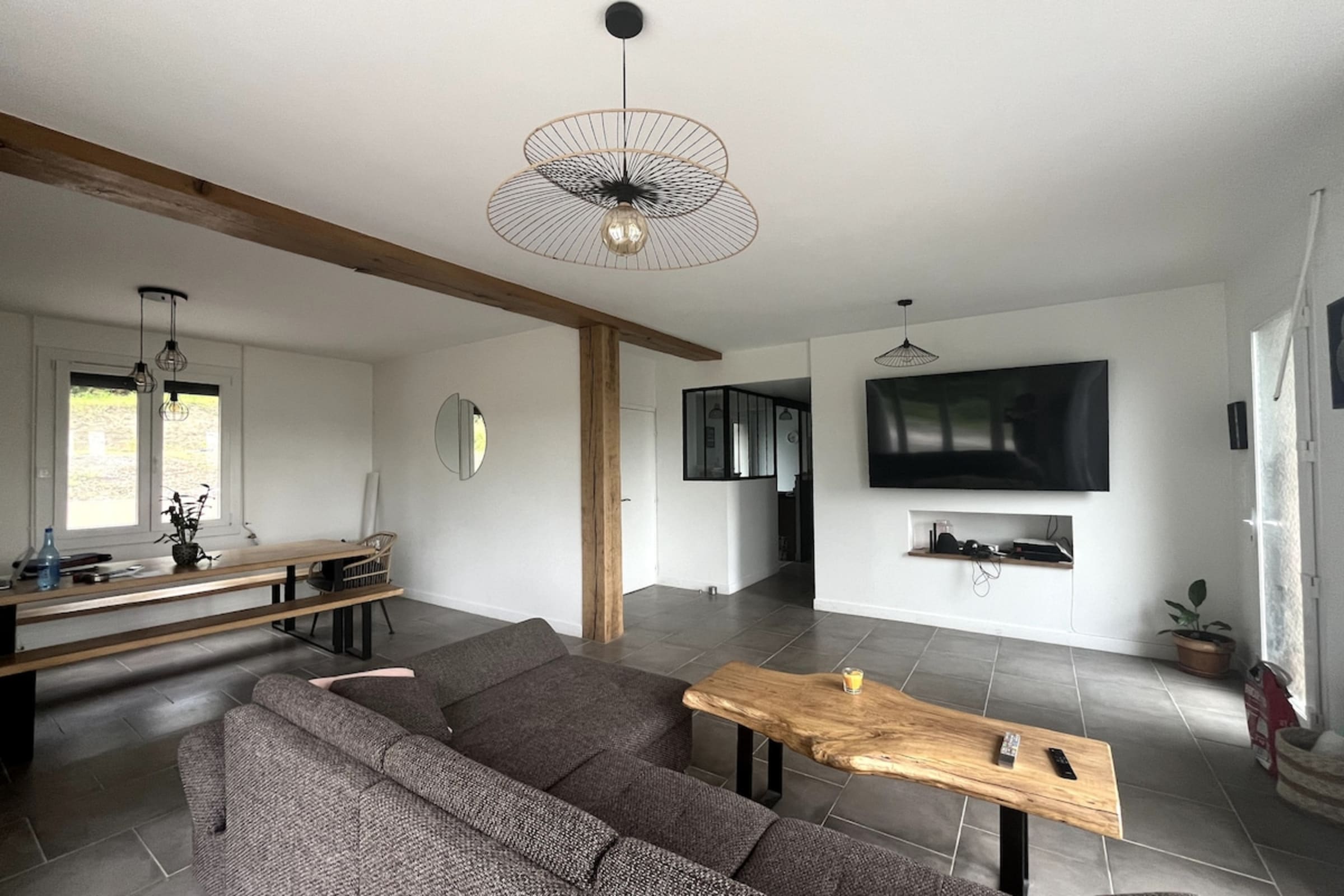 Großes, einladendes Wohnzimmer, perfekt für gemeinsame Mahlzeiten oder Momente der Entspannung.