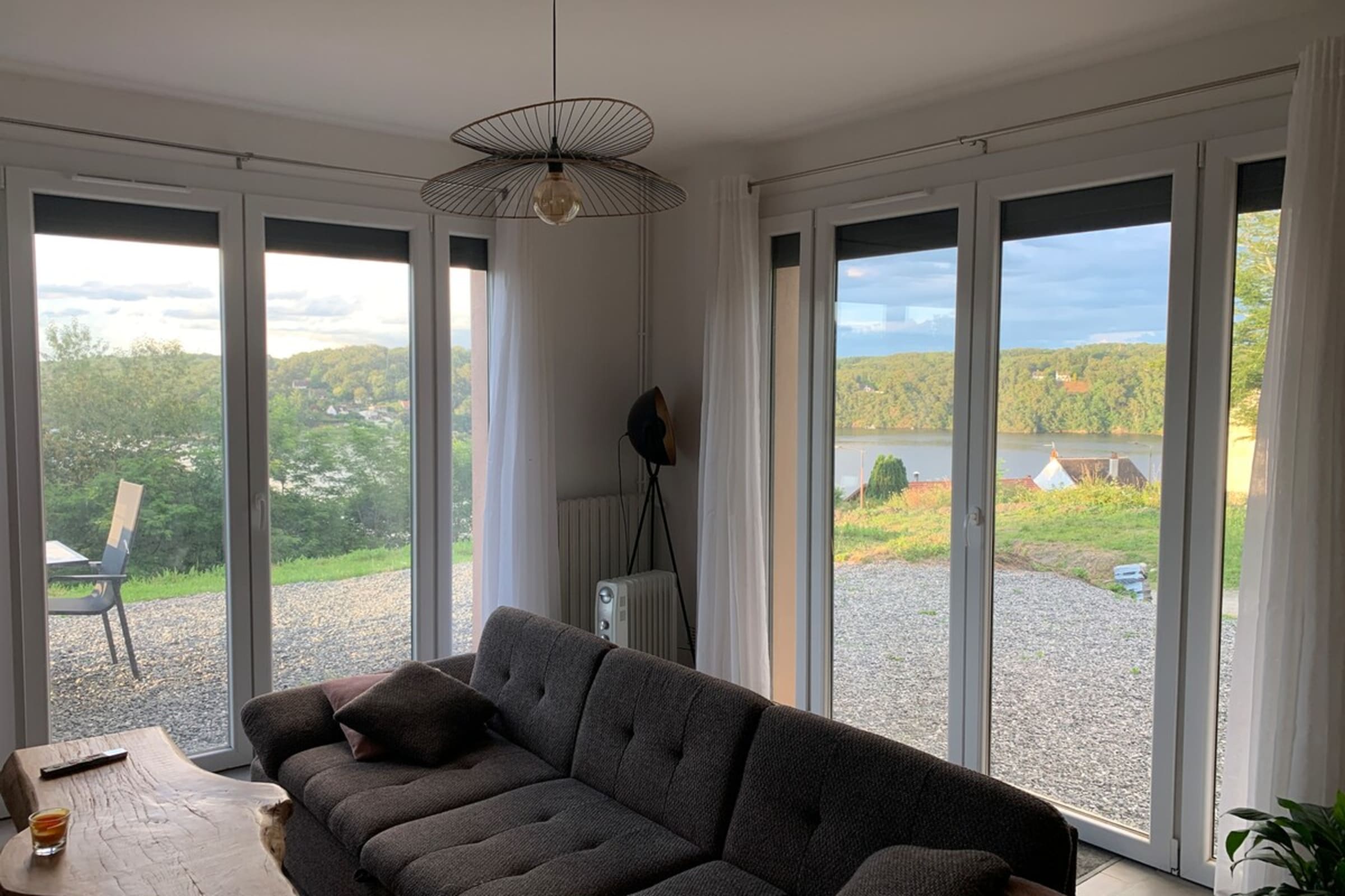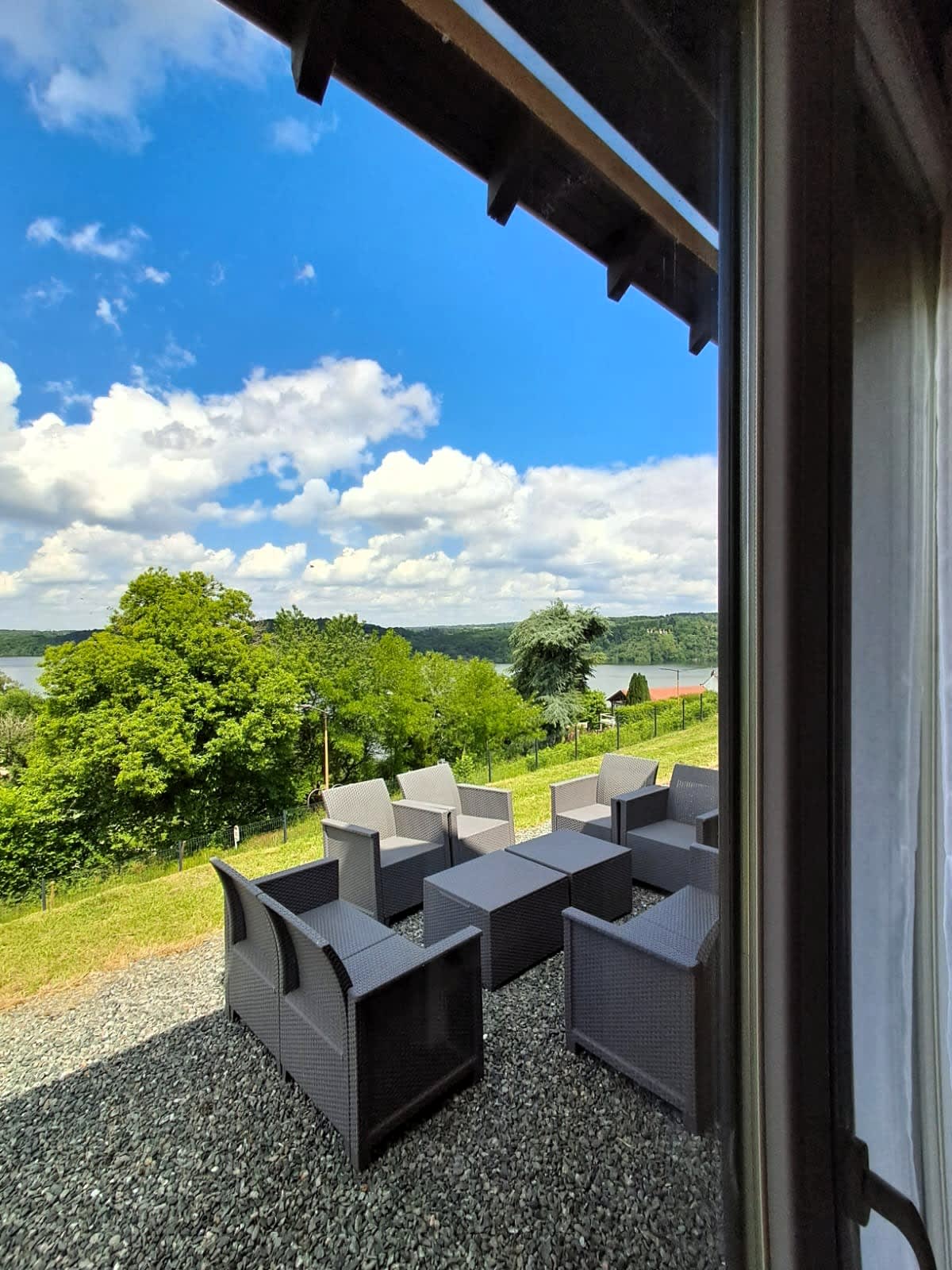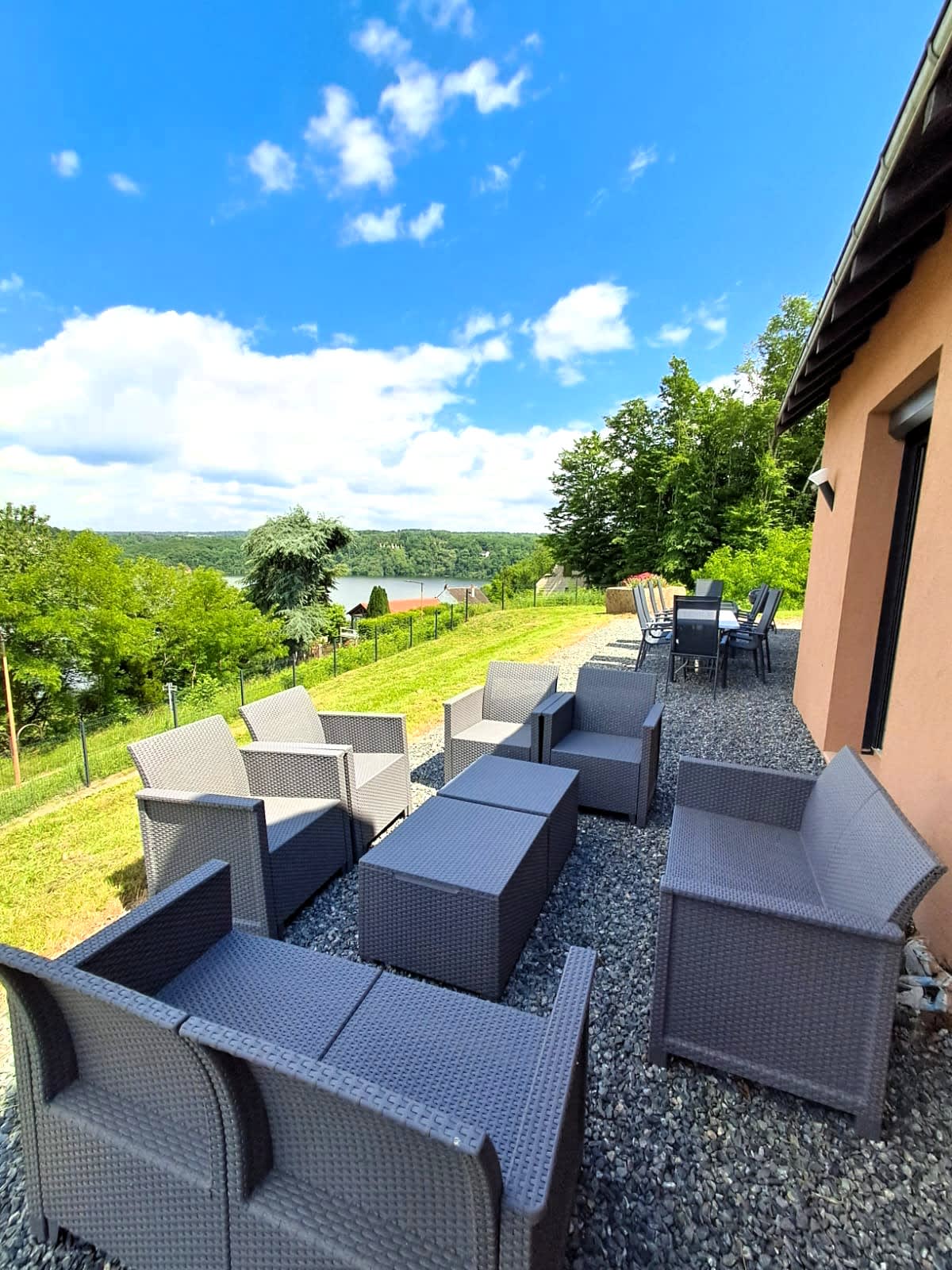 Genießen Sie eine große Terrasse mit atemberaubender Aussicht auf den See, die für Ihre Mahlzeiten im Freien mit einem Holzkohlegrill ausgestattet ist (Holzkohle nicht im Lieferumfang enthalten).