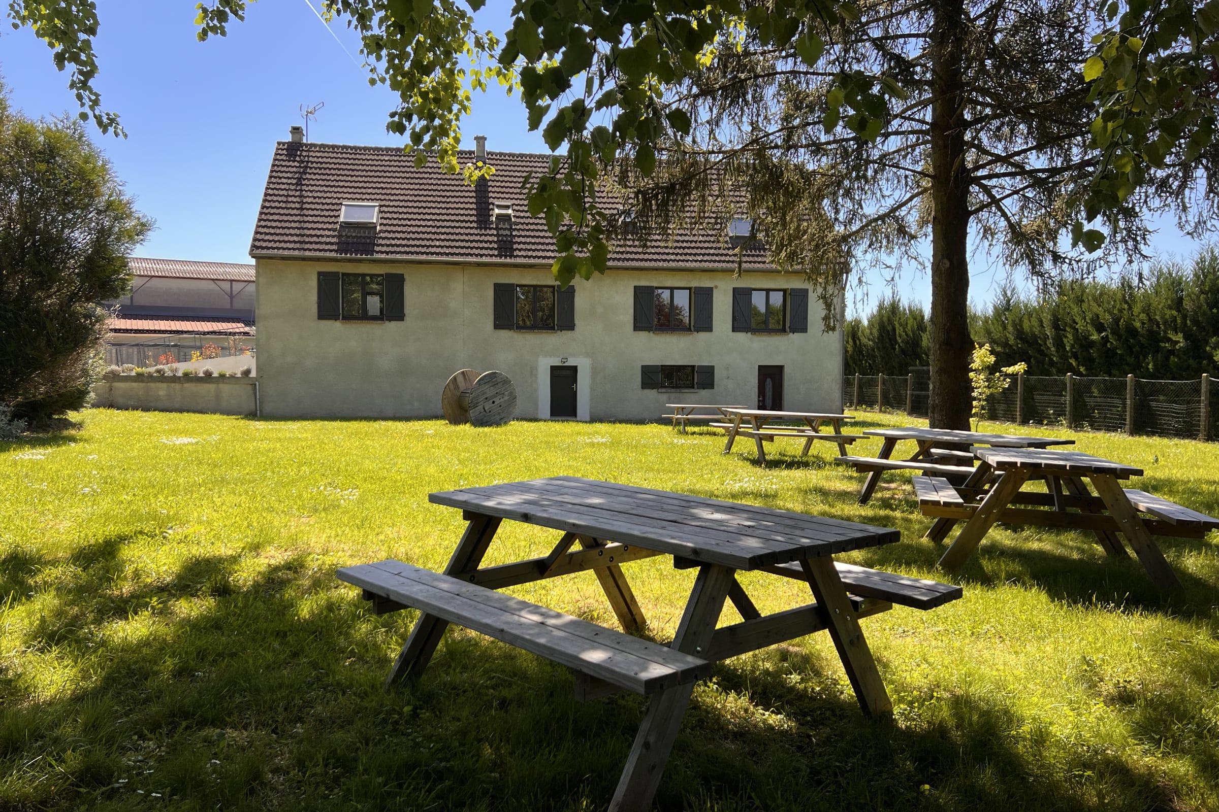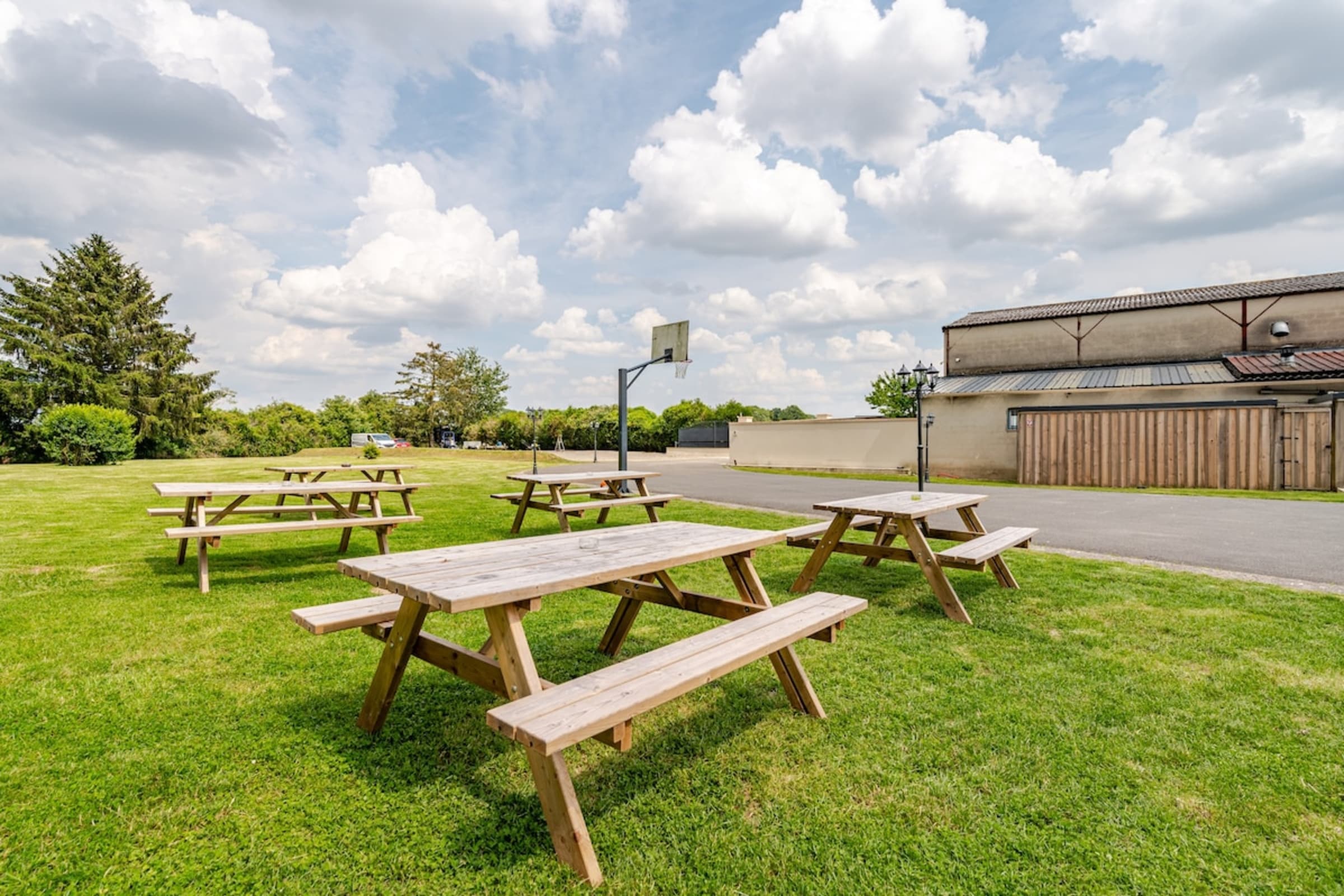 - 5 Gartentische mit bequemen Sitzplätzen für 30 Personen.
