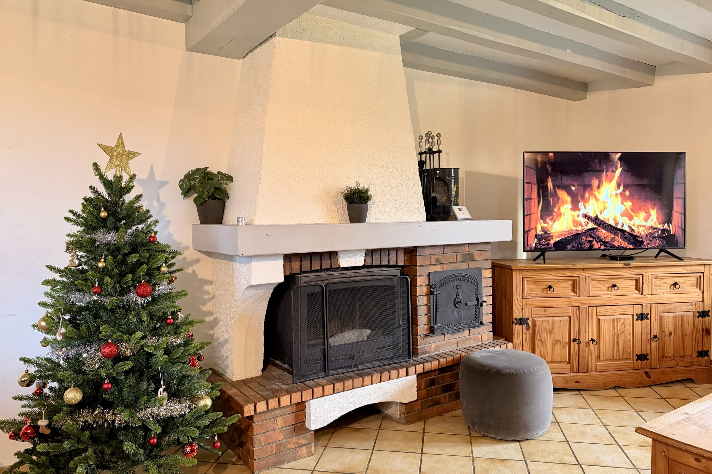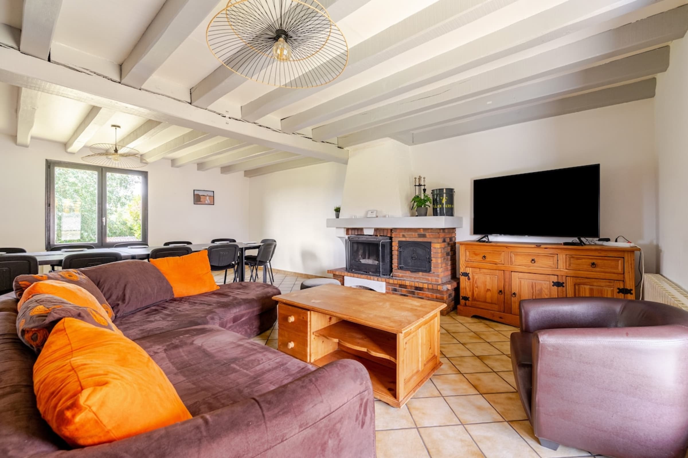 Im Erdgeschoss befindet sich ein großes Wohn-/Esszimmer mit einem Holzkamin (Holz nicht vorhanden), einem Sofa und einem Couchtisch. Das Esszimmer verfügt über zwei große Tische, an denen alle Ihre Gäste Platz finden.