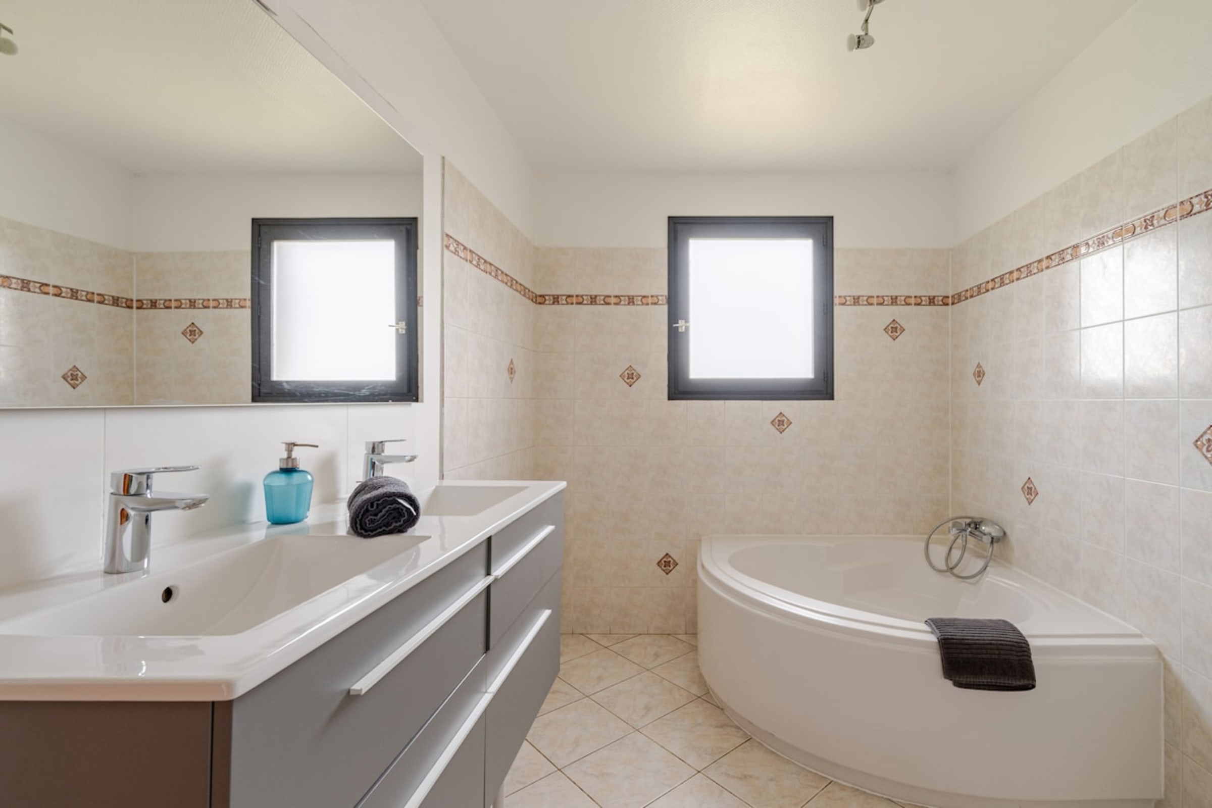 Das erste im Erdgeschoss ist mit einem Doppelwaschbecken, einer Dusche und einer Badewanne ausgestattet.