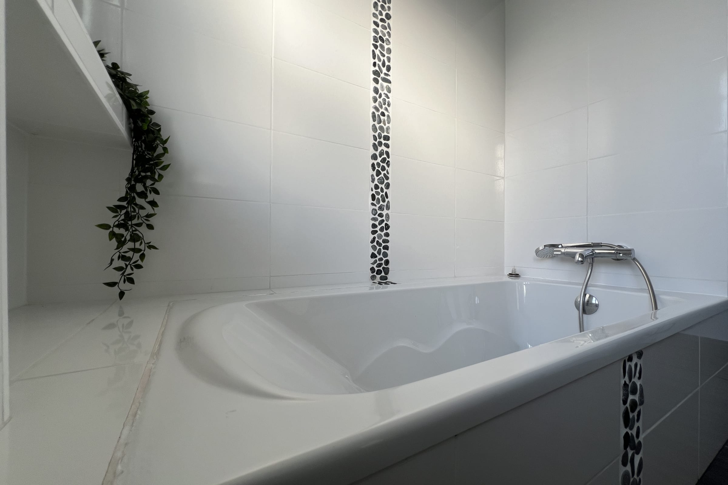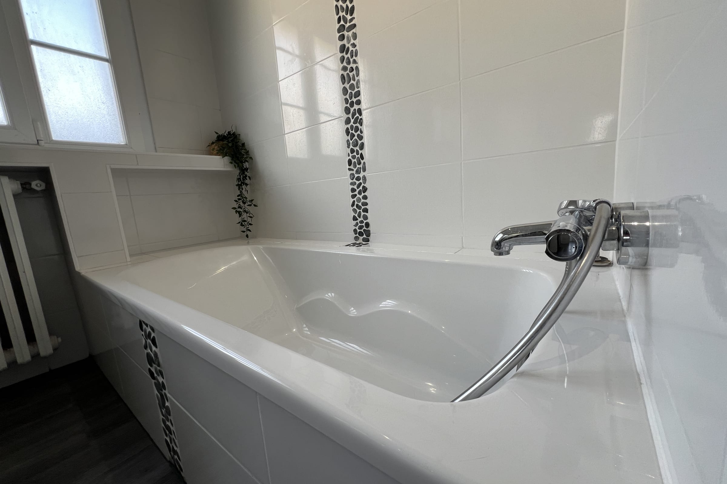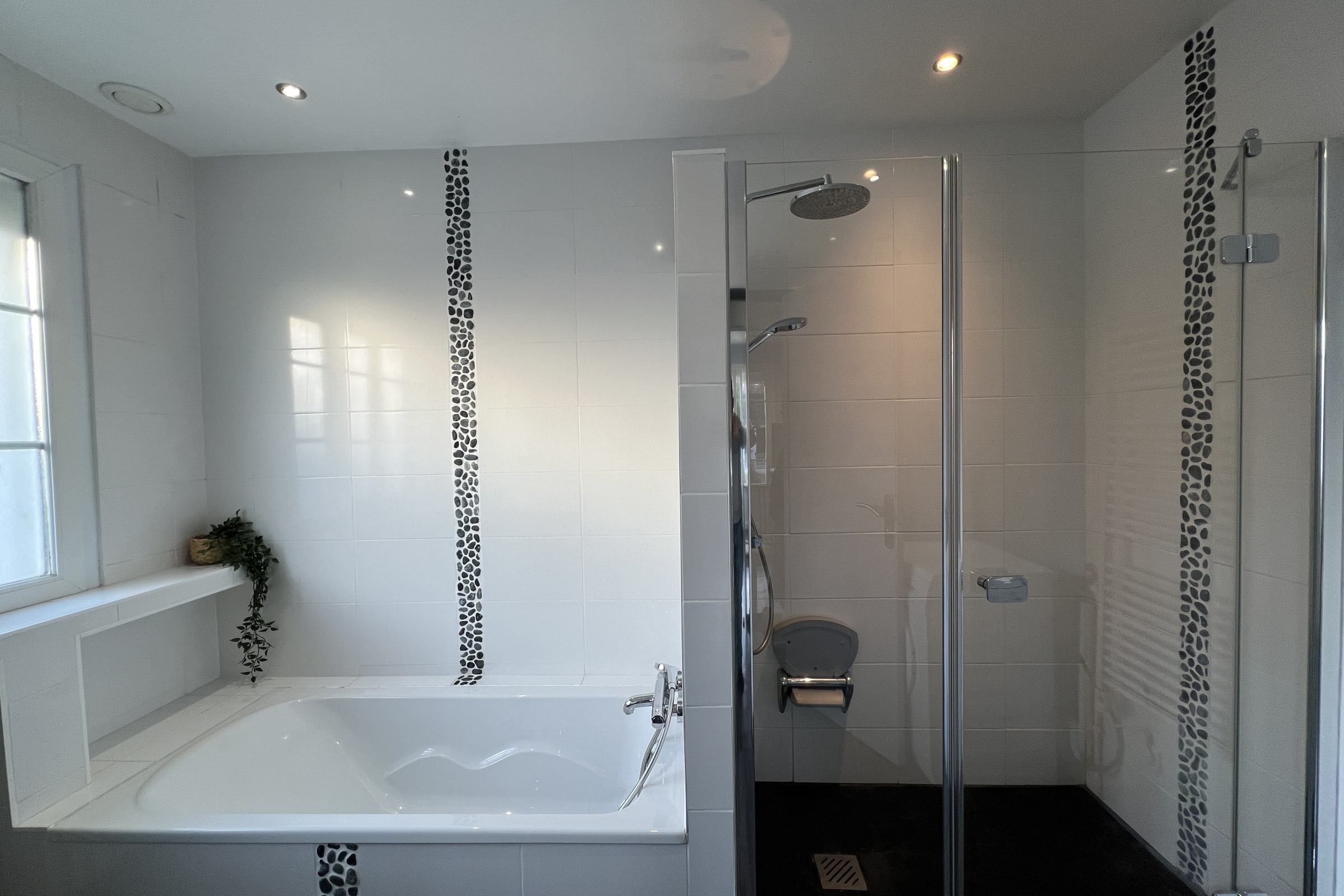 Es stehen zwei Badezimmer zur Verfügung: eines im Erdgeschoss mit Waschbecken, Dusche, Badewanne und Waschmaschine. Das zweite Obergeschoss verfügt über eine Badewanne, ein Doppelwaschbecken und eine Toilette.