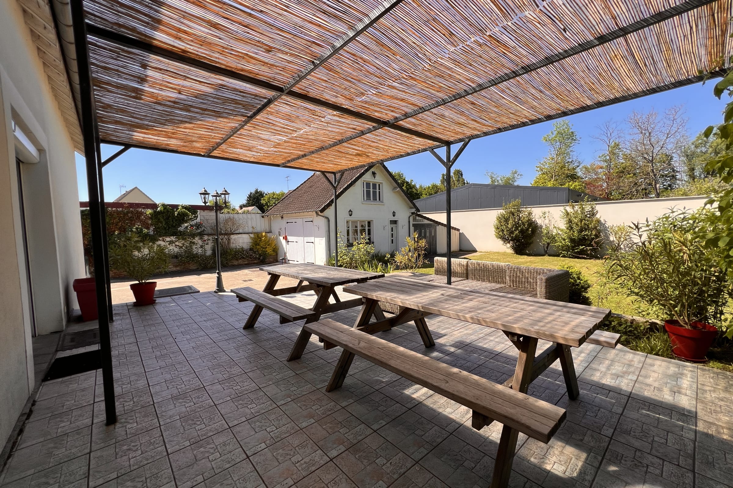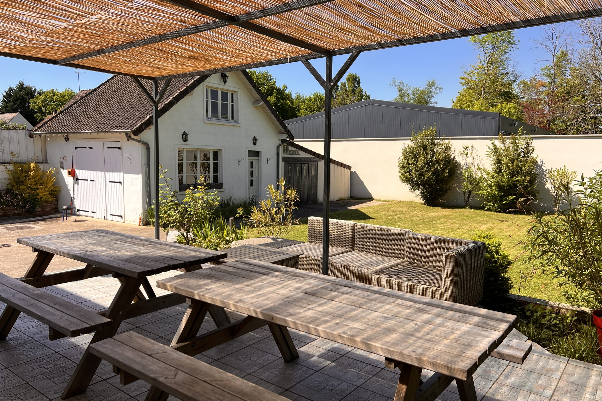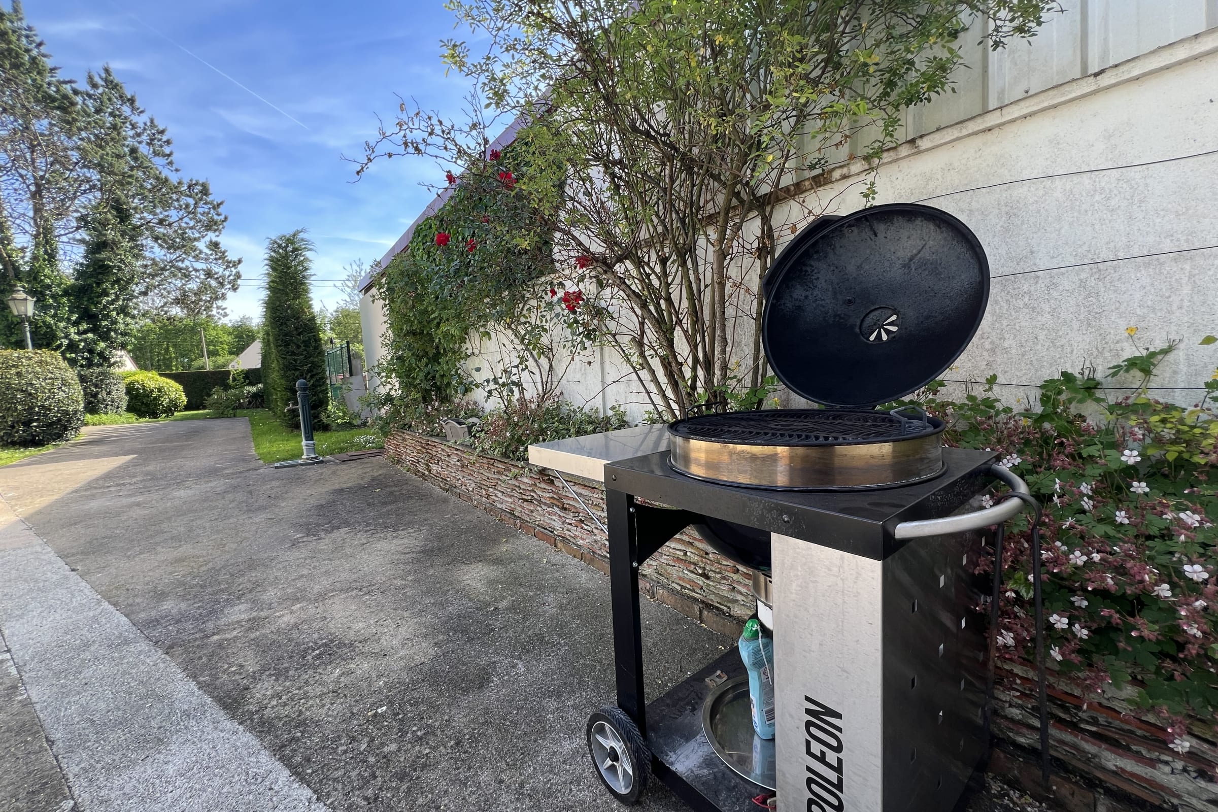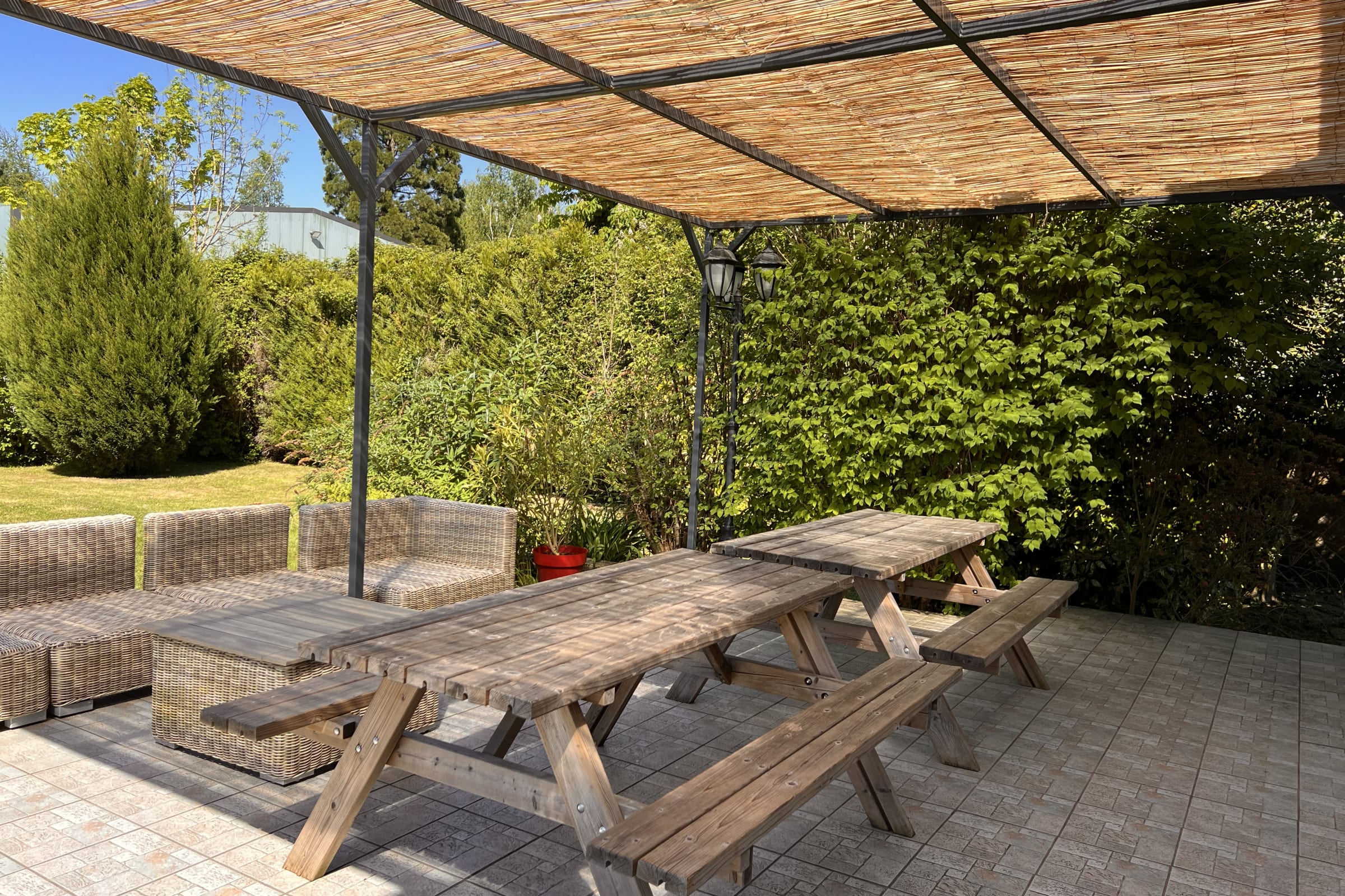 Vom Esszimmer aus haben Sie Zugang zu einer 100 m² großen Terrasse, die mit einem Grill und zwei großen Gartentischen für ein angenehmes Essen in der Sonne ausgestattet ist.