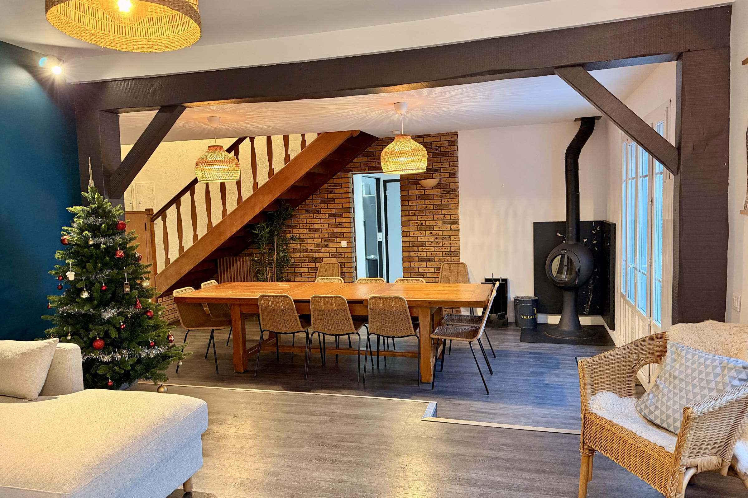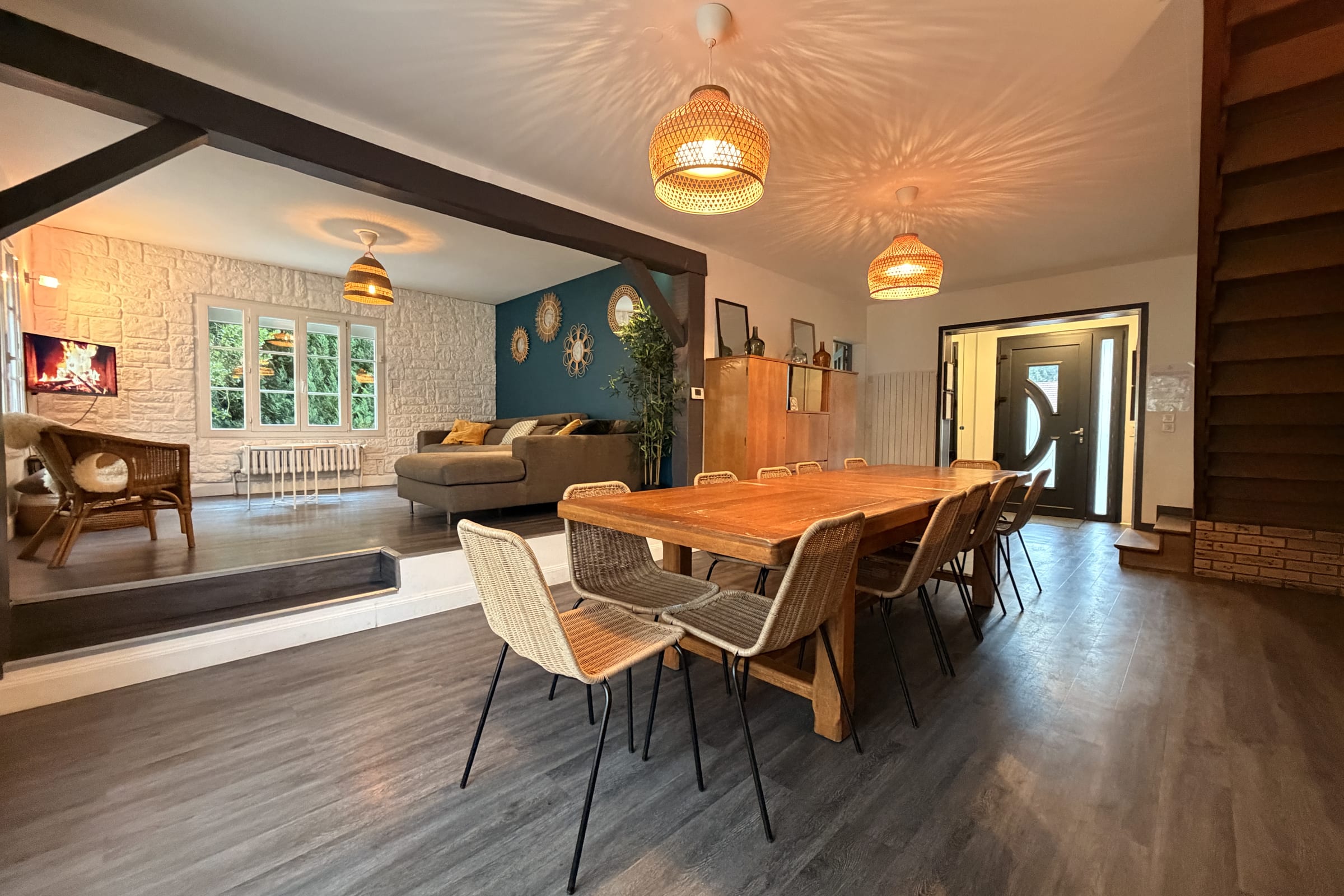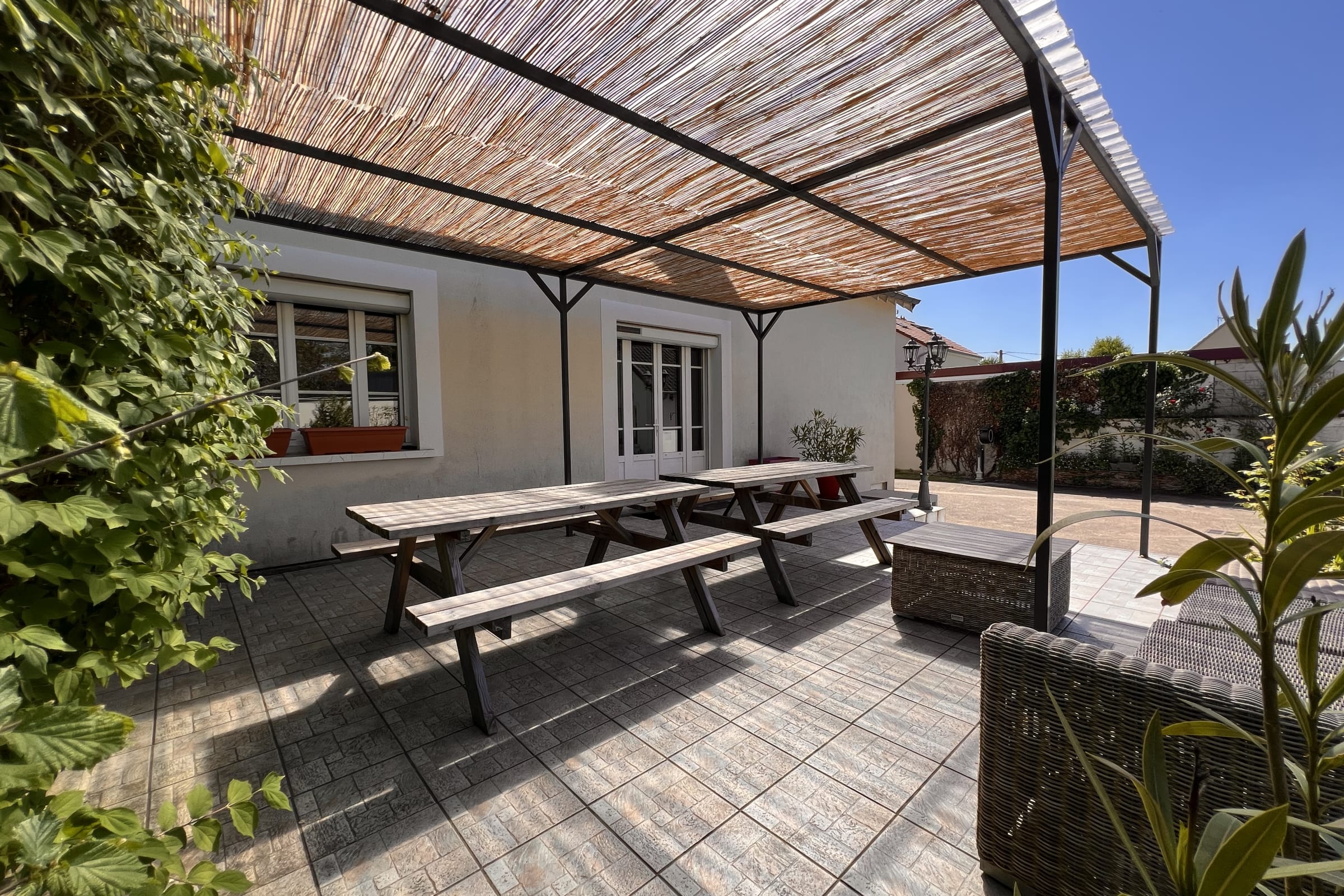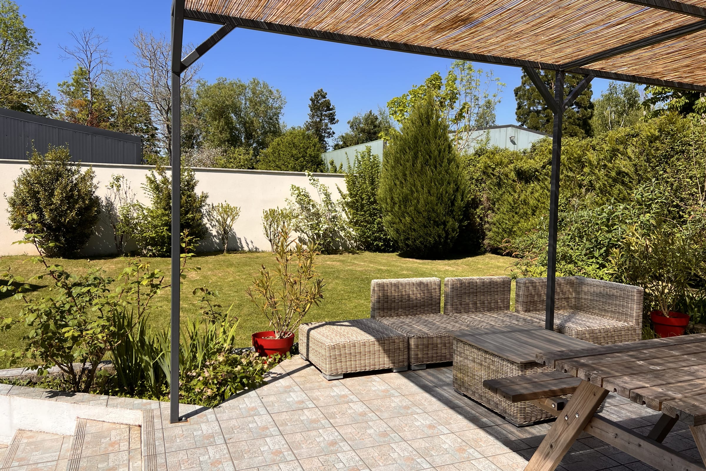 Vom Esszimmer aus haben Sie Zugang zu einer 100 m² großen Terrasse, die mit einem Grill und zwei großen Gartentischen für ein angenehmes Essen in der Sonne ausgestattet ist.