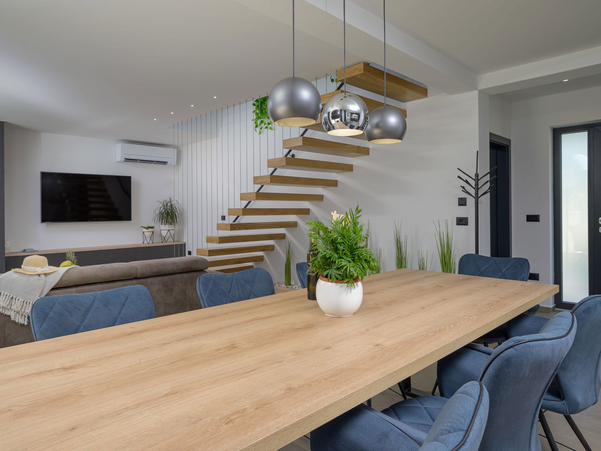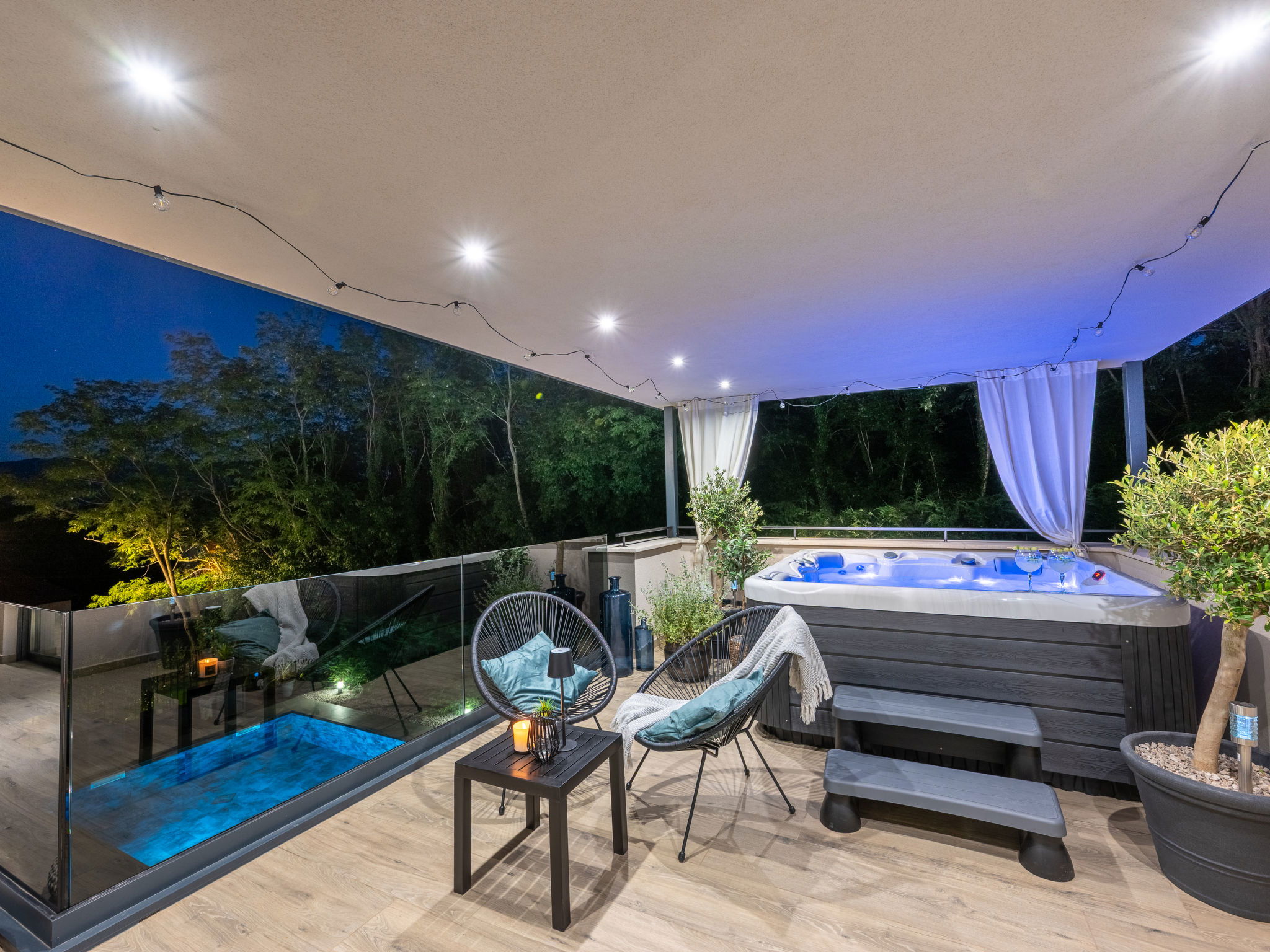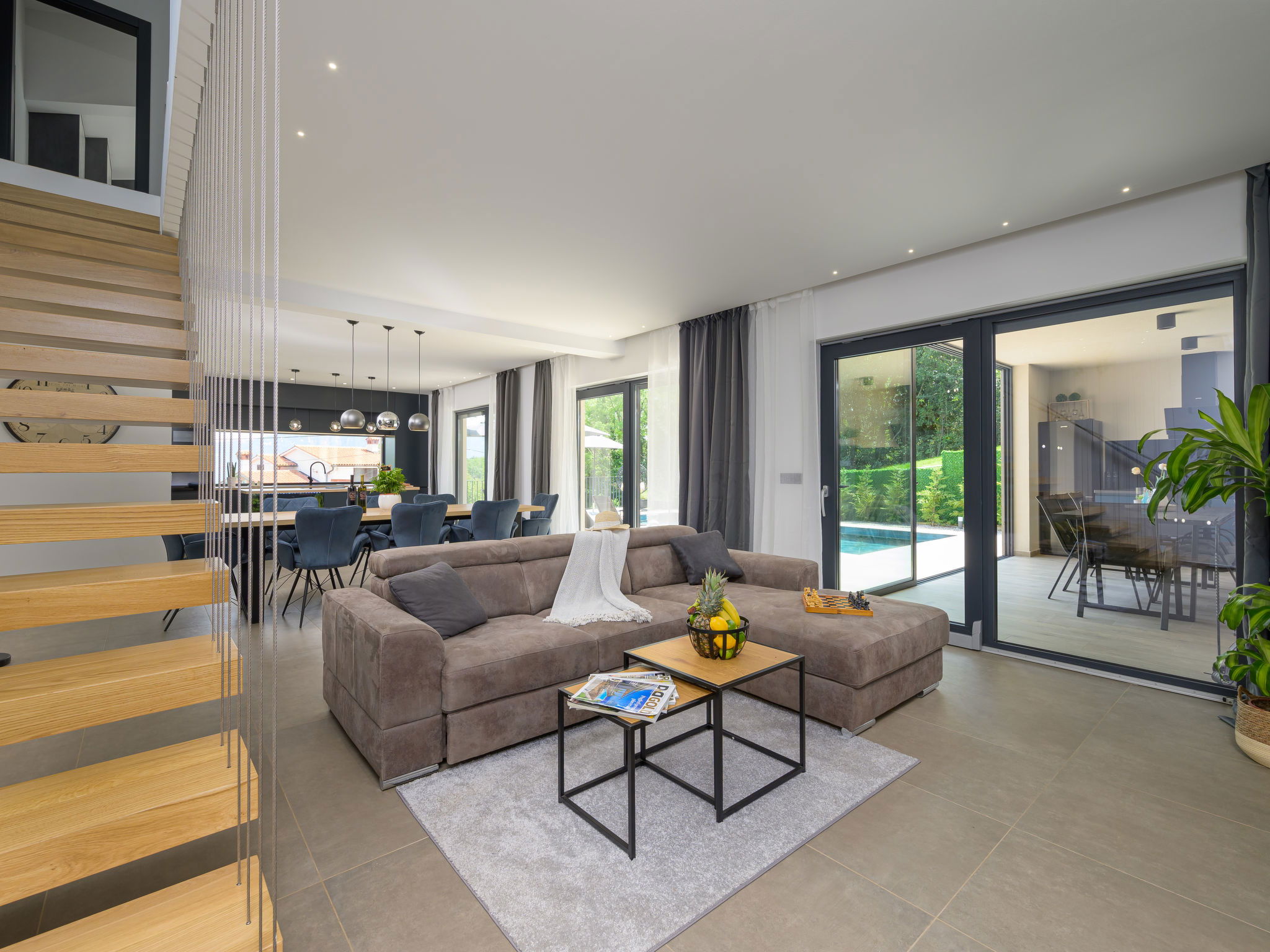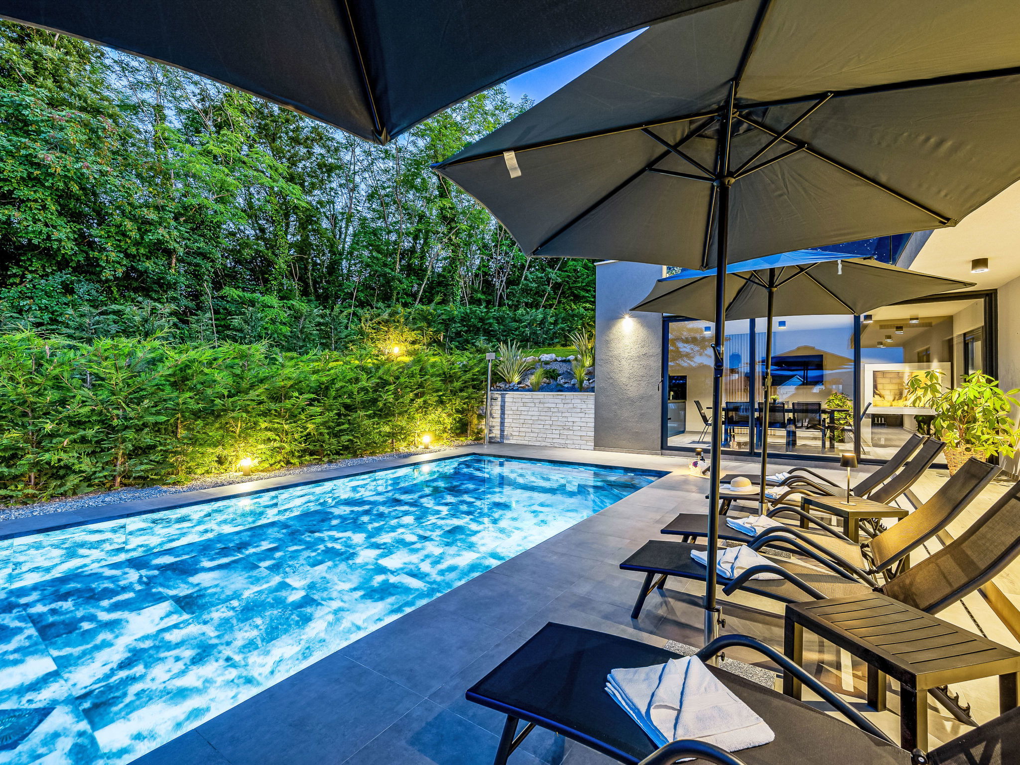 Sehr schöne, luxuriöse Villa "Ollea", auf 3 Stockwerken. Im Weiler Radovići, 10 km vom Zentrum von Labin, 15 km vom Zentrum von Rabac, 15 km vom Meer. Zur Alleinbenutzung: Grundstück 900 m2 (eingezäunt) mit Pflanzen und Bäumen, Schwimmbad eckig (8 x 4 m, 150 cm tief, saisonale Verfügbarkeit: 01.Apr. - 30.Okt.) mit Innentreppe. Aussendusche, Sprudelbad, Tischtennis, Grill (Rutschbahn, Schaukel), Poolpflege durch den Besitzer/Gärtner. Im Hause: Internetzugang, Sauna, Tischfussball, Waschmaschine, Wäschetrockner. Parkplatz (für 4 Autos, überdacht) beim Haus auf dem Grundstück. Einkaufsgeschäft 4 km, Supermarkt 10 km, Restaurant 4 km, Bushaltestelle "Labin" 10 km, Kieselstrand 15 km. Der Besitzer akzeptiert keine Jugendgruppen. Bitte beachten: Flugplatz 53 km vom Haus. Videoüberwachung der Einfahrt und des Parkplatzes.