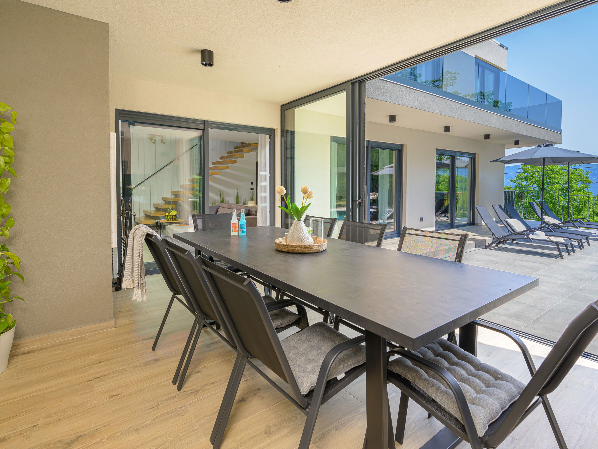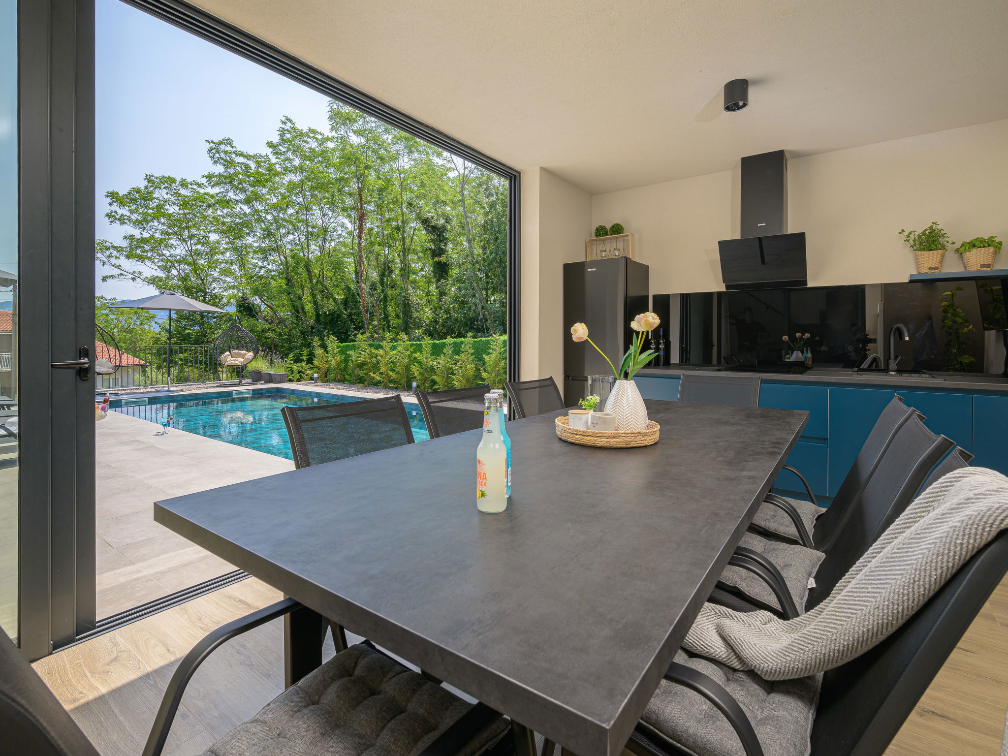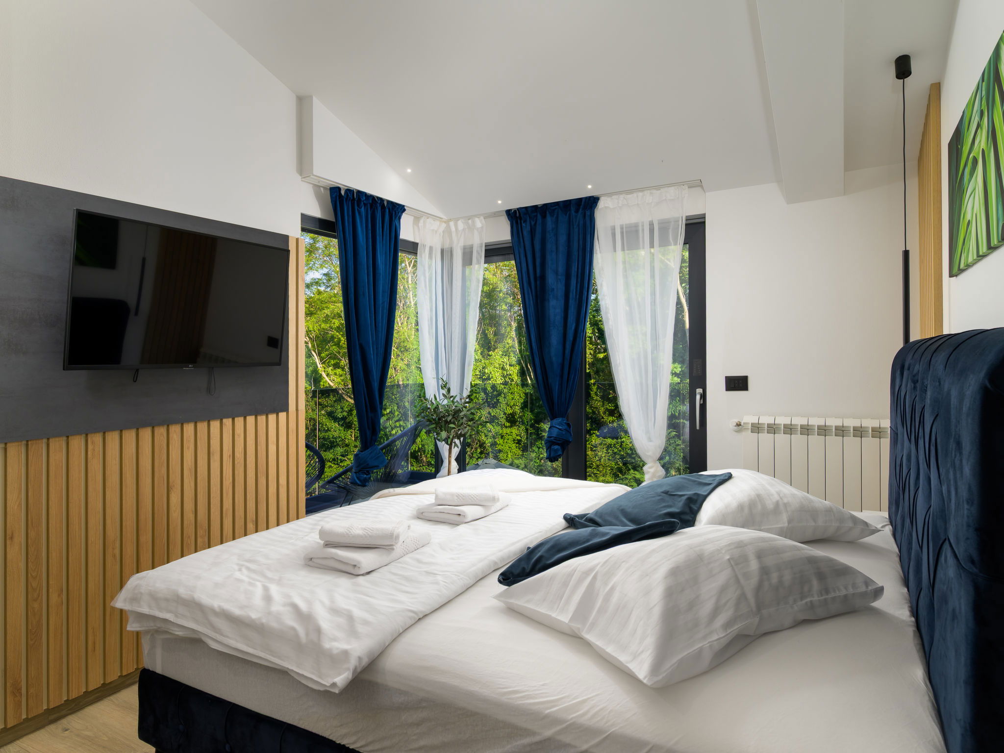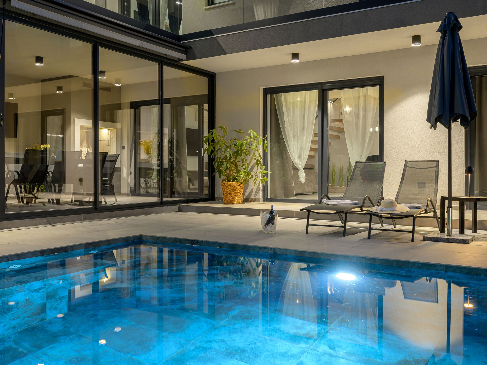 Sehr schöne, luxuriöse Villa "Ollea", auf 3 Stockwerken. Im Weiler Radovići, 10 km vom Zentrum von Labin, 15 km vom Zentrum von Rabac, 15 km vom Meer. Zur Alleinbenutzung: Grundstück 900 m2 (eingezäunt) mit Pflanzen und Bäumen, Schwimmbad eckig (8 x 4 m, 150 cm tief, saisonale Verfügbarkeit: 01.Apr. - 30.Okt.) mit Innentreppe. Aussendusche, Sprudelbad, Tischtennis, Grill (Rutschbahn, Schaukel), Poolpflege durch den Besitzer/Gärtner. Im Hause: Internetzugang, Sauna, Tischfussball, Waschmaschine, Wäschetrockner. Parkplatz (für 4 Autos, überdacht) beim Haus auf dem Grundstück. Einkaufsgeschäft 4 km, Supermarkt 10 km, Restaurant 4 km, Bushaltestelle "Labin" 10 km, Kieselstrand 15 km. Der Besitzer akzeptiert keine Jugendgruppen. Bitte beachten: Flugplatz 53 km vom Haus. Videoüberwachung der Einfahrt und des Parkplatzes.