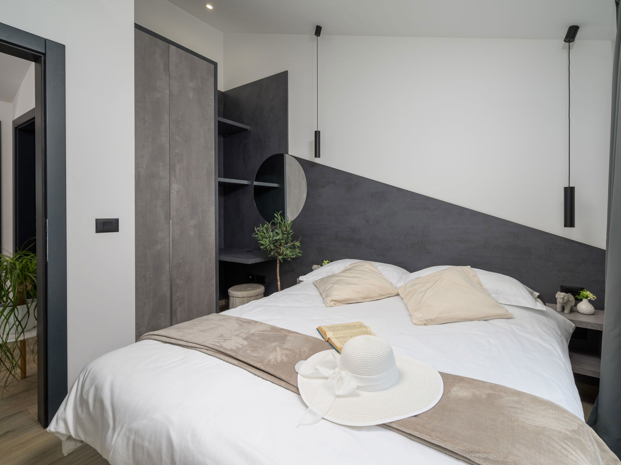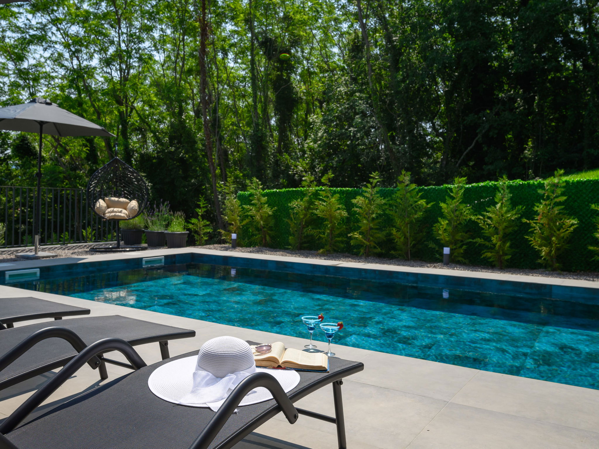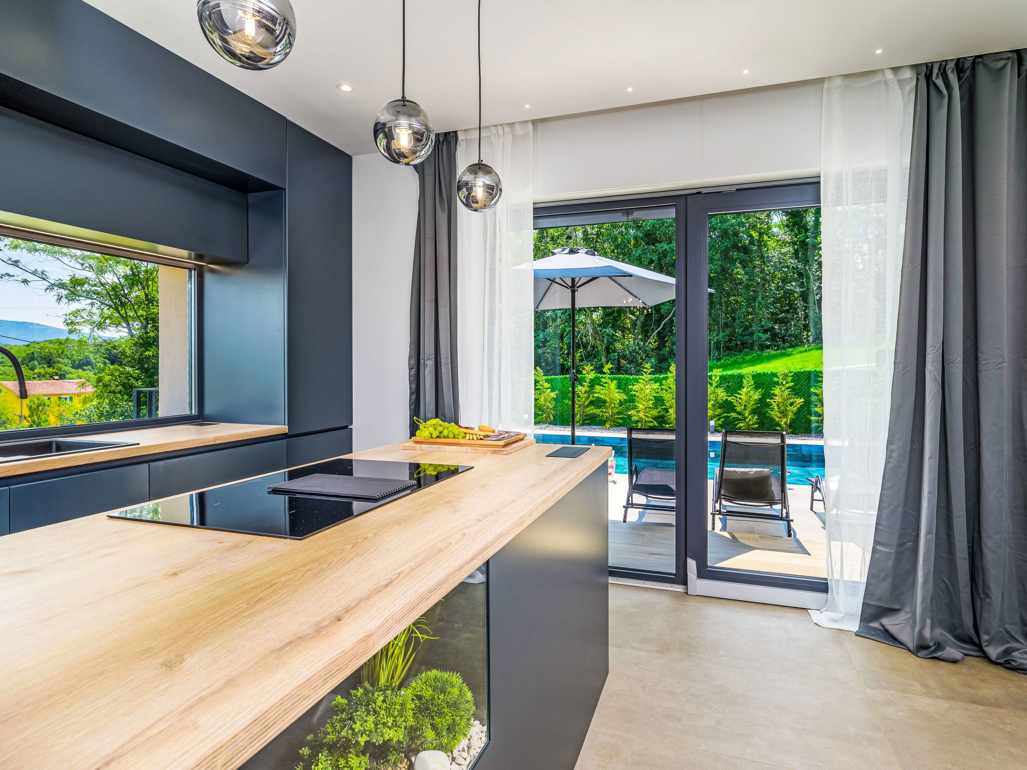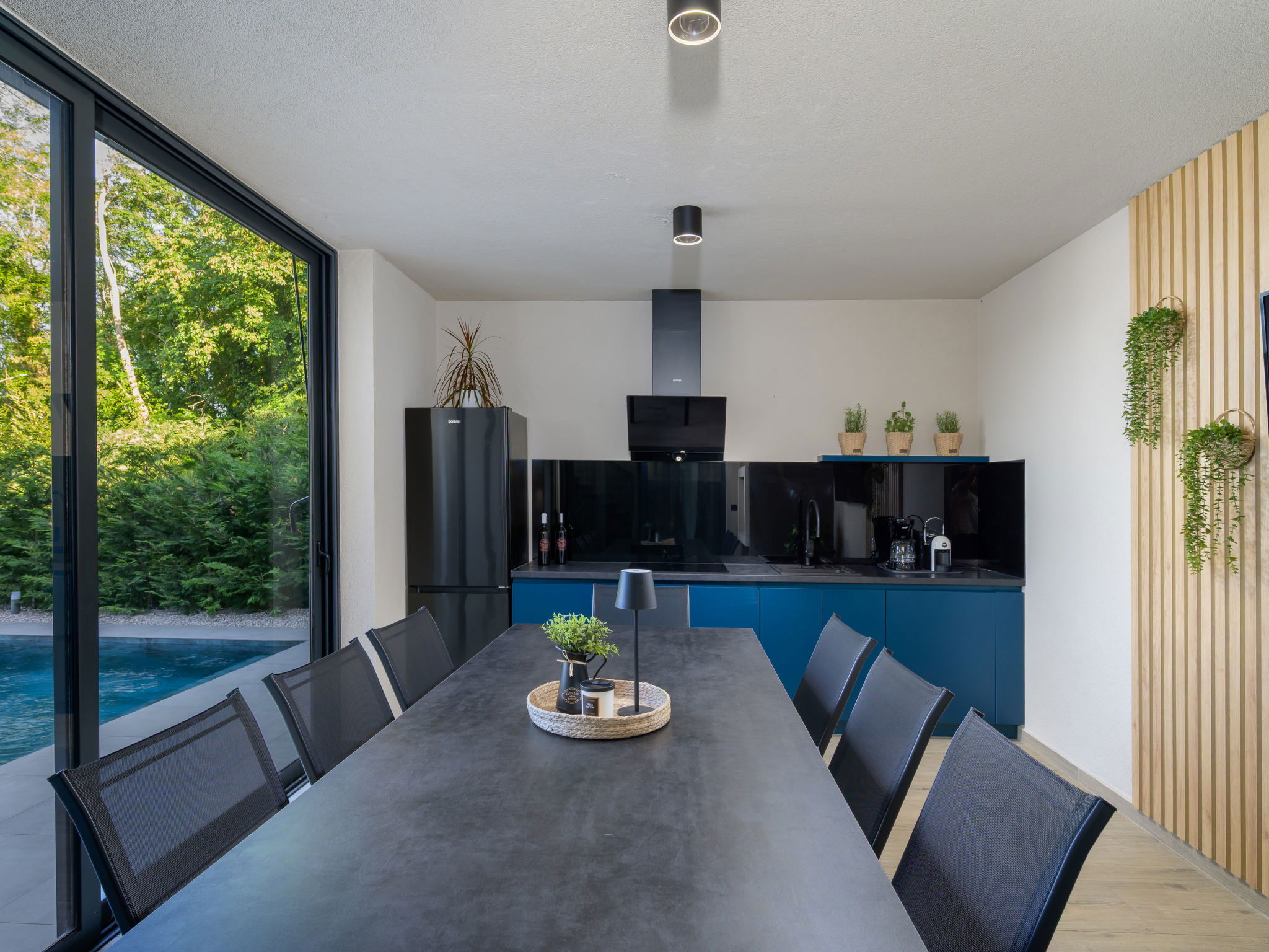 5-Zimmer-Villa 213 m2 auf 3 Stockwerken. Esszimmer mit Küchenblock und Sat-TV. Ausgang zur Terrasse, zum Schwimmbad. Wohn-/Esszimmer mit Sat-TV und Klimaanlage. Ausgang zur Terrasse, zum Schwimmbad. Offene Küche (Backofen, Geschirrspüler, 4 Induktionskochplatten, Toaster, Wasserkocher, Mikrowelle, Tiefkühler, elektrische Kaffeemaschine, Kochinsel). Ausgang zur Terrasse, zum Schwimmbad. Dusche/WC. Unteres Geschoss: 1 Zimmer mit 1 franz. Bett (180 cm, Länge 200 cm), Sat-TV und Klimaanlage. Obergeschoss: 1 Zimmer mit 1 franz. Bett (180 cm, Länge 200 cm), Dusche/Bidet/WC, Sat-TV und Klimaanlage. Ausgang zur Terrasse. 1 Zimmer mit 1 franz. Bett (180 cm, Länge 200 cm), Dusche/WC, Sat-TV und Klimaanlage. Ausgang zur Terrasse. 1 Zimmer mit 1 franz. Bett (160 cm, Länge 200 cm), Dusche/WC, Sat-TV und Klimaanlage. Ausgang zur Terrasse. Warmluftheizung. Terrasse 30 m2 teilweise überdacht Terrasse 35 m2 teilweise überdacht. Terrassenmöbel, Liegestühle. Zur Verfügung: Safe, Bügeleisen, Haartrockner. Internet (WLAN, gratis). Bitte beachten: Nichtraucher-Haus. Maximal 2 Haustiere/Hunde erlaubt.