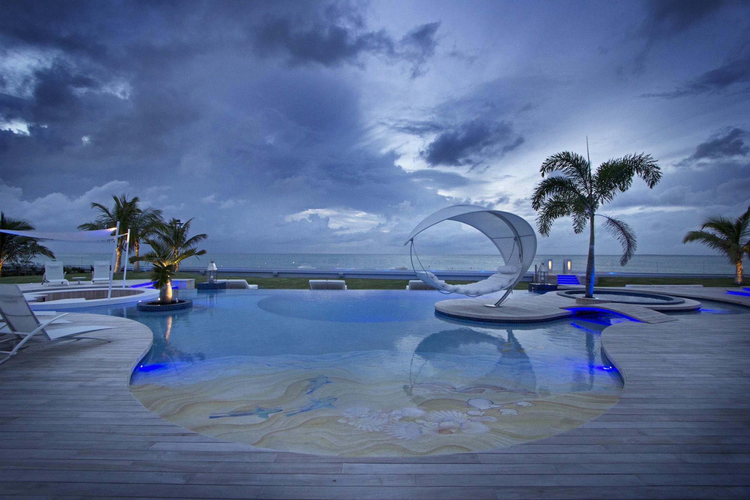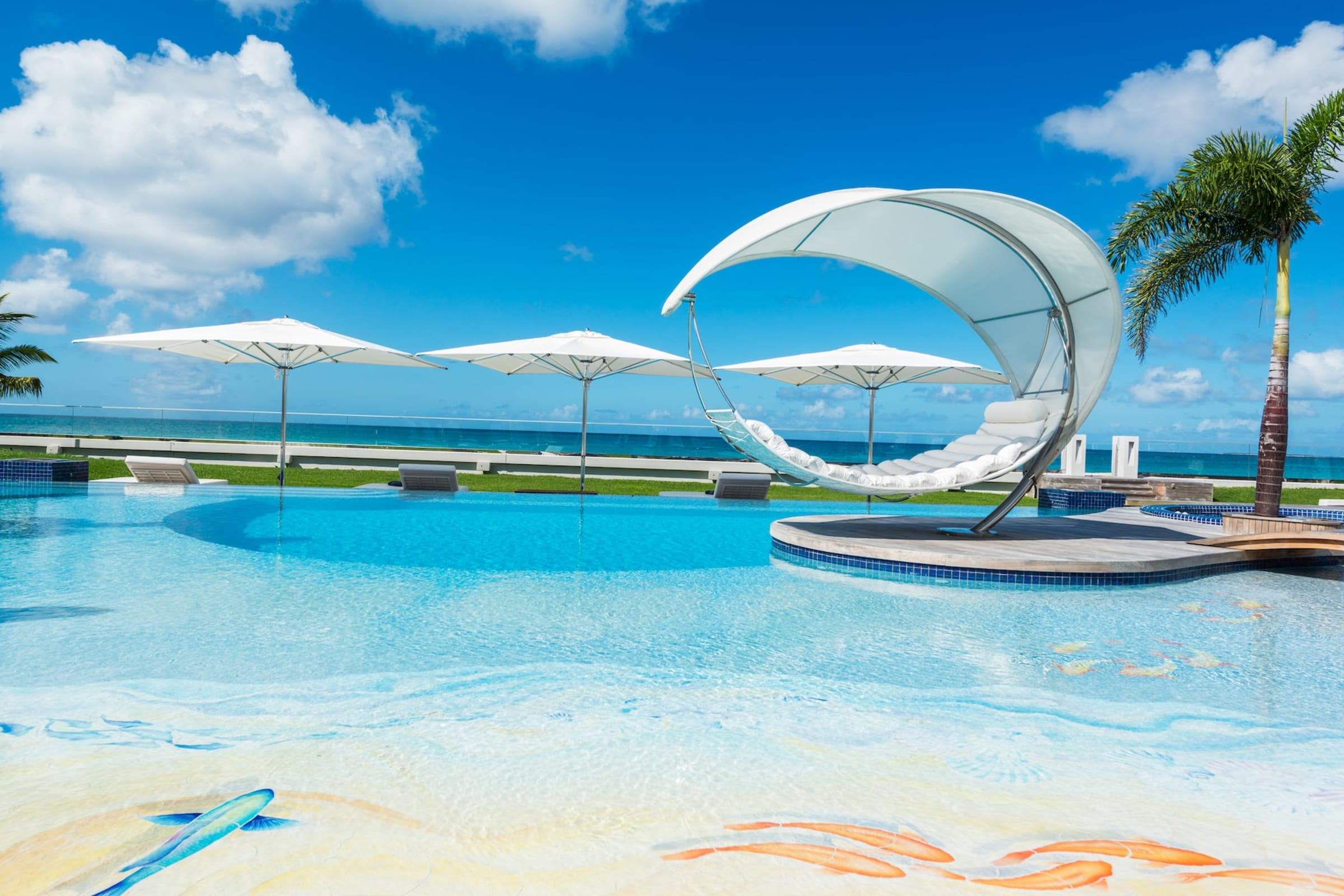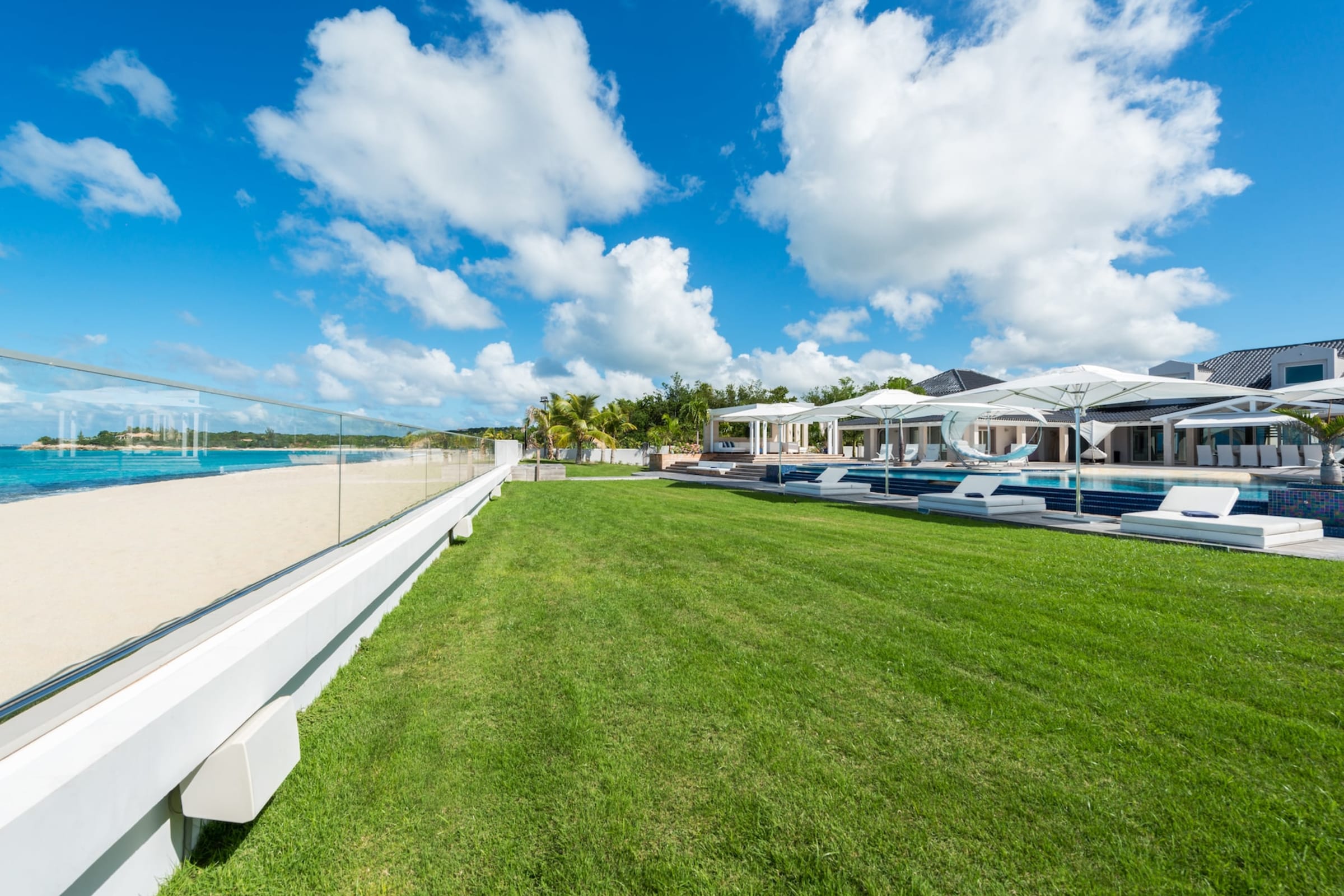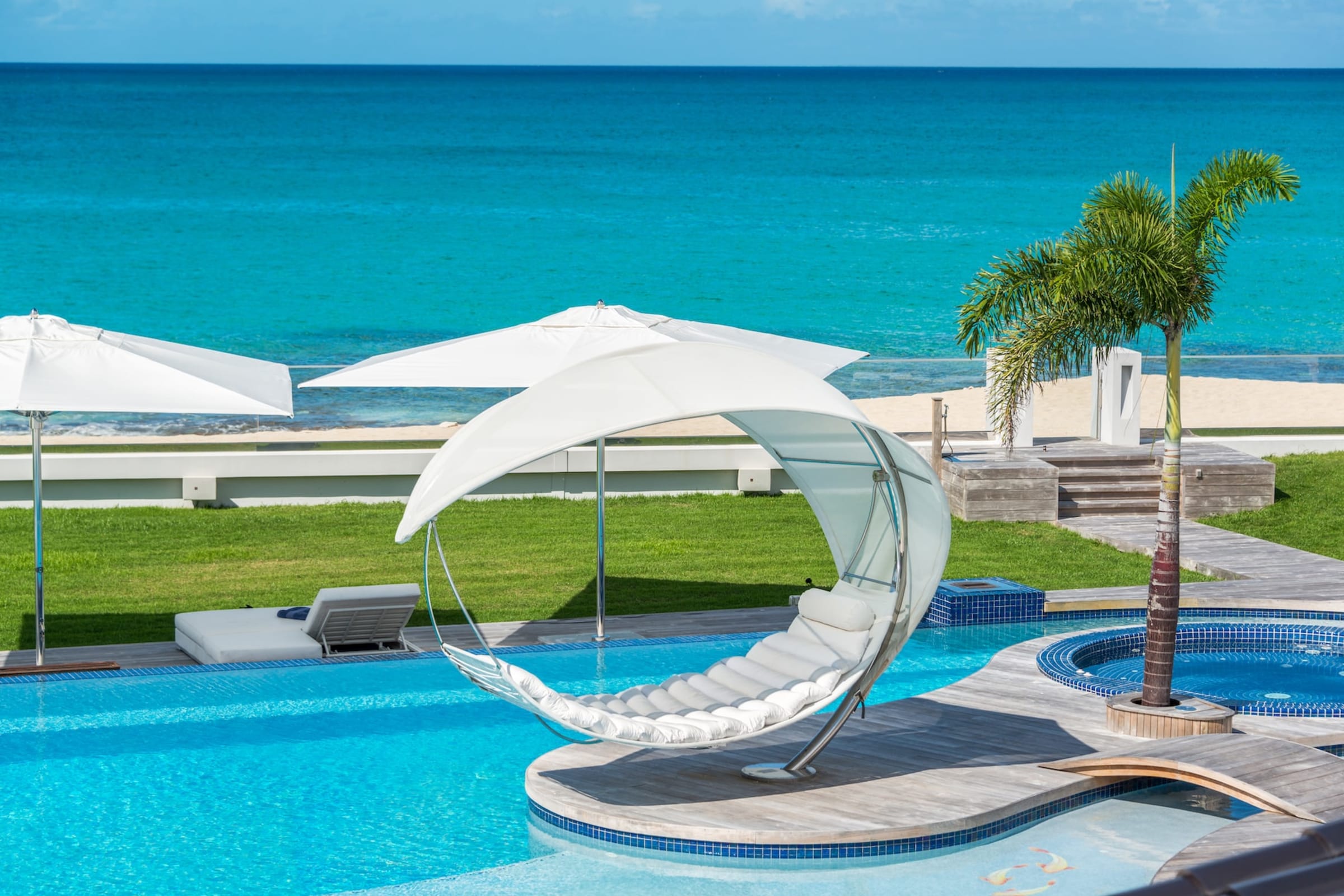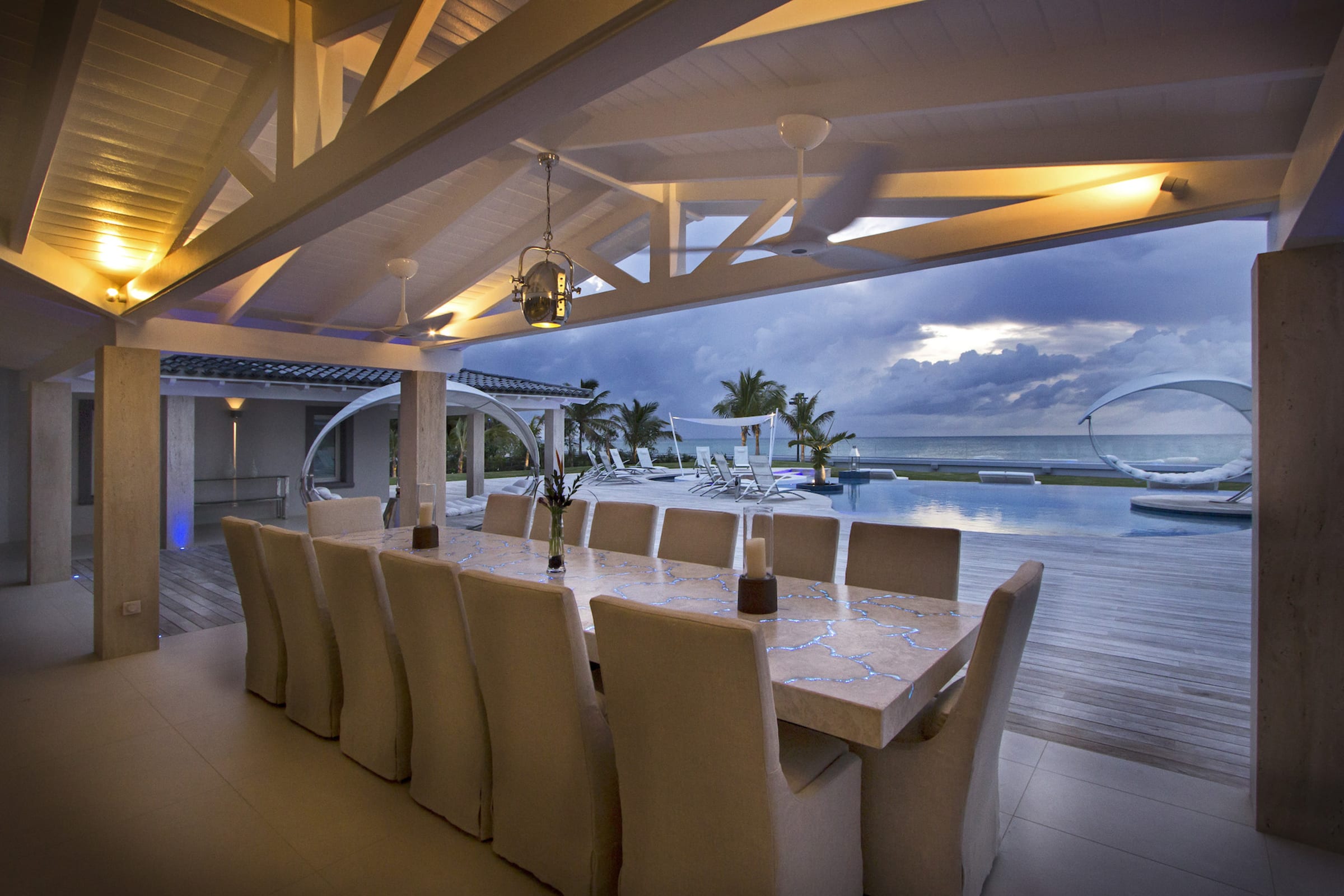 Eines der beeindruckendsten Merkmale der Villa ist die großzügige Außenterrasse rund um den beheizten Pool, die Poolbar und den Whirlpool. Dieser Raum ist ideal zum Entspannen und Sonnenbaden und bietet gleichzeitig einen atemberaubenden Blick auf Strand und Meer.