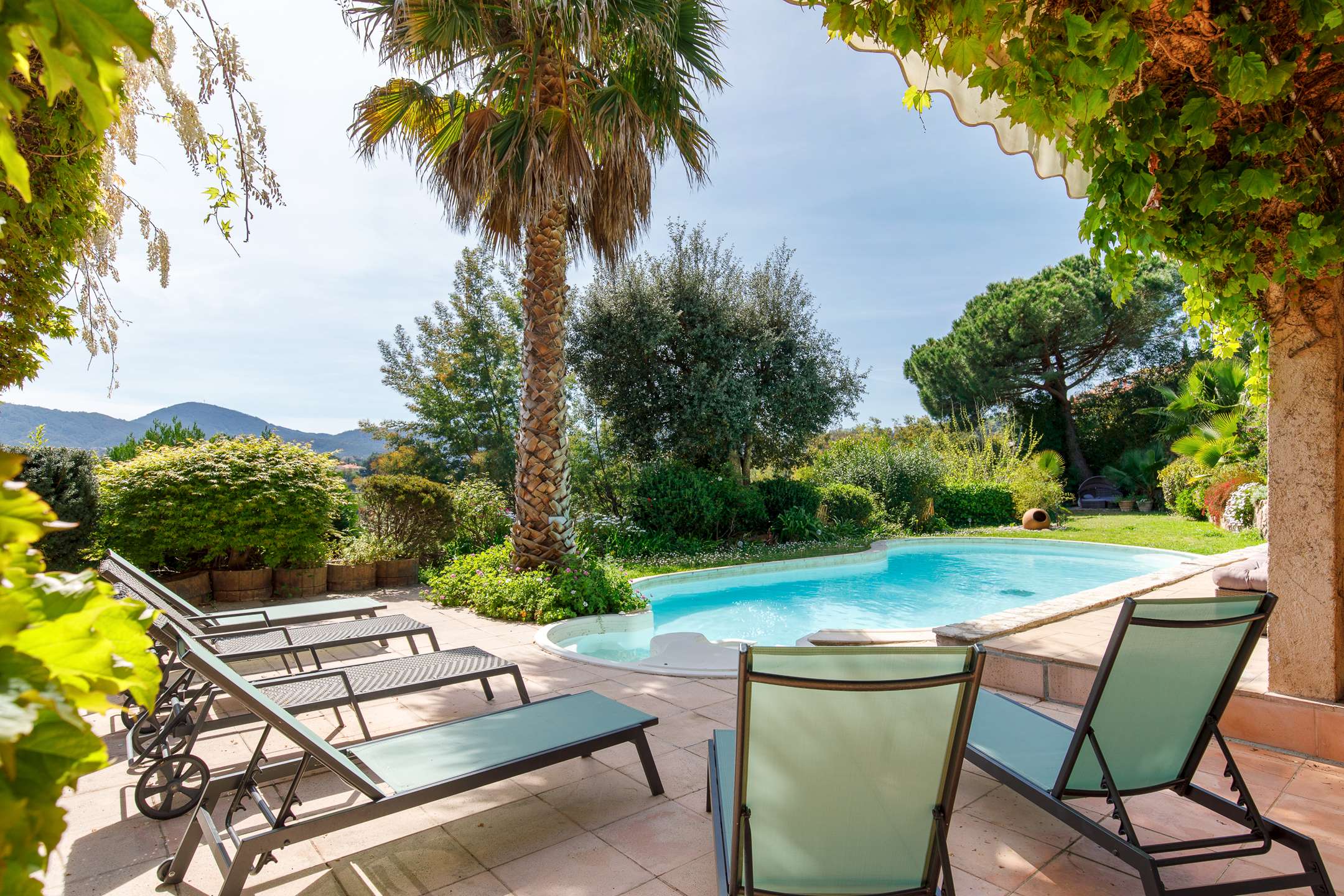 Auf den Höhen von Mandelieu, 9 km von Cannes und der berühmten Croisette entfernt, befindet sich diese wunderschöne, vollständig renovierte Villa, ideal für einen erholsamen Urlaub. Auf einem 2800 m² großen, eingezäunten Grundstück haben Sie einen Panoramablick auf das Meer, die Lérins-Inseln und das Becken von Cannes. Großer beheizter Swimmingpool (extra) (12 m x 5 m – Chlor – max. Tiefe 1,6 m). Poolhaus mit Sommerküche, Weber-Gasgrill, Pergola mit Vernebelungssystem, großer Esstisch im Freien, Gartenmöbel, Liegestühle. Tischtennisplatte, Billard. Parkplatz für 3 Autos. Strand und Golf 4,5 km. Geschäfte und Restaurants 2 km.