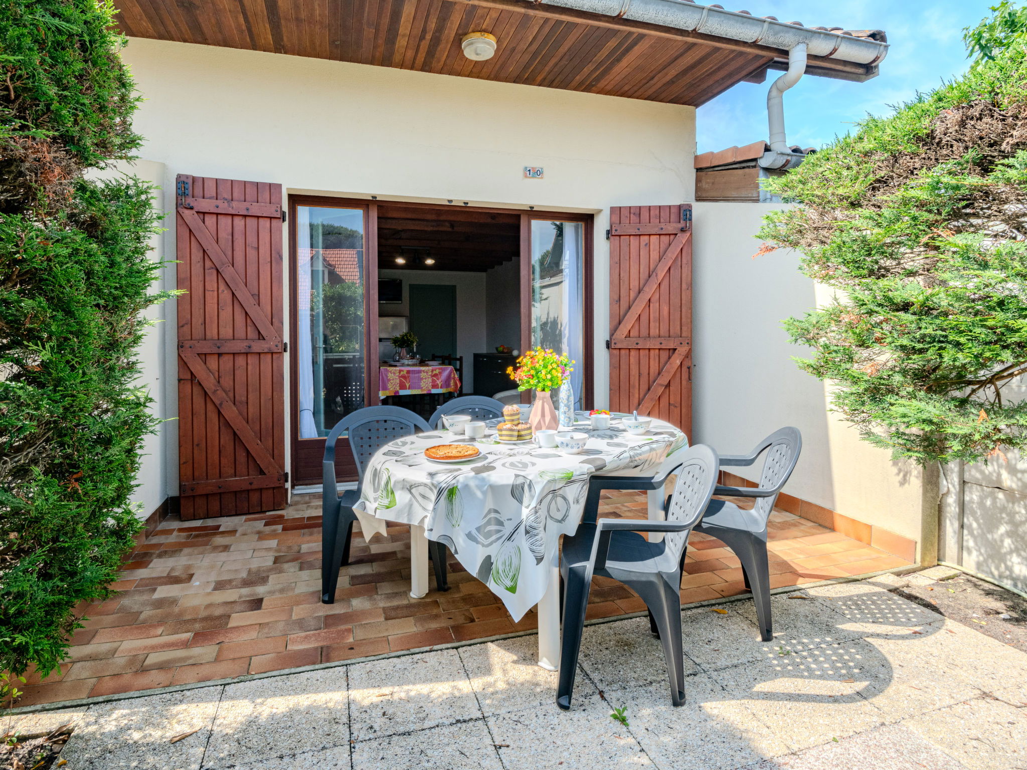 3-Zimmer-Reihenhaus 50 m2 auf 2 Stockwerken. Einfach eingerichtet: Wohn-/Esszimmer mit TV und Internationale TV-Sender (Flachbildschirm). Ausgang zur Terrasse. Kochnische (1 Kochplatte, Mini-Backofen, 4 Flammen, Toaster, Wasserkocher, Mikrowelle, elektrische Kaffeemaschine, Kapseln für die Kaffeemaschine (filtre) extra). Dusche, sep. WC. Heizung nicht in allen Räumen. Obergeschoss: 1 abgeschrägtes Zimmer mit 2 Betten (90 cm, Länge 190 cm). 1 abgeschrägtes Zimmer mit 1 Bett (90 cm, Länge 190 cm), 1 franz. Bett (140 cm, Länge 190 cm). Terrasse. Terrassenmöbel, Liegestühle (1). Zur Verfügung: Internet (WLAN, gratis). Bitte beachten: Maximal 1 Haustier/Hund erlaubt. Rauchmelder. Inserat einer Privatperson nach Artikel 155, IV, CGI.