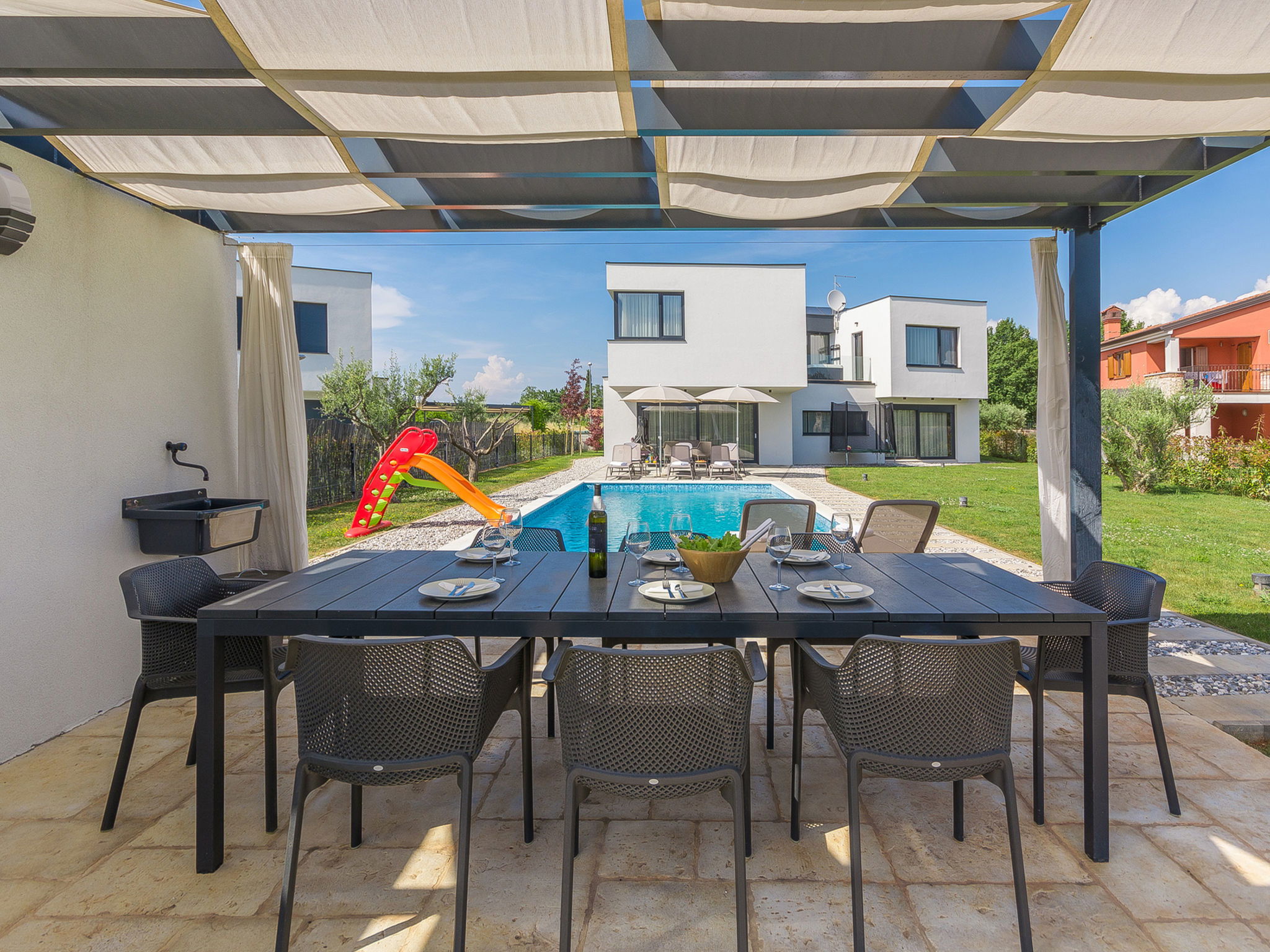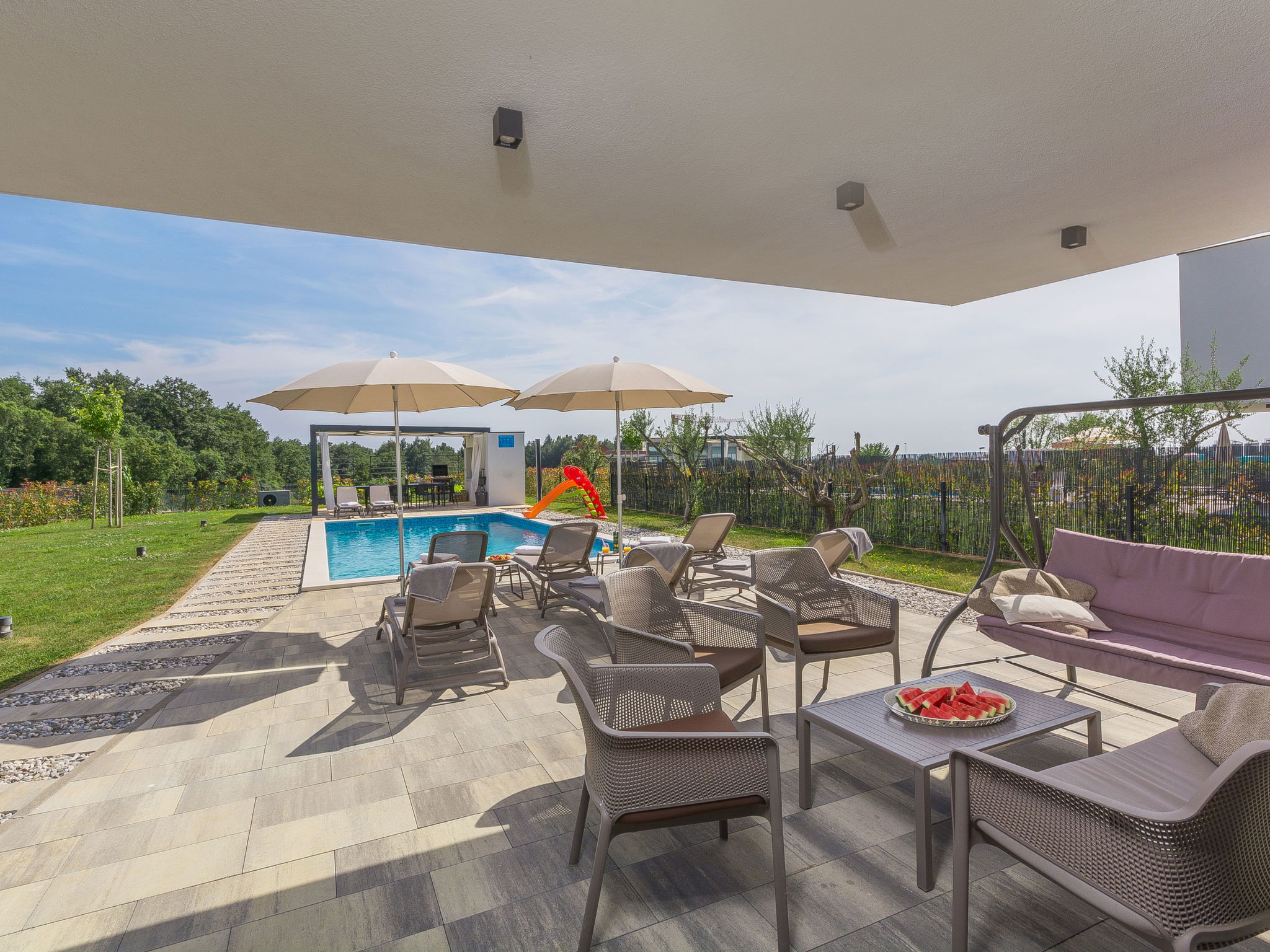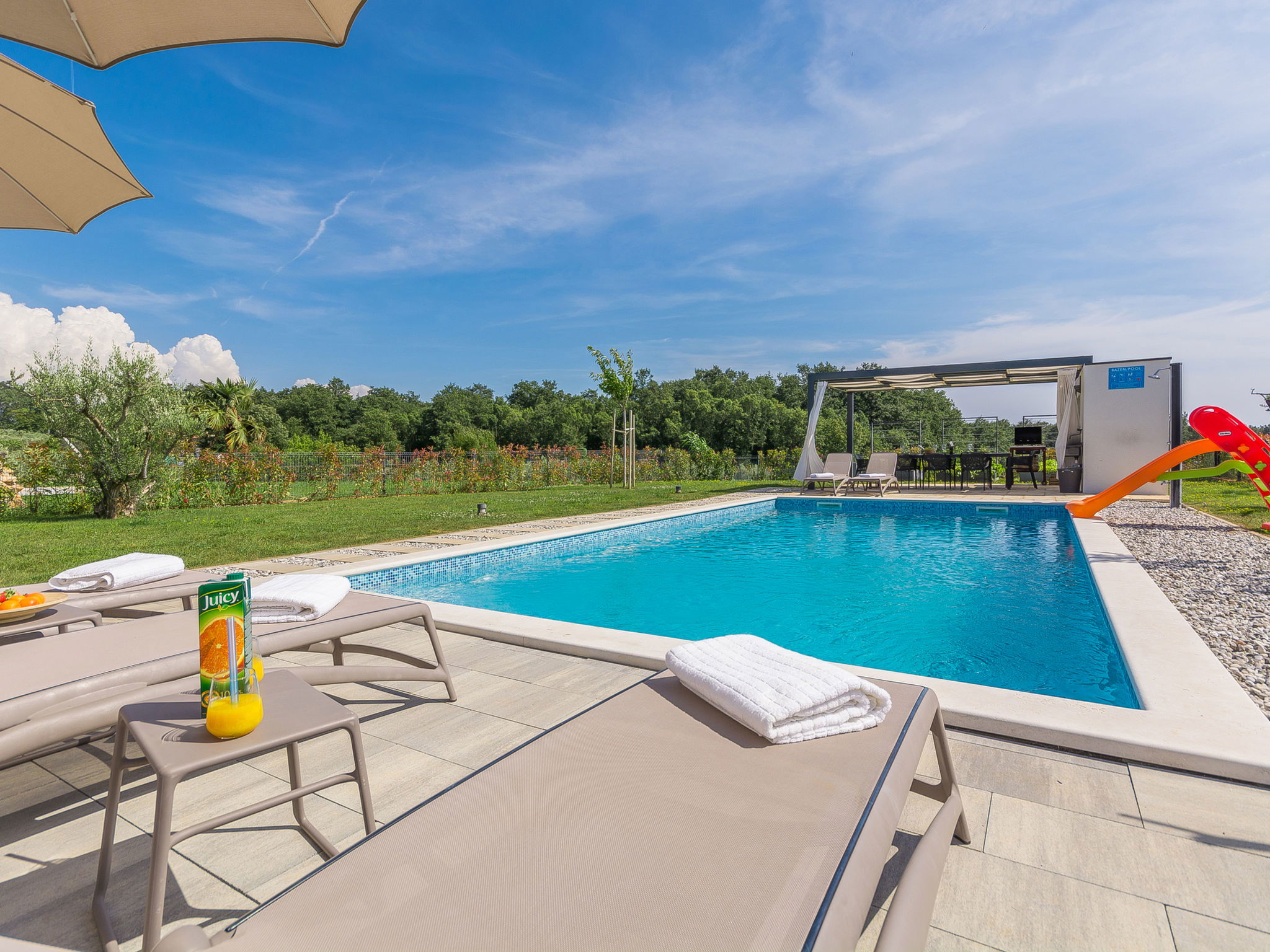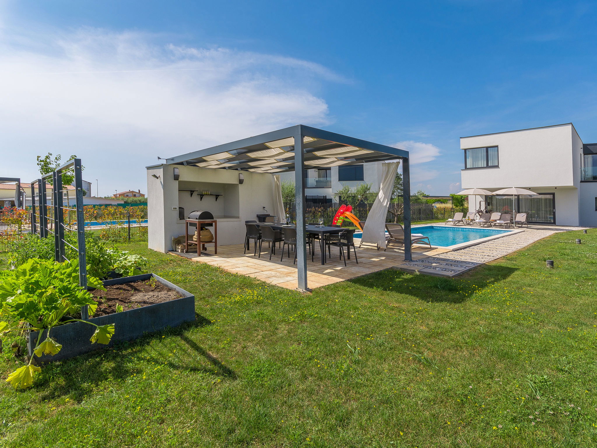 Moderne Villa "Paolo", auf 2 Stockwerken. Im Weiler Stancija Vinjeri, 2 km vom Zentrum von Novigrad, sonnige Lage, 3 km vom Meer, 3 km vom Strand. Zur Alleinbenutzung: Grundstück 1'100 m2 (eingezäunt), Garten mit Rasen, Schwimmbad eckig, beheizt (9 x 5 m, 140 cm tief, saisonale Verfügbarkeit: 01.Jan. - 31.Dez.) mit Innentreppe. Aussendusche, Sprudelbad, Laube (20 m2), Terrasse, Gartenmöbel. Im Hause: Internetzugang, Sauna, Tischfussball, Trampolin, Waschmaschine, Wäschetrockner. Parkplatz (für 3 Autos) beim Haus auf dem Grundstück. Einkaufsgeschäft 1.5 km, Supermarkt 1.5 km, Restaurant 500 m, Bushaltestelle 2 km, Kieselstrand 3 km, Felsstrand 3 km. Tennis 2 km, Wanderwege ab Haus 500 m, Radweg 550 m. Nahe gelegene Sehenswürdigkeiten: Aquapark 5 km. Bitte beachten: Flugplatz 20 km vom Haus. Schwimmbad beheizt (extra). Es ist notwendig 7 Tage im Voraus bekannt zu geben, ob die Schwimmbadheizung eingeschaltet werden soll. Verfügbar: Garten mit biologischem Obst und Gemüse der Saison (im Preis inbegriffen).