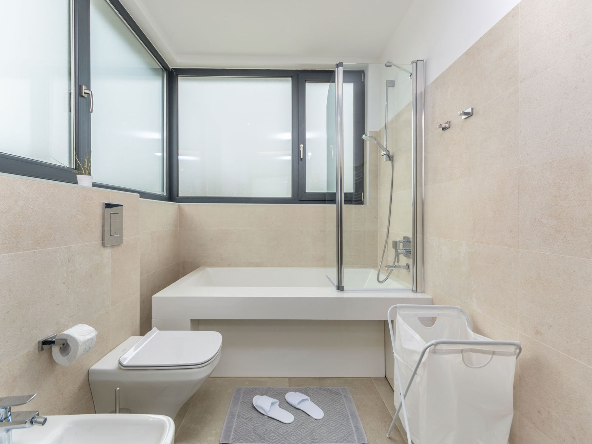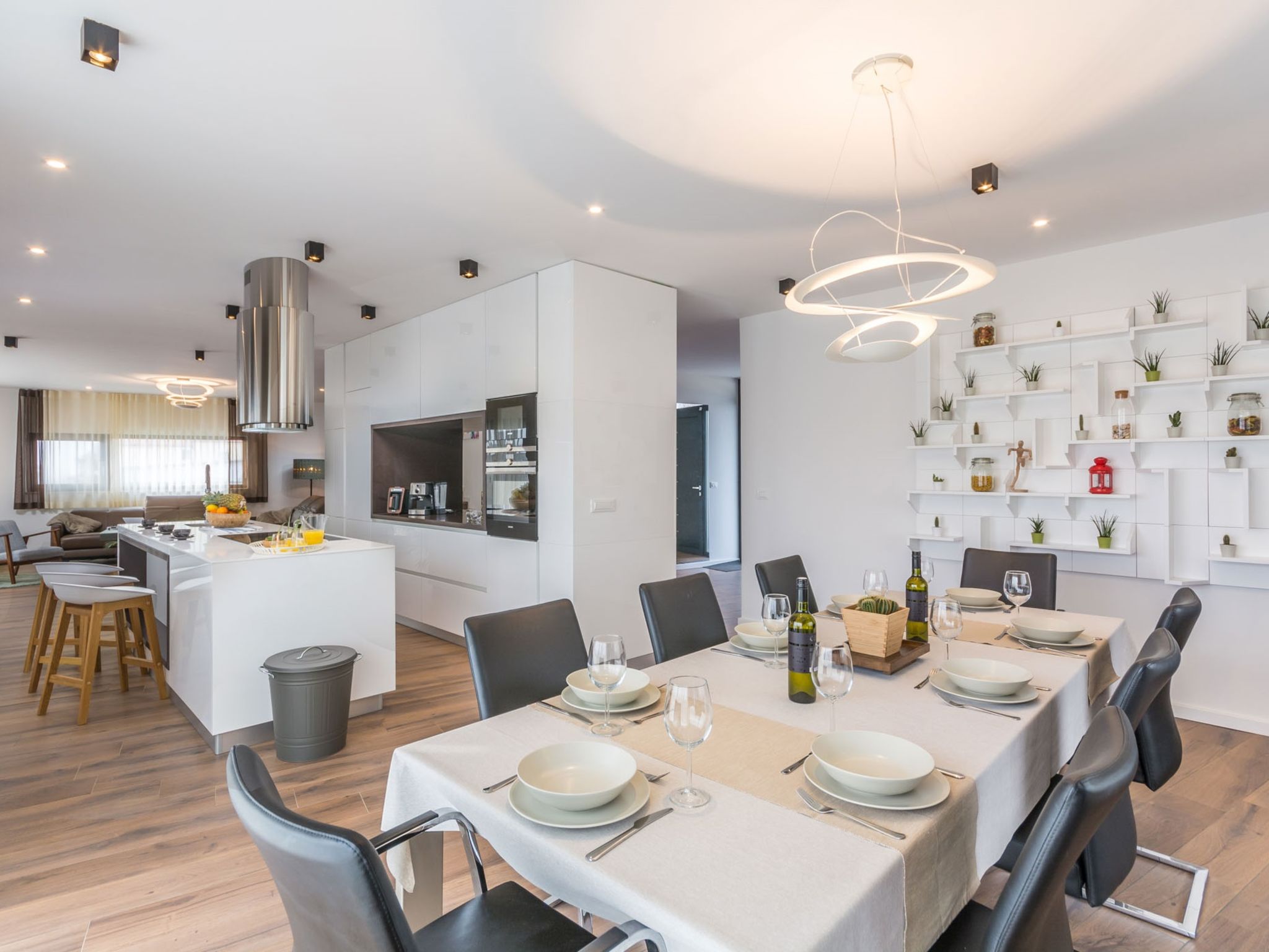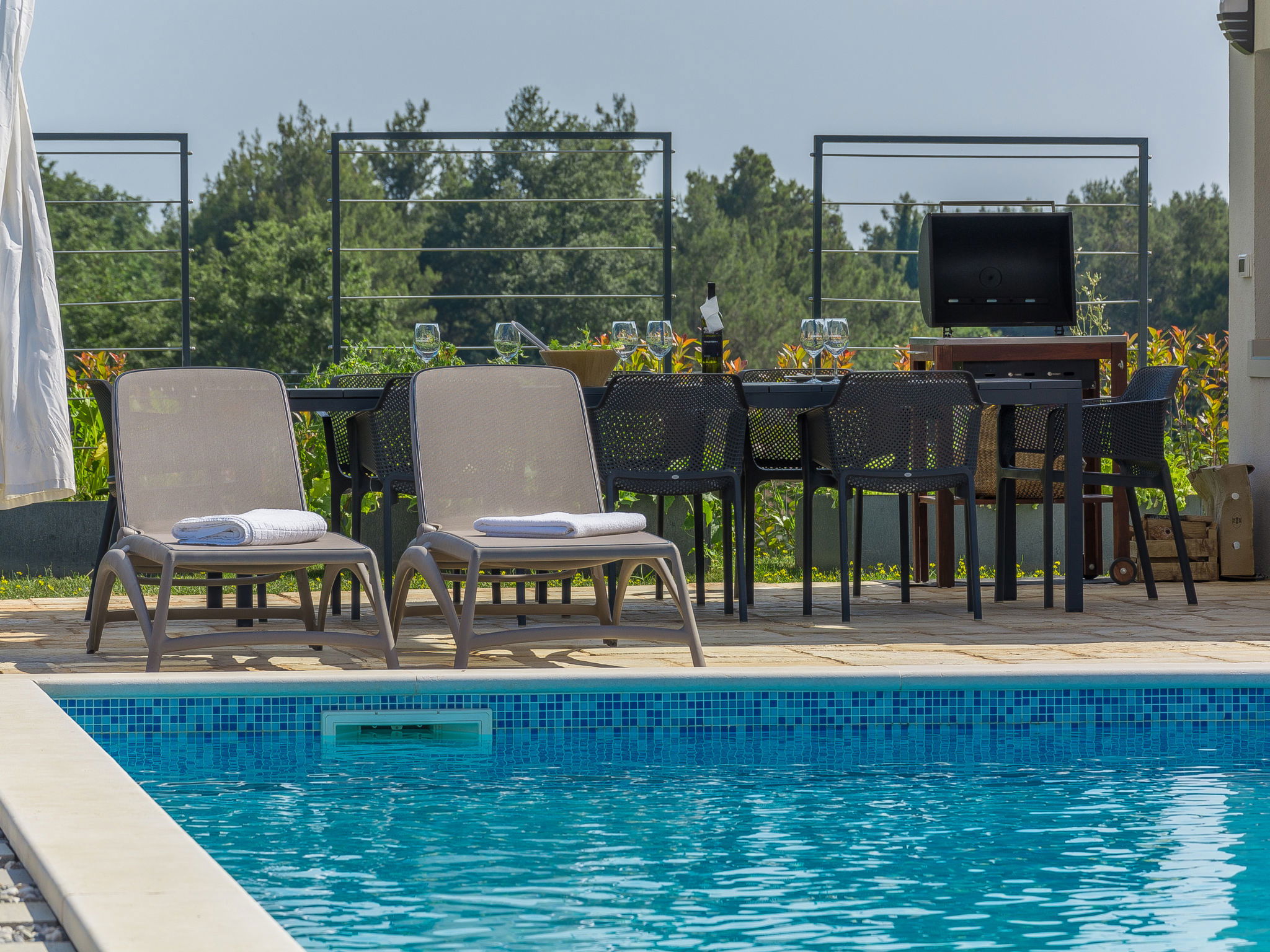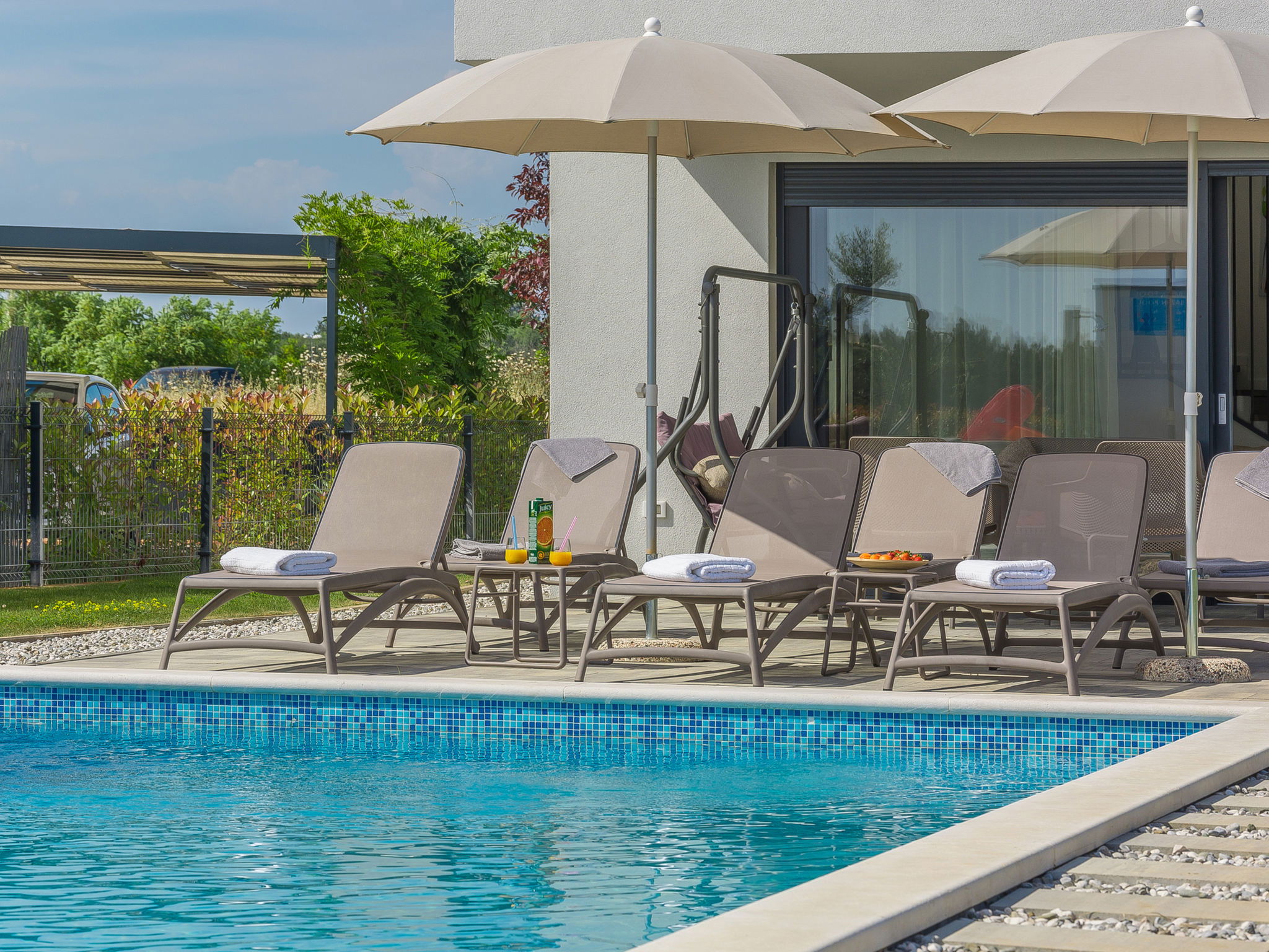 Moderne Villa "Paolo", auf 2 Stockwerken. Im Weiler Stancija Vinjeri, 2 km vom Zentrum von Novigrad, sonnige Lage, 3 km vom Meer, 3 km vom Strand. Zur Alleinbenutzung: Grundstück 1'100 m2 (eingezäunt), Garten mit Rasen, Schwimmbad eckig, beheizt (9 x 5 m, 140 cm tief, saisonale Verfügbarkeit: 01.Jan. - 31.Dez.) mit Innentreppe. Aussendusche, Sprudelbad, Laube (20 m2), Terrasse, Gartenmöbel. Im Hause: Internetzugang, Sauna, Tischfussball, Trampolin, Waschmaschine, Wäschetrockner. Parkplatz (für 3 Autos) beim Haus auf dem Grundstück. Einkaufsgeschäft 1.5 km, Supermarkt 1.5 km, Restaurant 500 m, Bushaltestelle 2 km, Kieselstrand 3 km, Felsstrand 3 km. Tennis 2 km, Wanderwege ab Haus 500 m, Radweg 550 m. Nahe gelegene Sehenswürdigkeiten: Aquapark 5 km. Bitte beachten: Flugplatz 20 km vom Haus. Schwimmbad beheizt (extra). Es ist notwendig 7 Tage im Voraus bekannt zu geben, ob die Schwimmbadheizung eingeschaltet werden soll. Verfügbar: Garten mit biologischem Obst und Gemüse der Saison (im Preis inbegriffen).