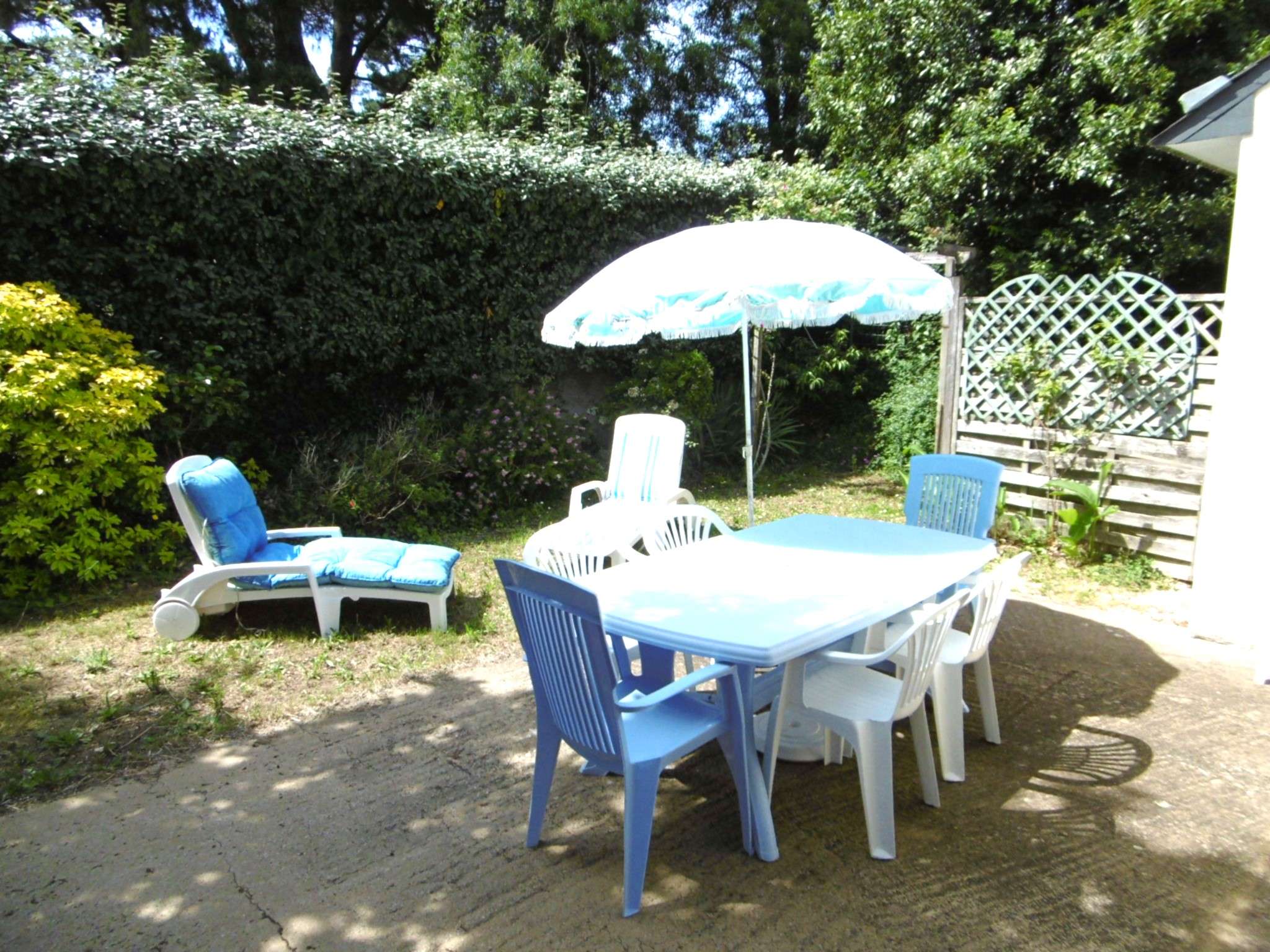 - Ein nicht umzäunter Garten mit einer Terrasse, die mit Gartenmöbeln und einem Grill ausgestattet ist