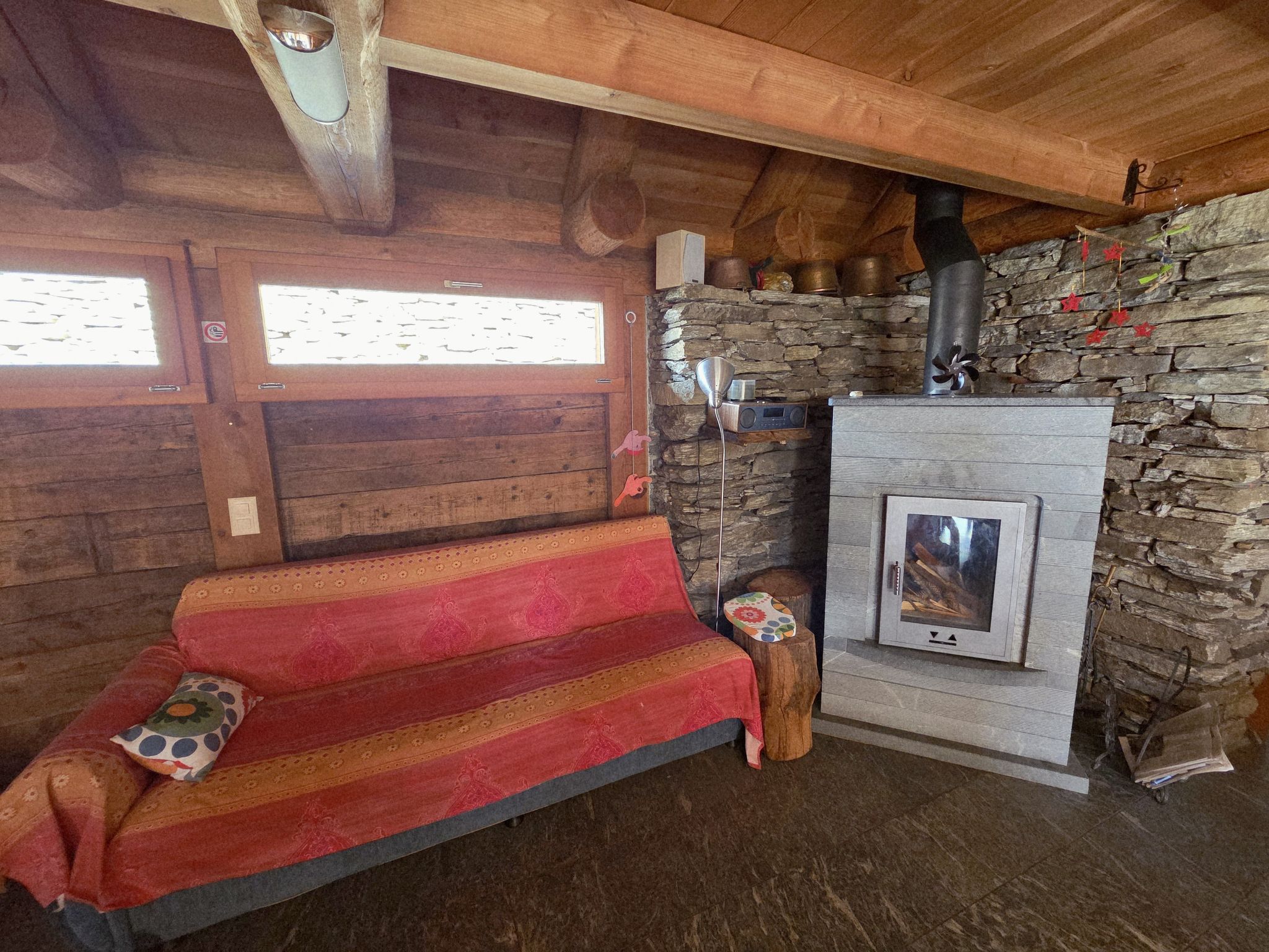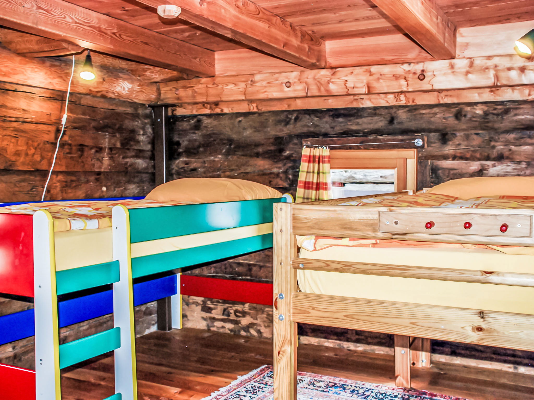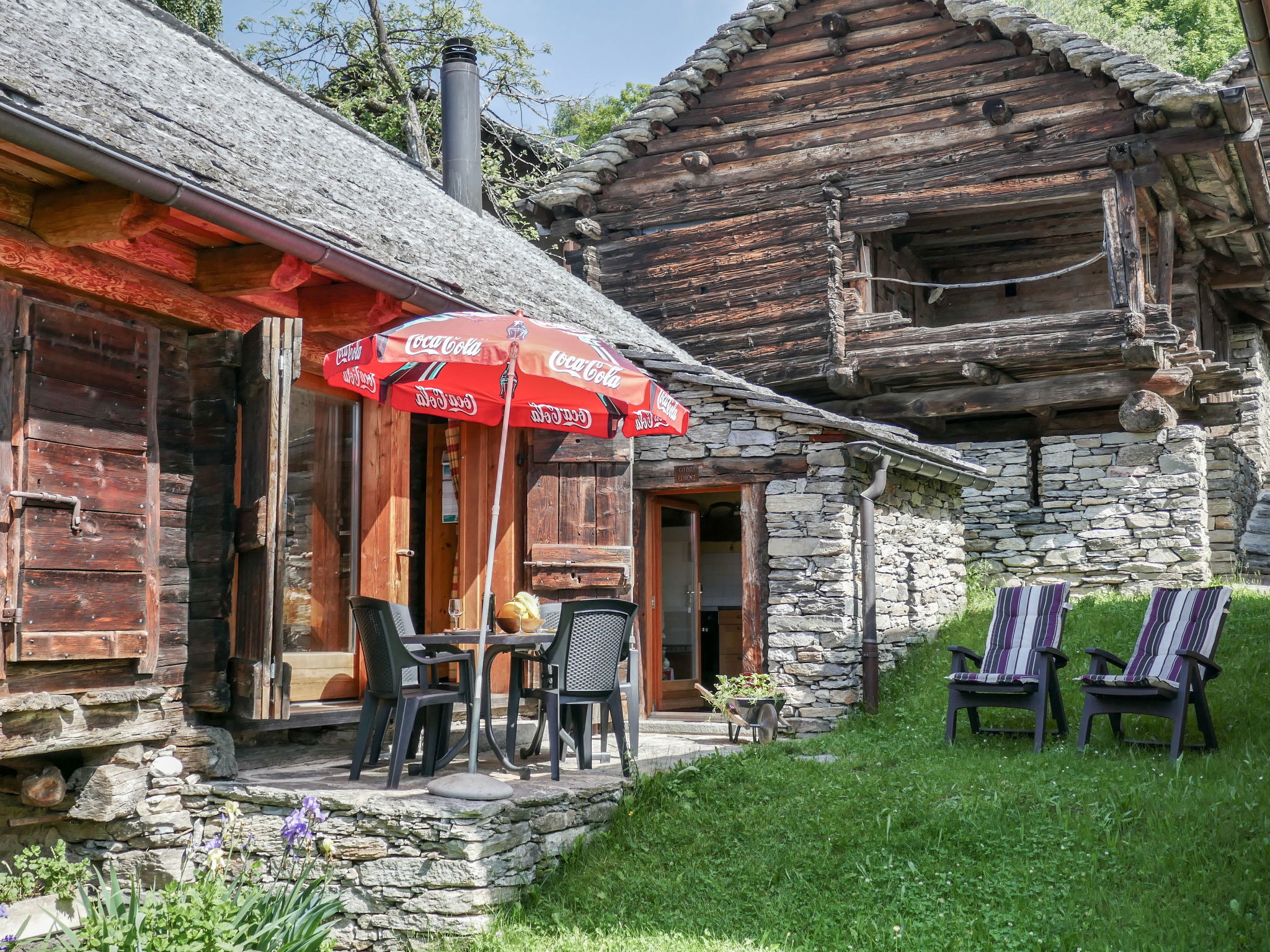 "Rustico Cà dru Lurenz", 5-Zimmer-Landhaus 110 m2 auf 2 Stockwerken. Teilweise abgeschrägt, rustikal und gemütlich eingerichtet: offenes Wohn-/Esszimmer mit Schwedenofen, Radio und Stereoanlage. Ausgang zum Garten. 1 Doppelzimmer mit 1 Doppelbett (2 x 90 cm, Länge 200 cm). 1 Zimmer mit 2 x 1 Etagenbetten (90 cm, Länge 200 cm). Offene Küche (Backofen, Gasherd, 4 Flammen, Fondue Set (Chinoise, Käse)) mit Holzofen. Ausgang zum Gartensitzplatz. Dusche/WC. Holzheizung. Solarstrom. Obergeschoss: offene Galerie mit 1 Diwanbett und Sat-TV (Flachbildschirm). 1 abgeschrägtes Doppelzimmer mit 1 Doppelbett (2 x 90 cm, Länge 200 cm). Gartensitzplatz, kleiner Garten. Terrassenmöbel, Gartengrill (mobil), Liegestühle (4). Panoramasicht auf die Berge, das Tal und die Landschaft. Zur Verfügung: Kinderhochstuhl, Babybett bis 2 Jahre (extra). Bitte beachten: Nichtraucher-Haus. Maximal 2 Haustiere/Hunde erlaubt. Feuerlöscher. Achtung: Es kann 1 Zusatzbett gebucht werden. NL-00005424