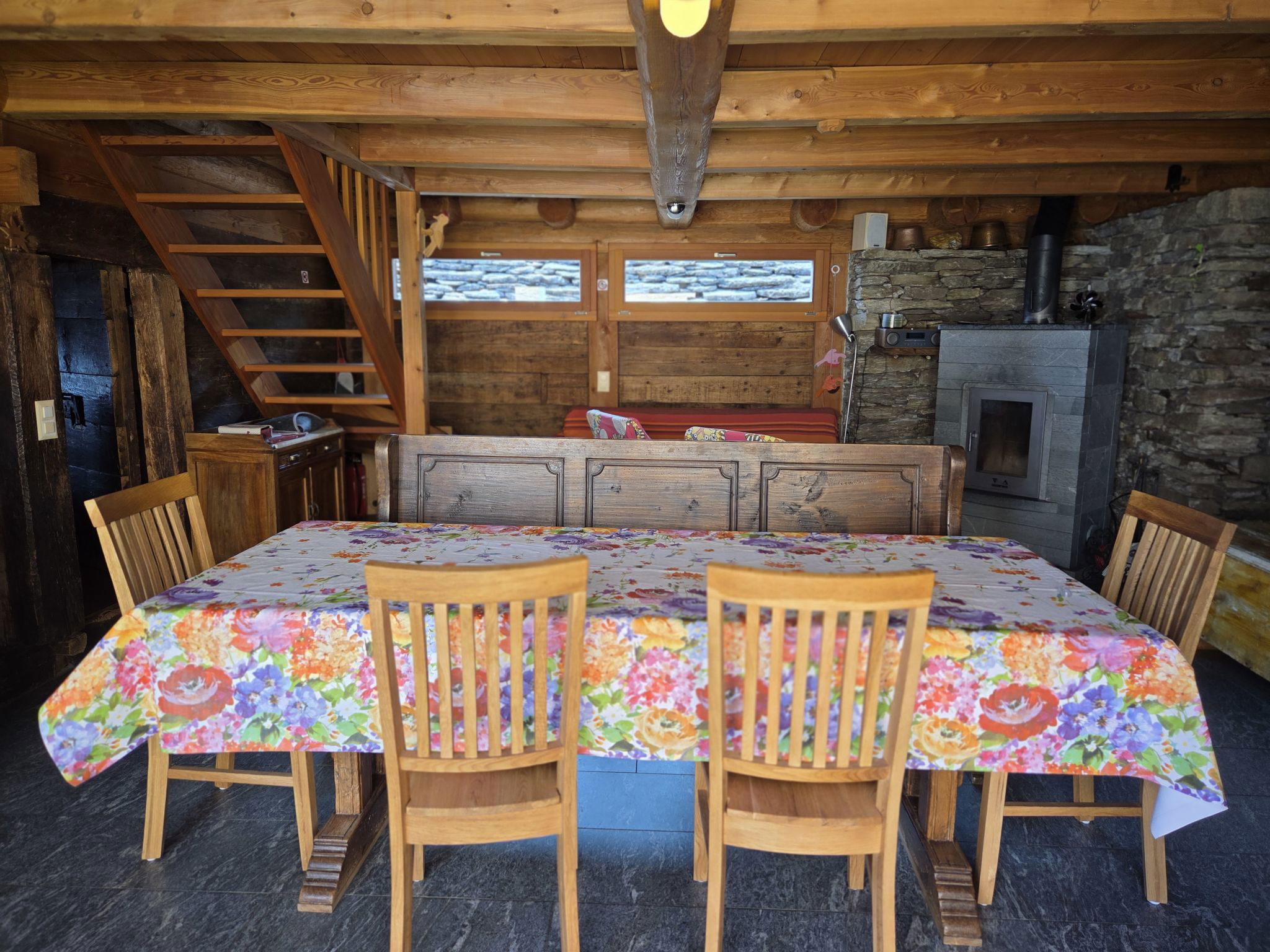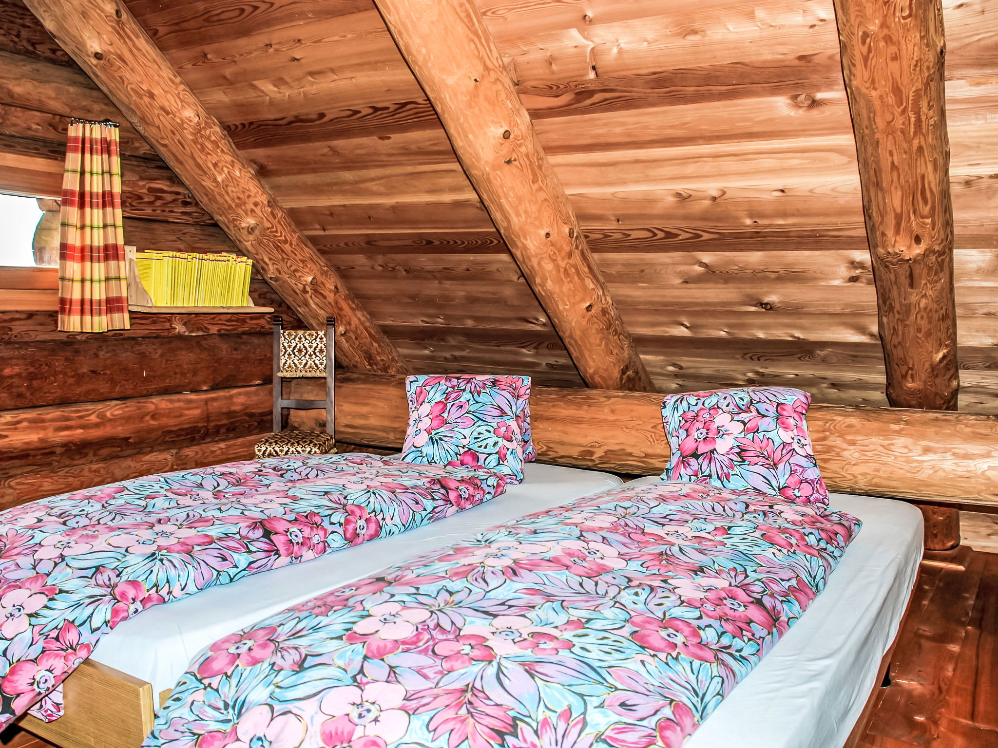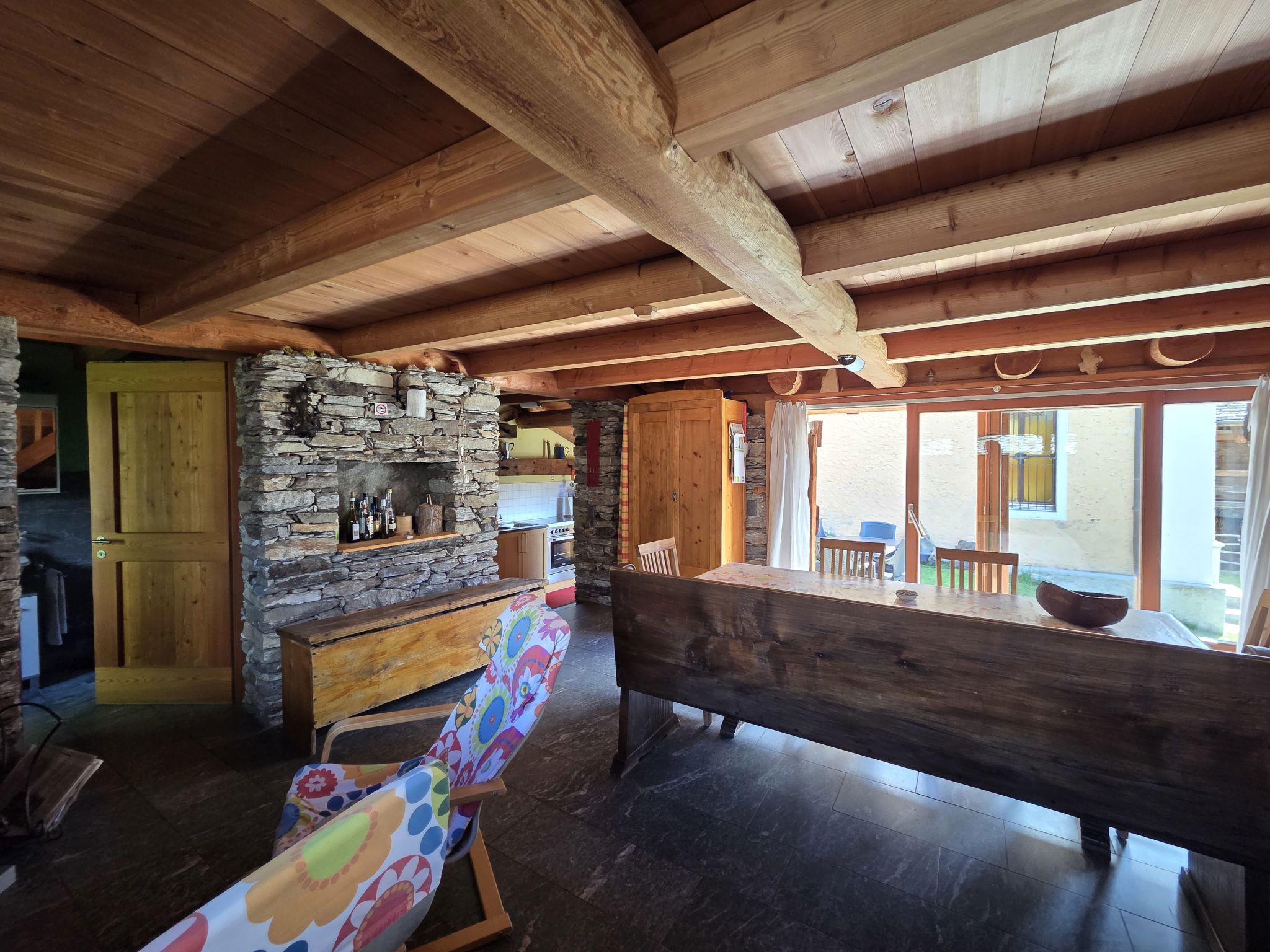 "Rustico Cà dru Lurenz", 5-Zimmer-Landhaus 110 m2 auf 2 Stockwerken. Teilweise abgeschrägt, rustikal und gemütlich eingerichtet: offenes Wohn-/Esszimmer mit Schwedenofen, Radio und Stereoanlage. Ausgang zum Garten. 1 Doppelzimmer mit 1 Doppelbett (2 x 90 cm, Länge 200 cm). 1 Zimmer mit 2 x 1 Etagenbetten (90 cm, Länge 200 cm). Offene Küche (Backofen, Gasherd, 4 Flammen, Fondue Set (Chinoise, Käse)) mit Holzofen. Ausgang zum Gartensitzplatz. Dusche/WC. Holzheizung. Solarstrom. Obergeschoss: offene Galerie mit 1 Diwanbett und Sat-TV (Flachbildschirm). 1 abgeschrägtes Doppelzimmer mit 1 Doppelbett (2 x 90 cm, Länge 200 cm). Gartensitzplatz, kleiner Garten. Terrassenmöbel, Gartengrill (mobil), Liegestühle (4). Panoramasicht auf die Berge, das Tal und die Landschaft. Zur Verfügung: Kinderhochstuhl, Babybett bis 2 Jahre (extra). Bitte beachten: Nichtraucher-Haus. Maximal 2 Haustiere/Hunde erlaubt. Feuerlöscher. Achtung: Es kann 1 Zusatzbett gebucht werden. NL-00005424