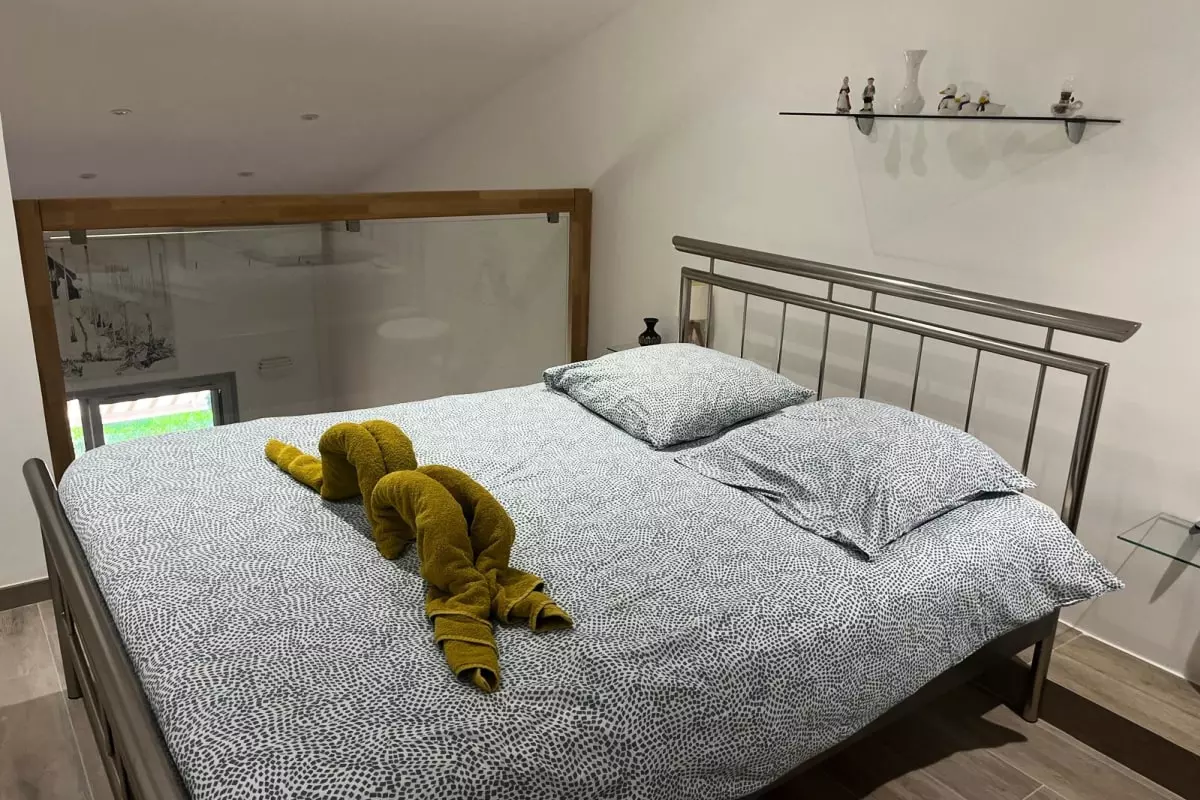 - ein Schlafbereich im Zwischengeschoss mit einem Doppelbett;