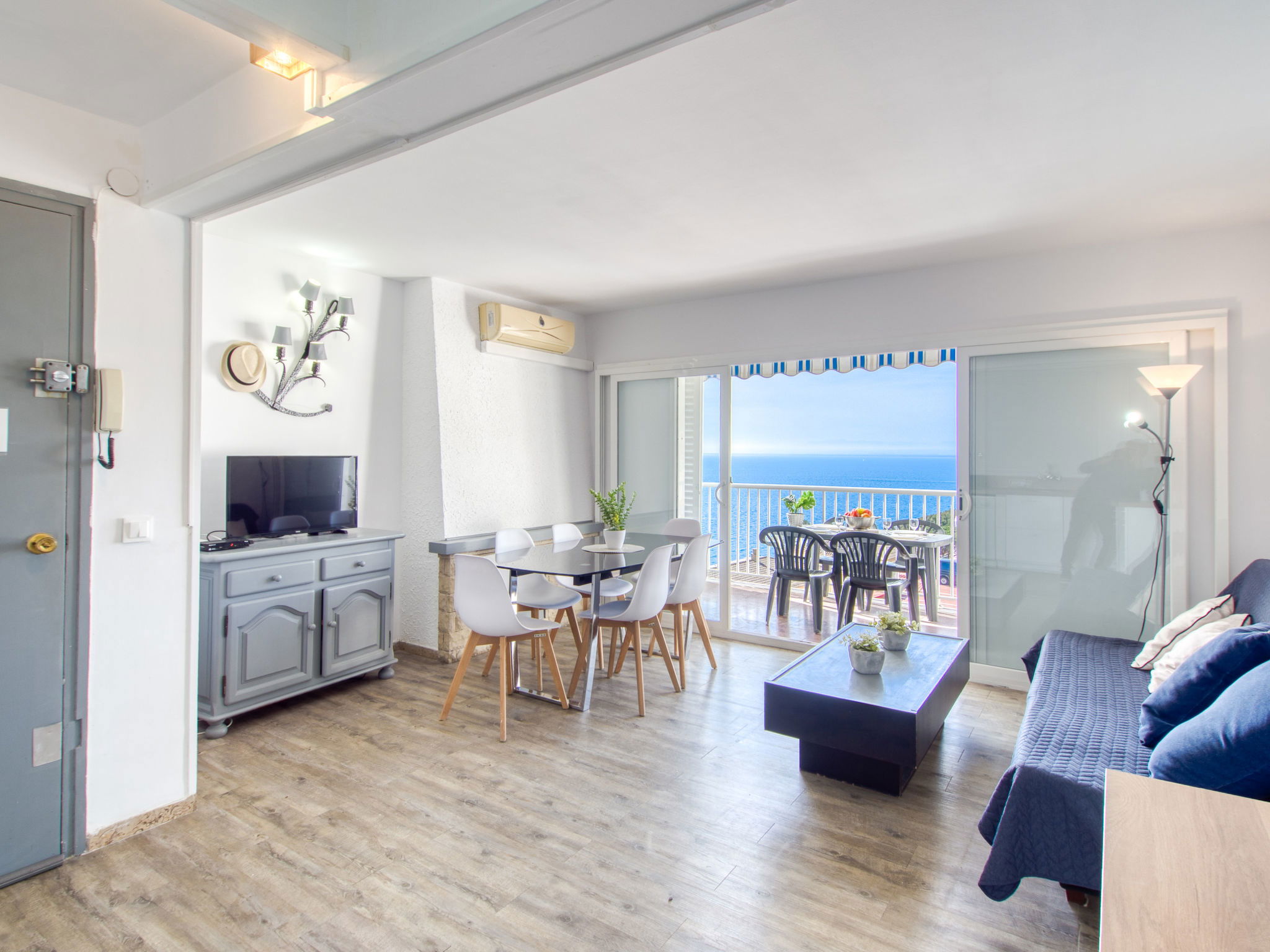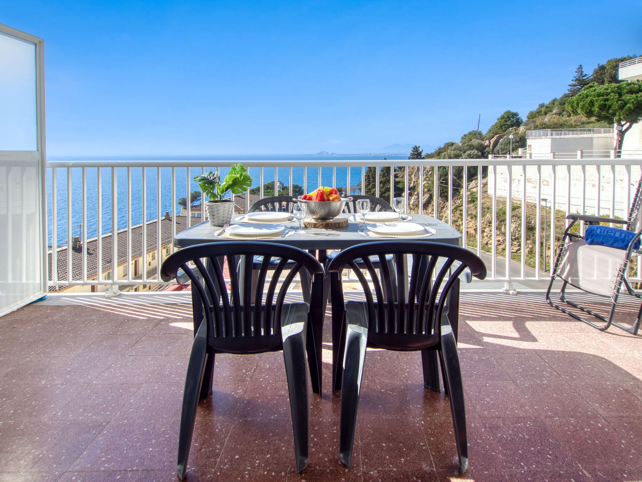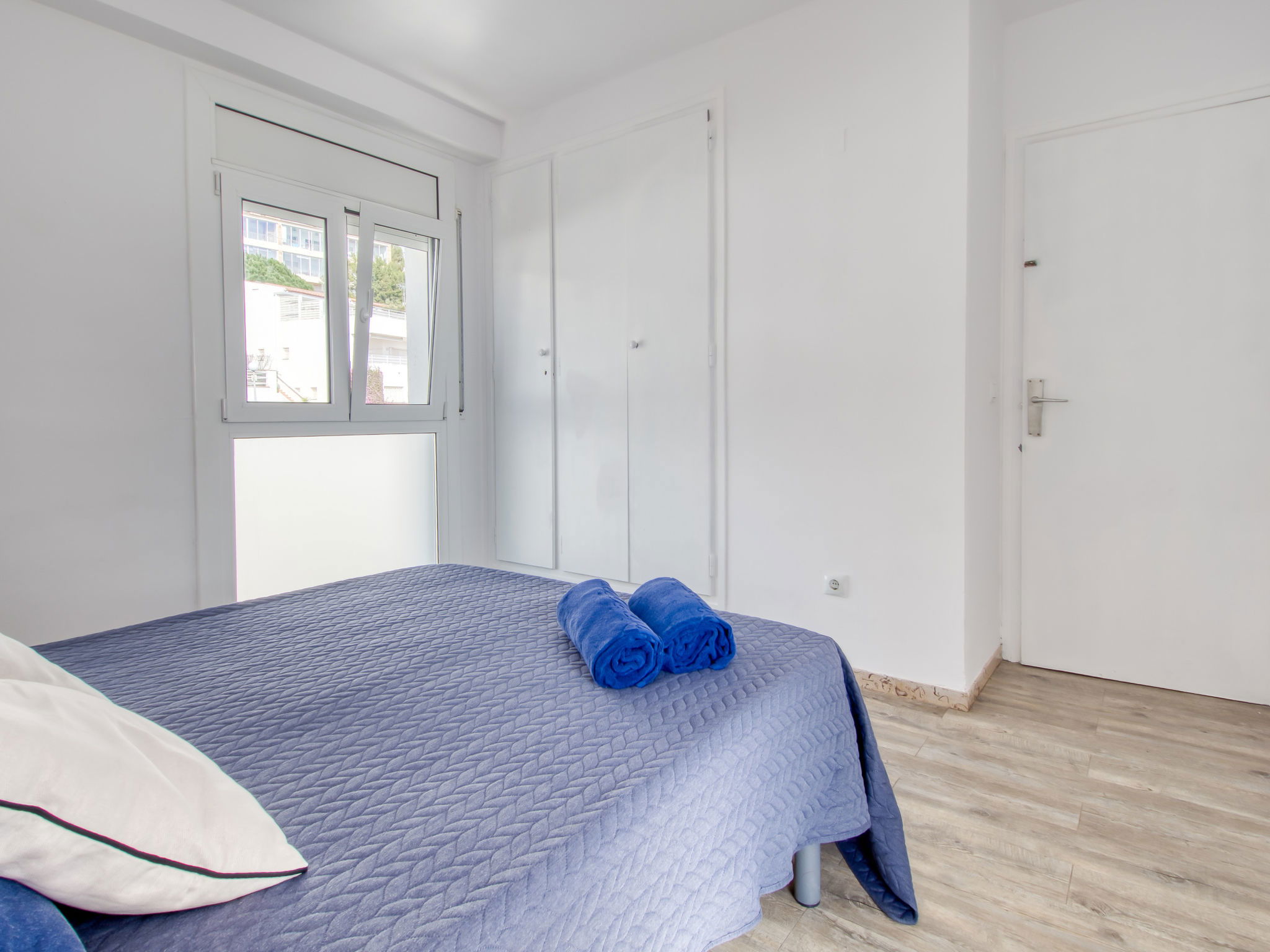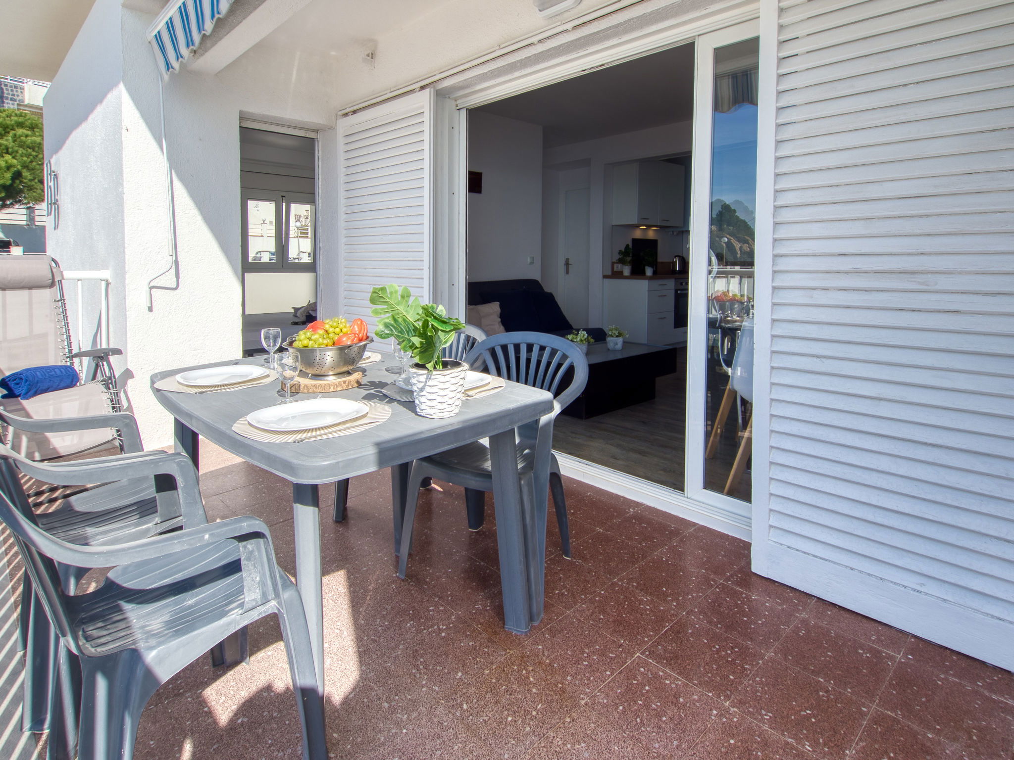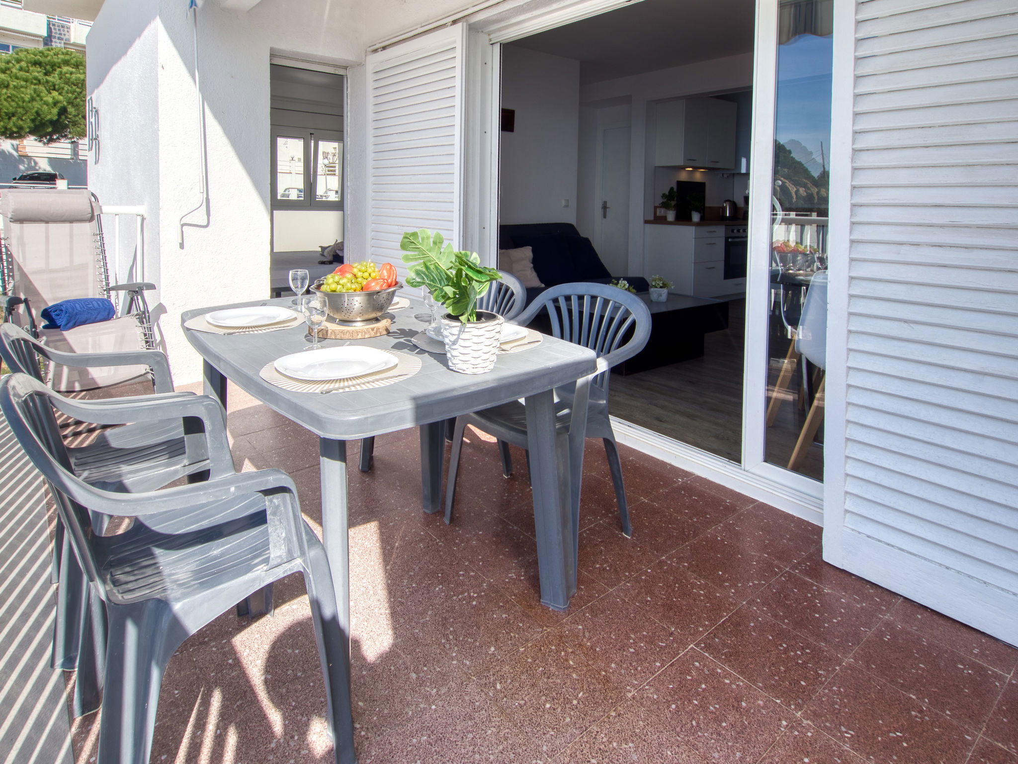 3-Zimmer-Wohnung 45 m2. Hell, teilweise renoviert im Jahre 2025, modern und gemütlich eingerichtet: Wohn-/Esszimmer mit Esstisch, Sat-TV, Klimaanlage und Warmluftheizung. Ausgang zum Balkon. 1 Zimmer mit 1 franz. Bett (150 cm, Länge 190 cm). 1 Zimmer mit 2 Betten (90 cm, Länge 190 cm). Offene Küche (Geschirrspüler, 3 Induktionskochplatten, Toaster, Wasserkocher, Mikrowelle, Tiefkühler, elektrische Kaffeemaschine). Dusche/WC. Terrasse 10 m2. Terrassenmöbel. Panoramasicht auf das Meer und die Berge. Zur Verfügung: Waschmaschine, Bügeleisen, Haartrockner. Internet (WLAN, gratis). Parkplatz Nr. Blaumar 1. Bitte beachten: Nichtraucher-Unterkunft. Maximal 1 kleines Haustier/Hund erlaubt. TV nur FR, ES.