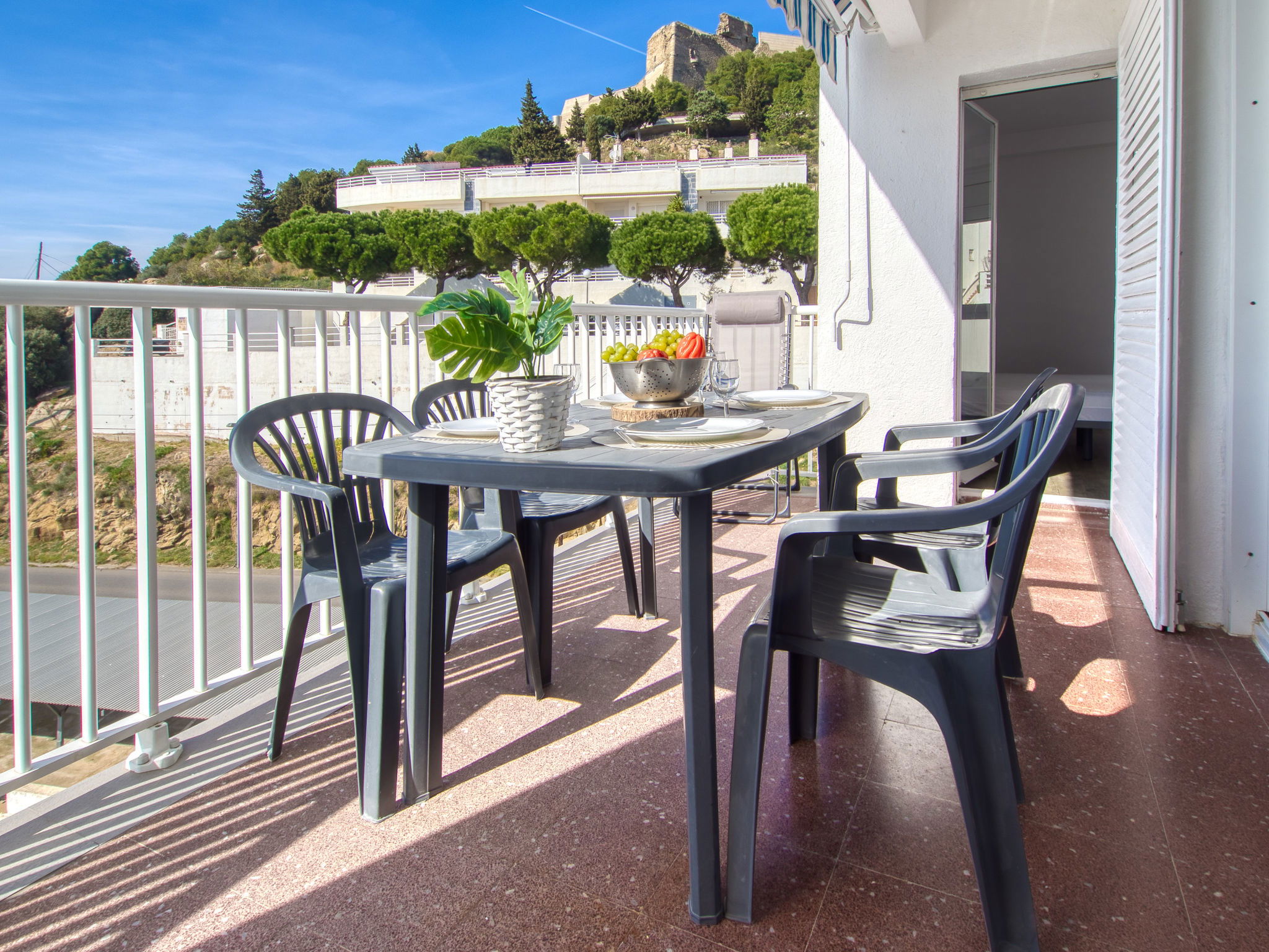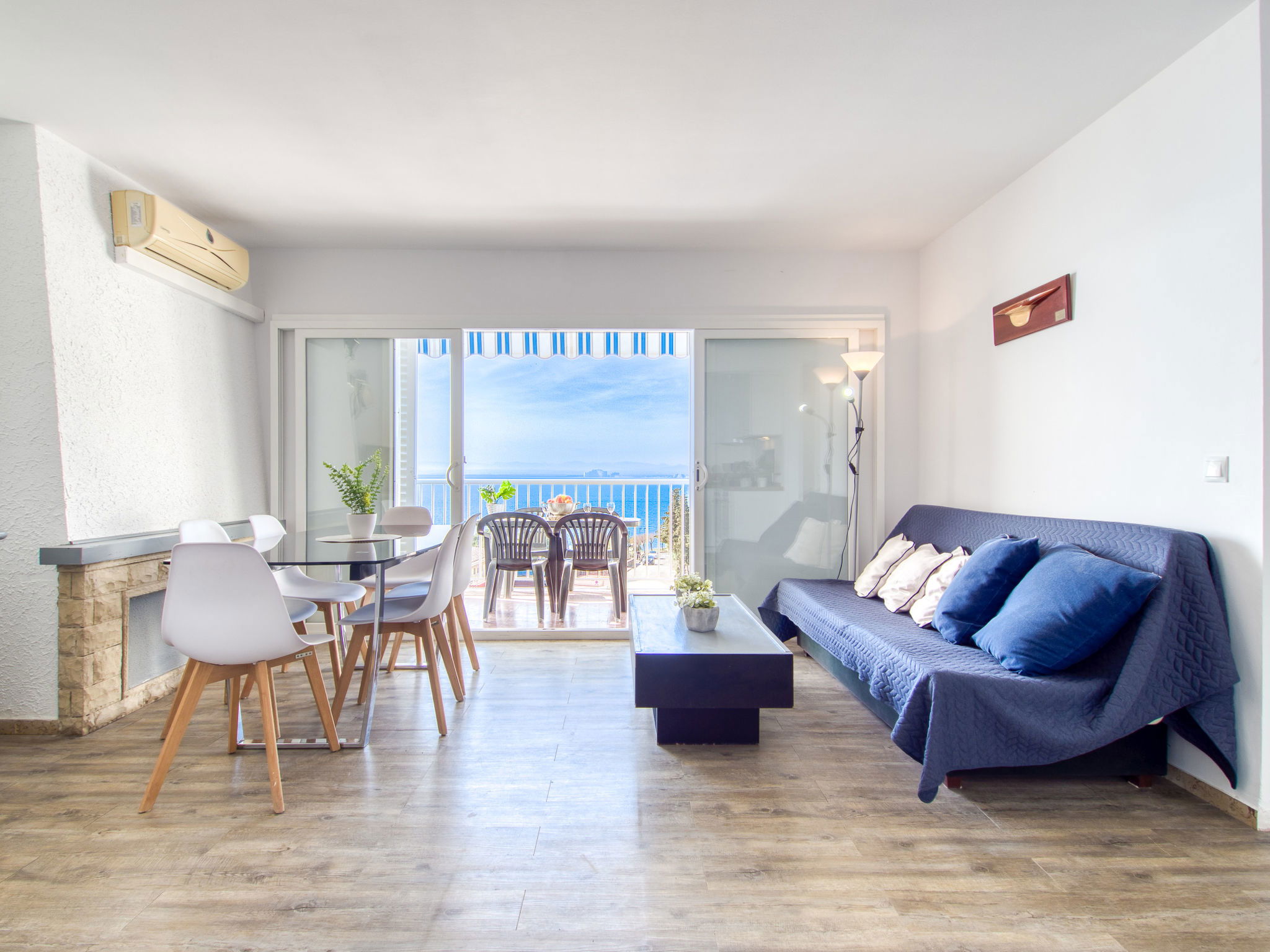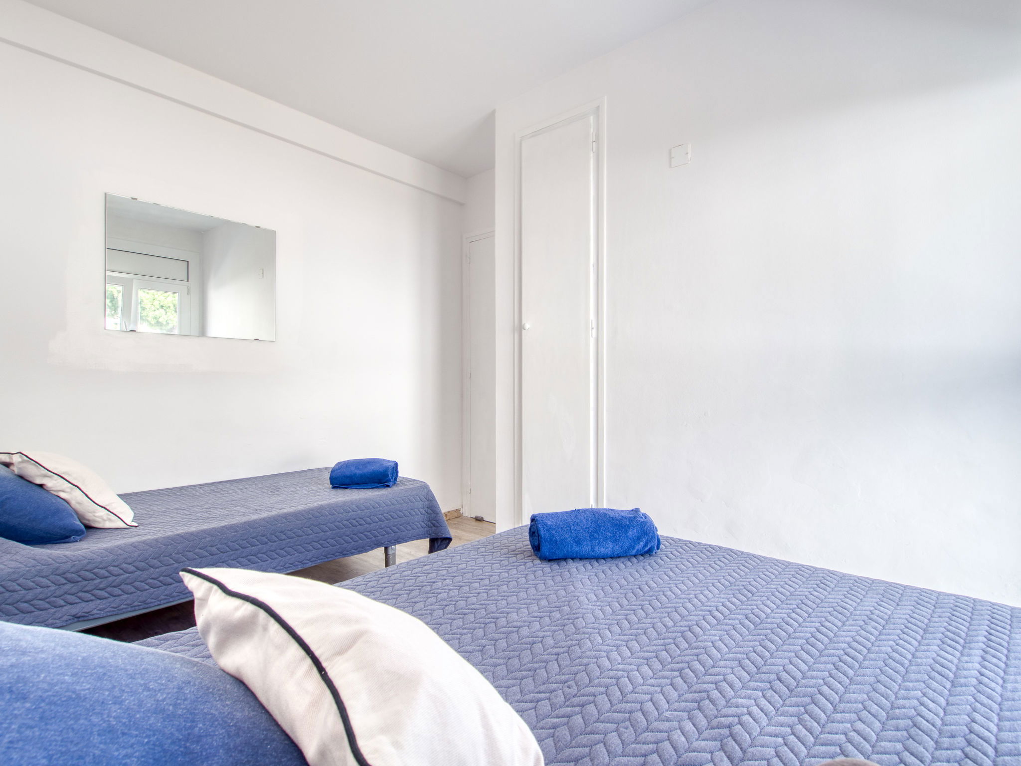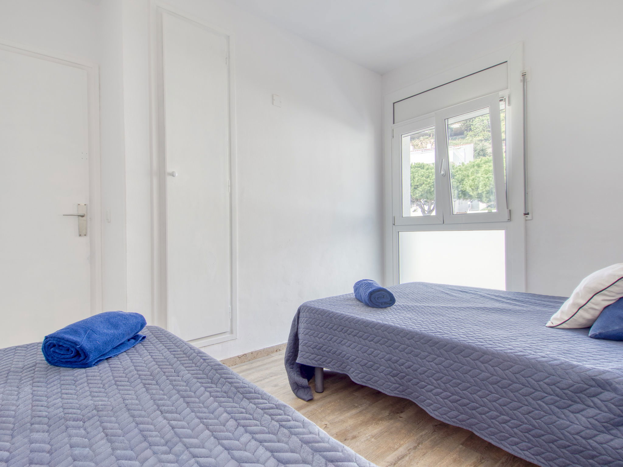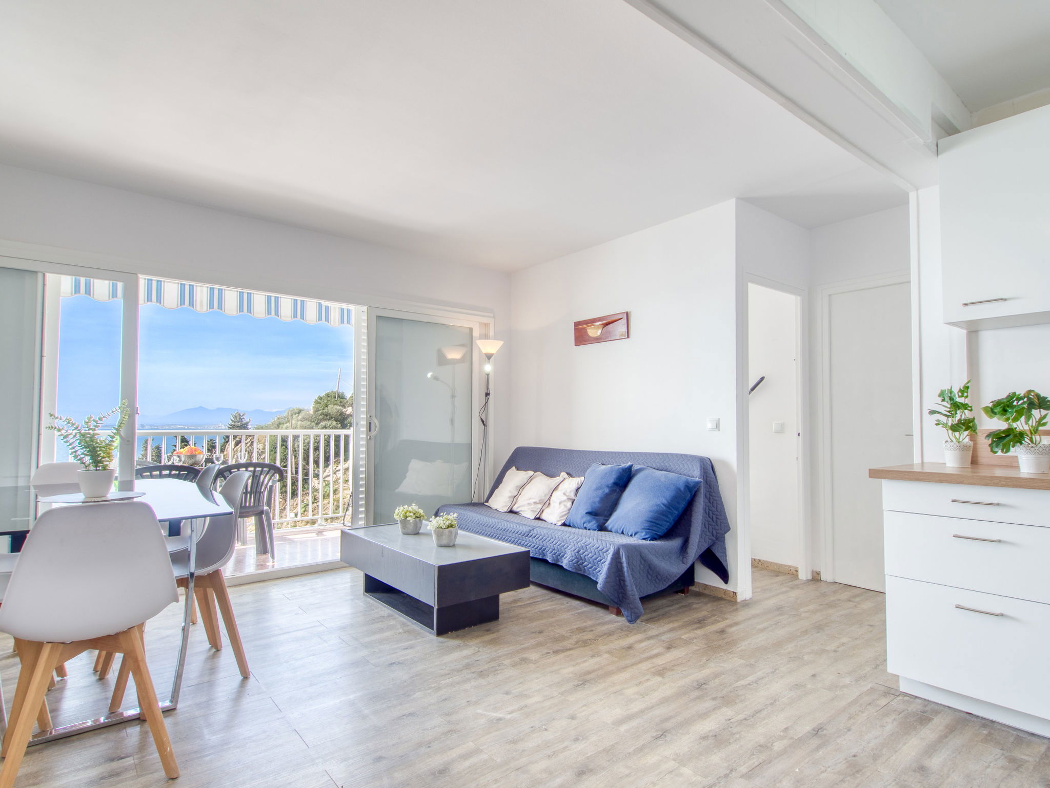 3-Zimmer-Wohnung 45 m2. Hell, teilweise renoviert im Jahre 2025, modern und gemütlich eingerichtet: Wohn-/Esszimmer mit Esstisch, Sat-TV, Klimaanlage und Warmluftheizung. Ausgang zum Balkon. 1 Zimmer mit 1 franz. Bett (150 cm, Länge 190 cm). 1 Zimmer mit 2 Betten (90 cm, Länge 190 cm). Offene Küche (Geschirrspüler, 3 Induktionskochplatten, Toaster, Wasserkocher, Mikrowelle, Tiefkühler, elektrische Kaffeemaschine). Dusche/WC. Terrasse 10 m2. Terrassenmöbel. Panoramasicht auf das Meer und die Berge. Zur Verfügung: Waschmaschine, Bügeleisen, Haartrockner. Internet (WLAN, gratis). Parkplatz Nr. Blaumar 1. Bitte beachten: Nichtraucher-Unterkunft. Maximal 1 kleines Haustier/Hund erlaubt. TV nur FR, ES.