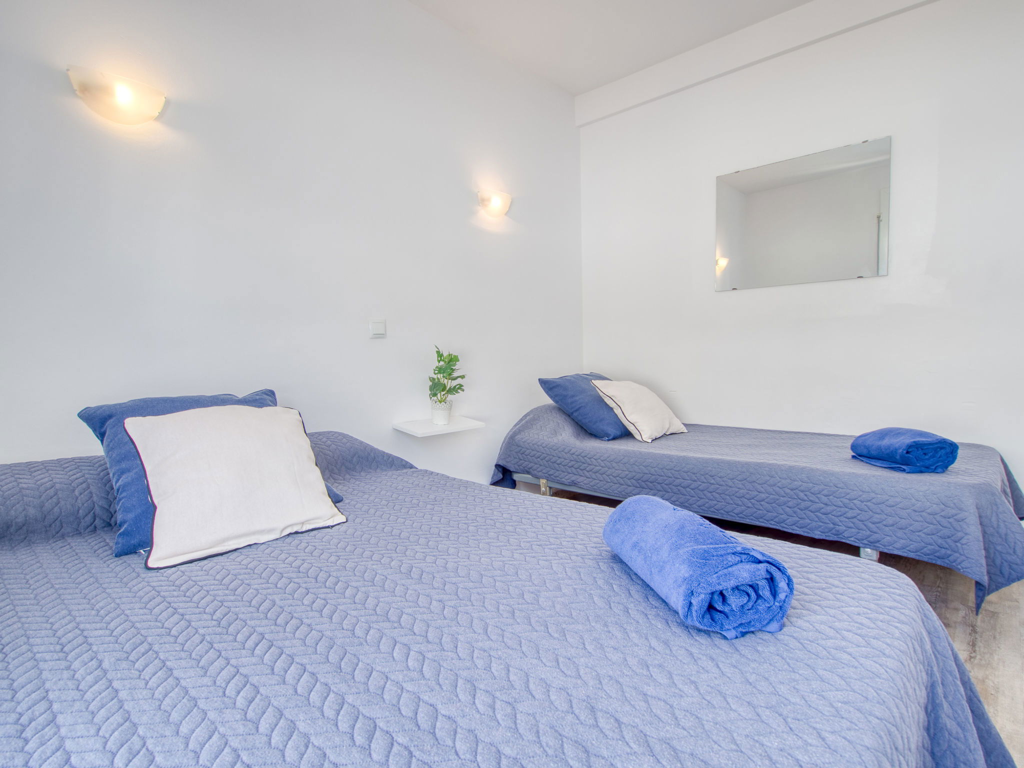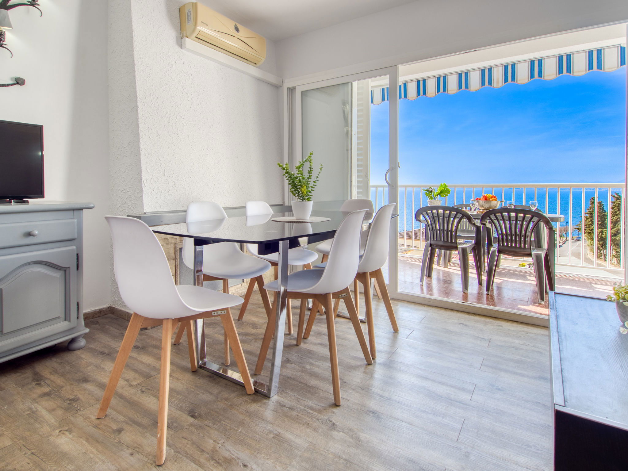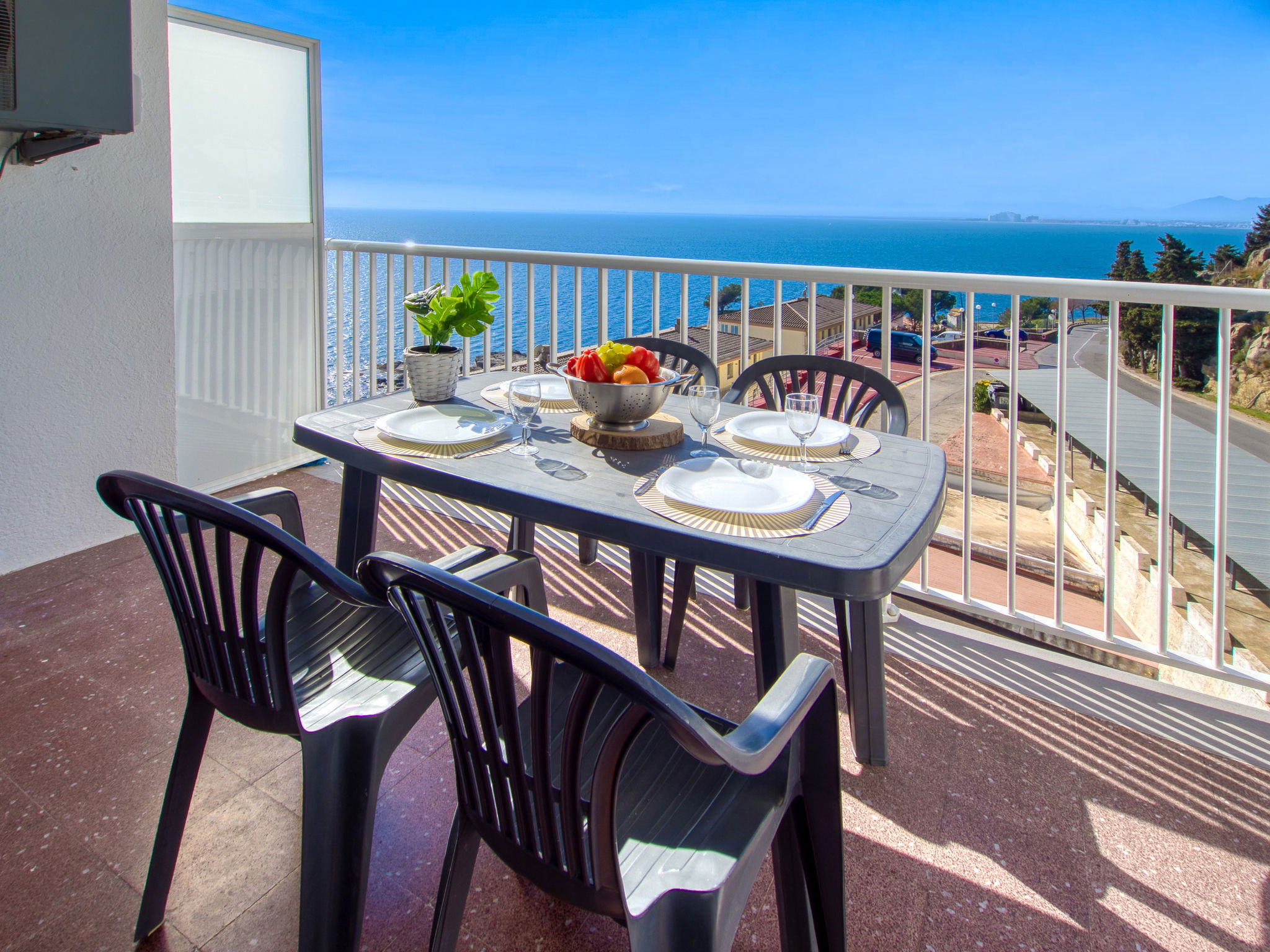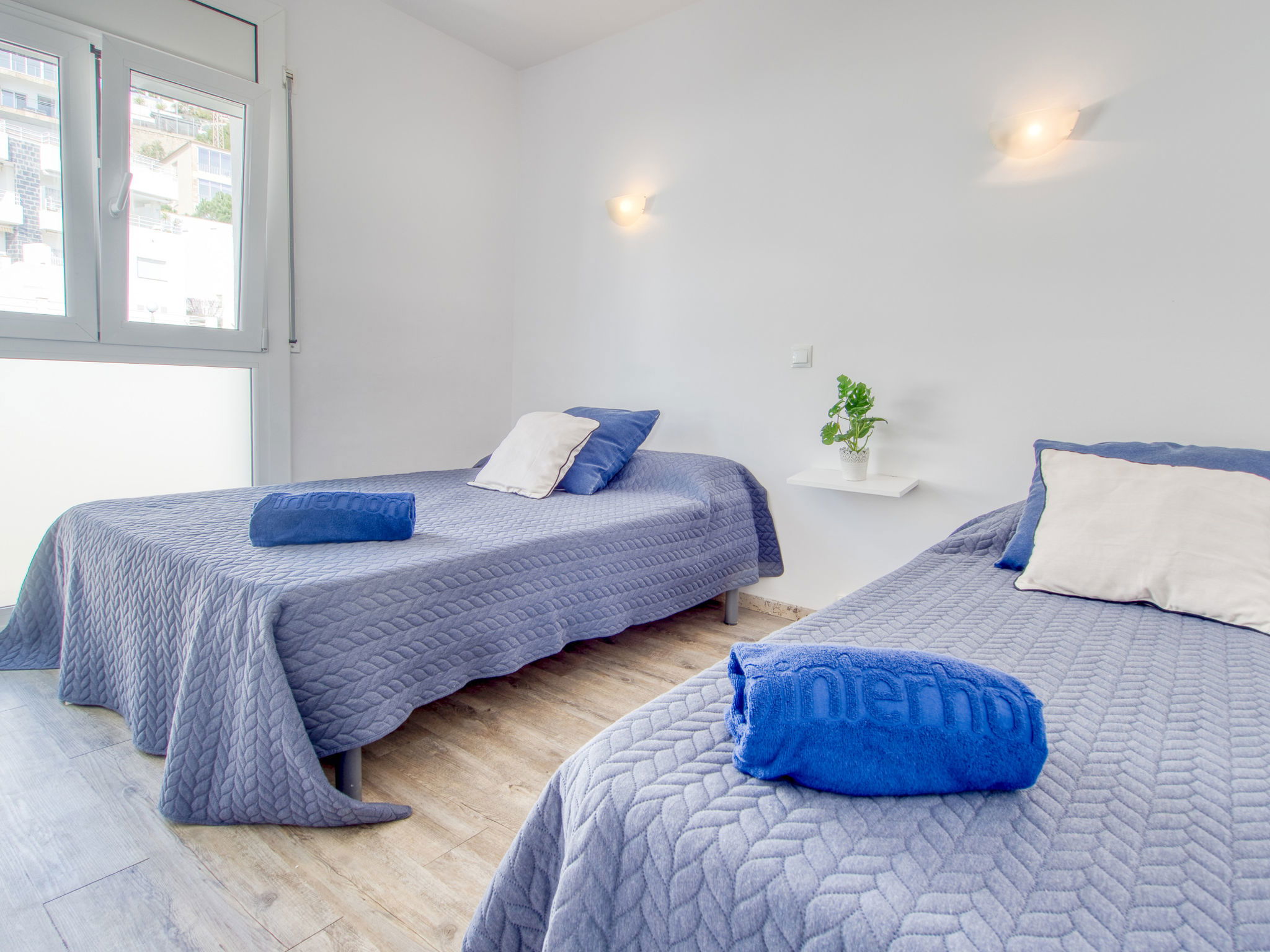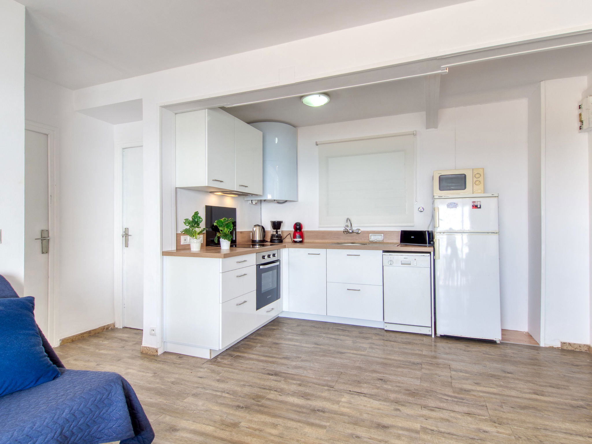 3-Zimmer-Wohnung 45 m2. Hell, teilweise renoviert im Jahre 2025, modern und gemütlich eingerichtet: Wohn-/Esszimmer mit Esstisch, Sat-TV, Klimaanlage und Warmluftheizung. Ausgang zum Balkon. 1 Zimmer mit 1 franz. Bett (150 cm, Länge 190 cm). 1 Zimmer mit 2 Betten (90 cm, Länge 190 cm). Offene Küche (Geschirrspüler, 3 Induktionskochplatten, Toaster, Wasserkocher, Mikrowelle, Tiefkühler, elektrische Kaffeemaschine). Dusche/WC. Terrasse 10 m2. Terrassenmöbel. Panoramasicht auf das Meer und die Berge. Zur Verfügung: Waschmaschine, Bügeleisen, Haartrockner. Internet (WLAN, gratis). Parkplatz Nr. Blaumar 1. Bitte beachten: Nichtraucher-Unterkunft. Maximal 1 kleines Haustier/Hund erlaubt. TV nur FR, ES.