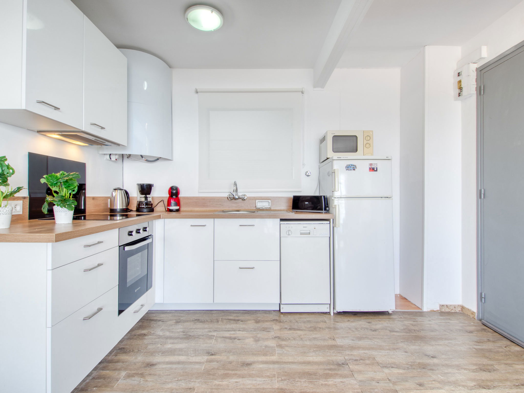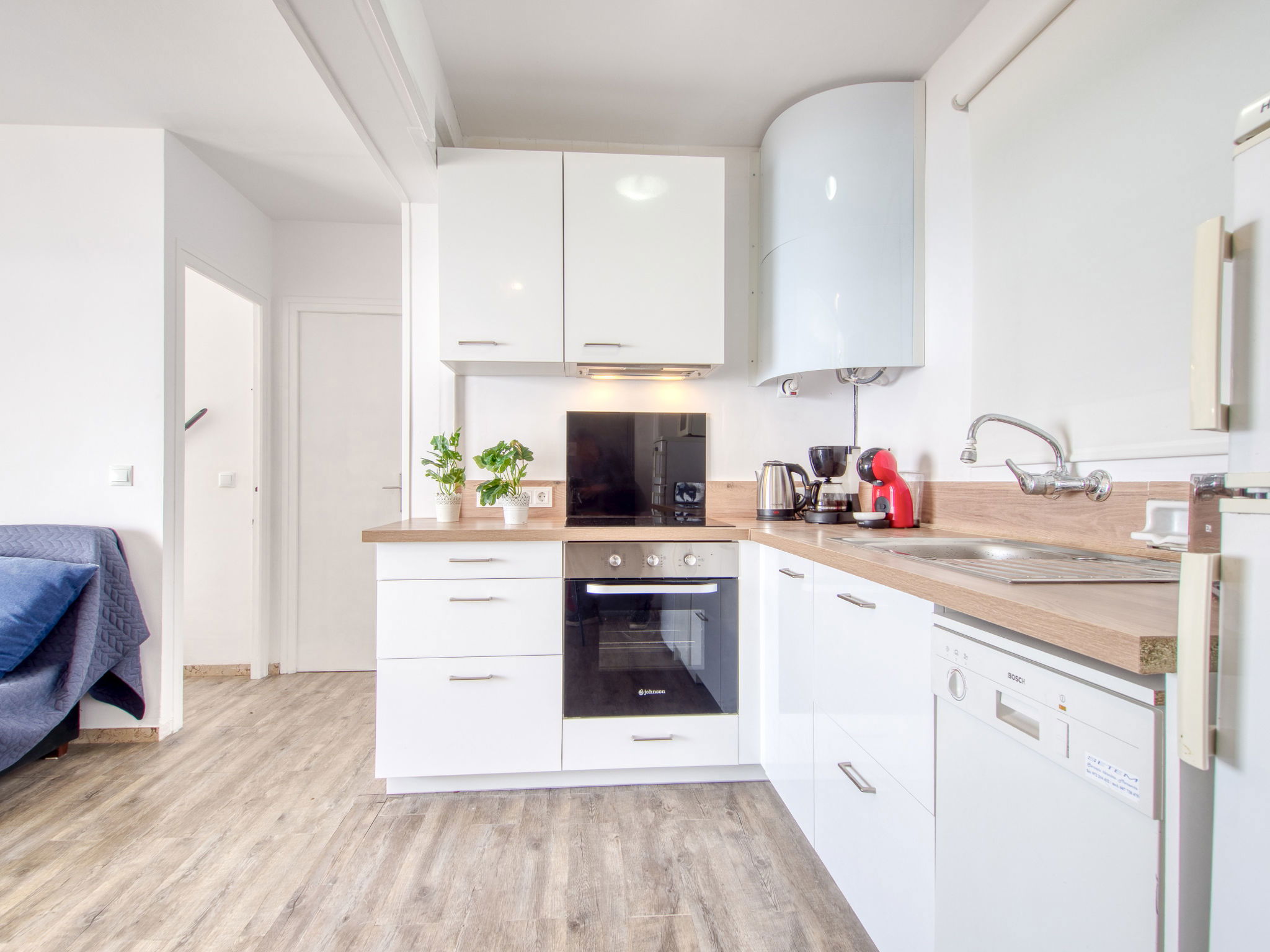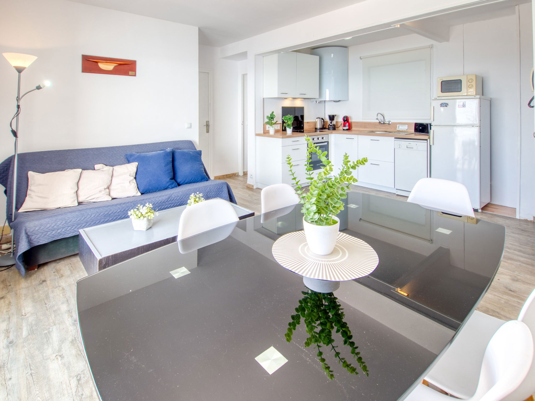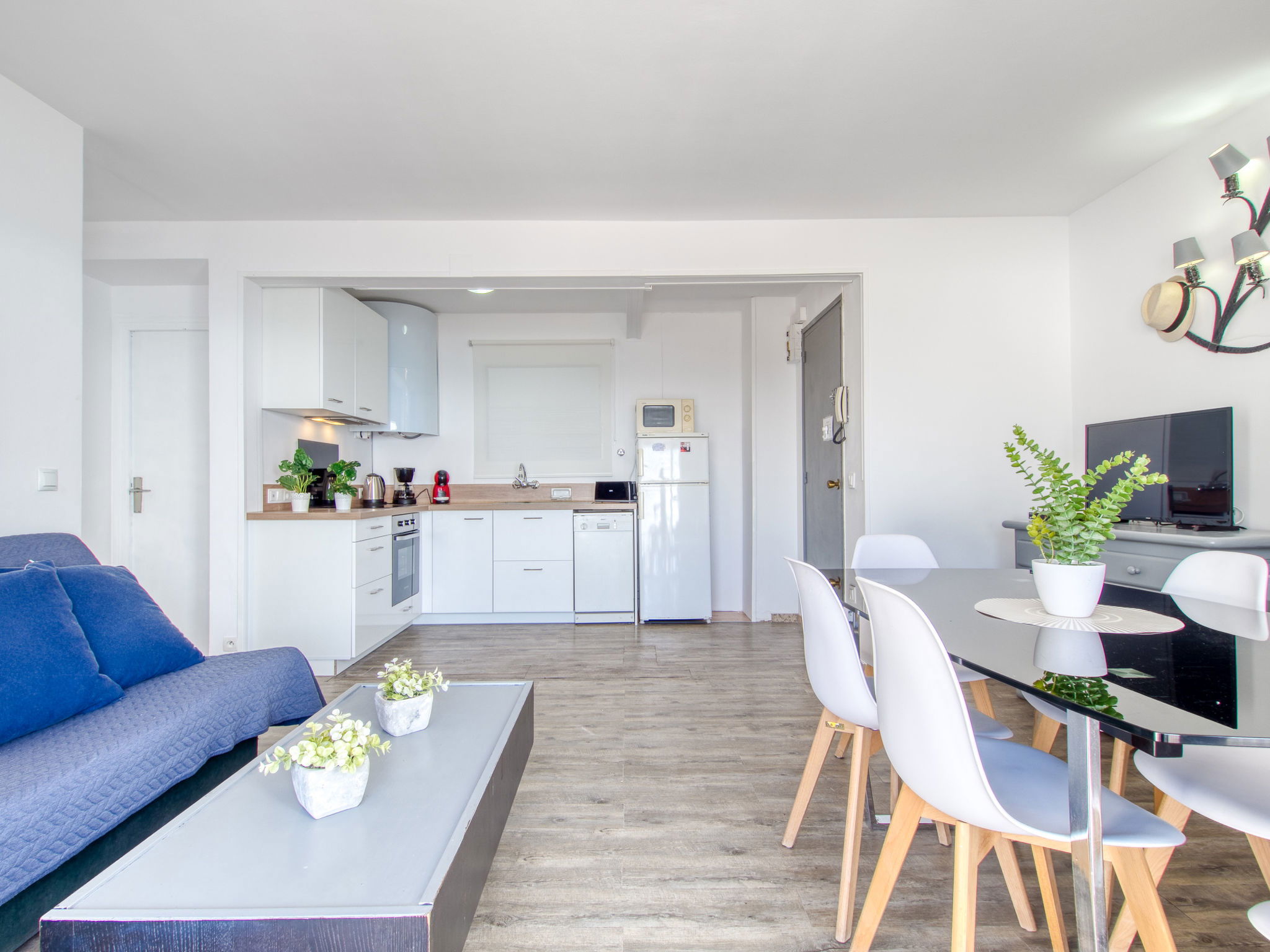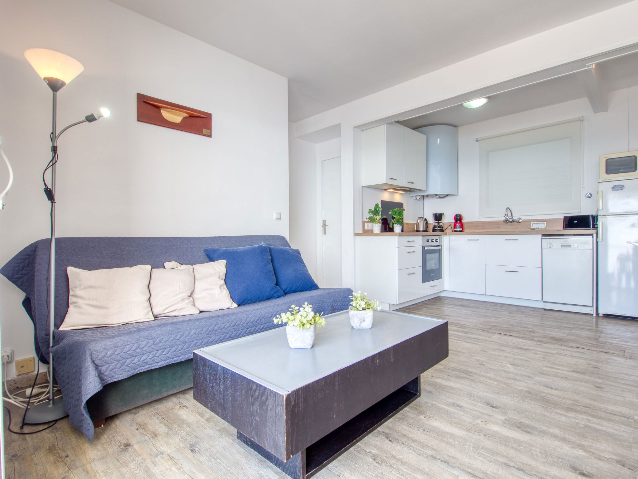 3-Zimmer-Wohnung 45 m2. Hell, teilweise renoviert im Jahre 2025, modern und gemütlich eingerichtet: Wohn-/Esszimmer mit Esstisch, Sat-TV, Klimaanlage und Warmluftheizung. Ausgang zum Balkon. 1 Zimmer mit 1 franz. Bett (150 cm, Länge 190 cm). 1 Zimmer mit 2 Betten (90 cm, Länge 190 cm). Offene Küche (Geschirrspüler, 3 Induktionskochplatten, Toaster, Wasserkocher, Mikrowelle, Tiefkühler, elektrische Kaffeemaschine). Dusche/WC. Terrasse 10 m2. Terrassenmöbel. Panoramasicht auf das Meer und die Berge. Zur Verfügung: Waschmaschine, Bügeleisen, Haartrockner. Internet (WLAN, gratis). Parkplatz Nr. Blaumar 1. Bitte beachten: Nichtraucher-Unterkunft. Maximal 1 kleines Haustier/Hund erlaubt. TV nur FR, ES.
