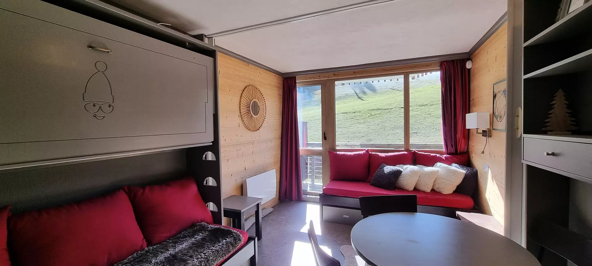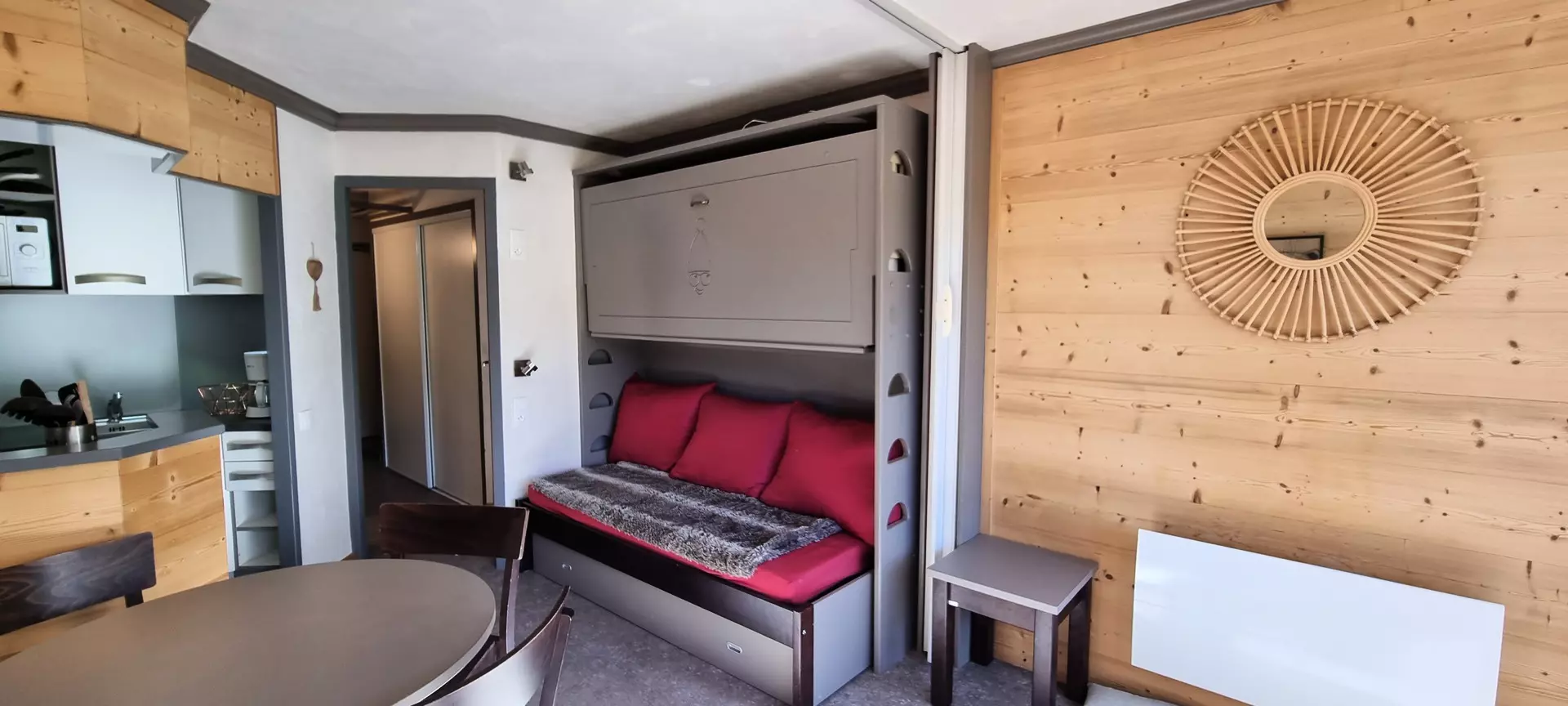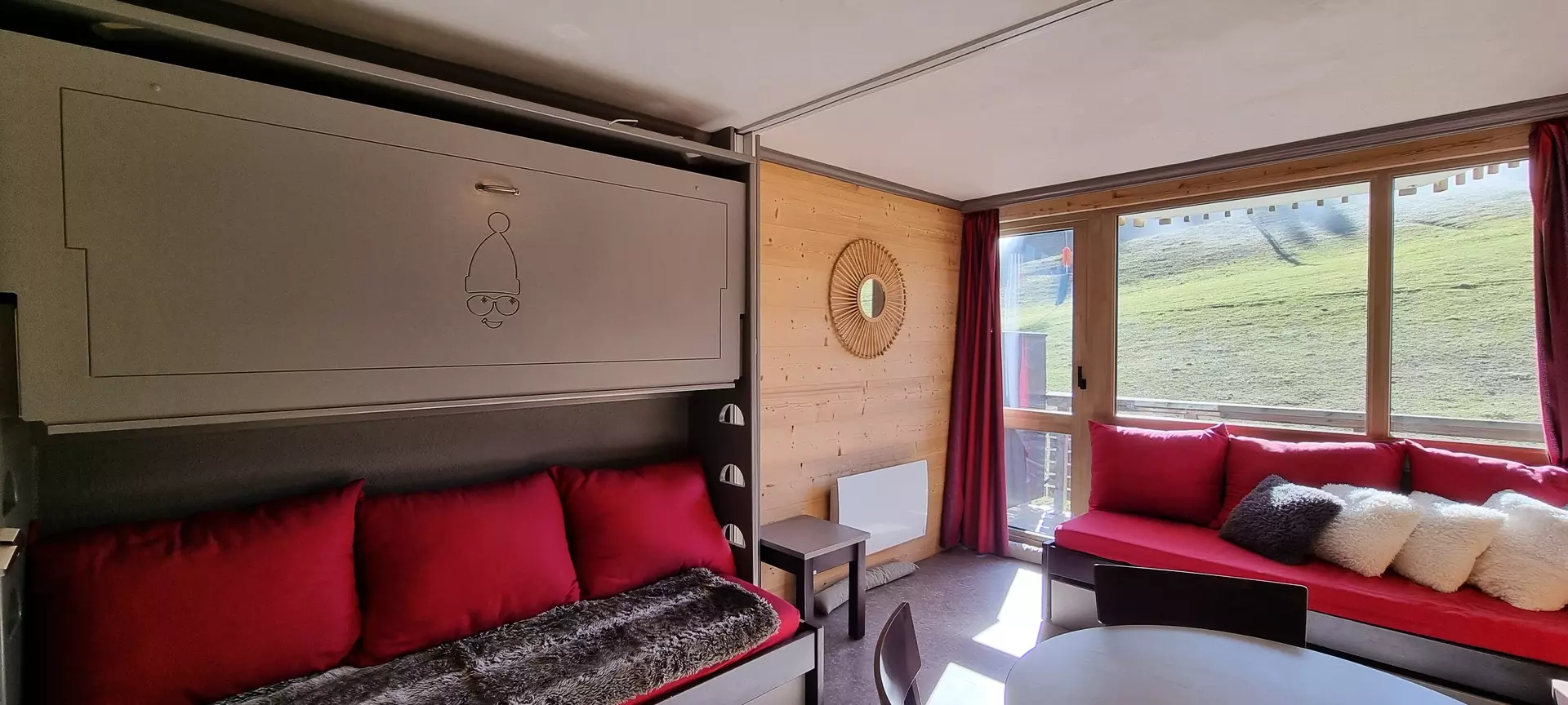 Dieses nach Süden ausgerichtete Studio mit herrlichem Blick auf die Pisten befindet sich auf Ebene „D“ des Paquebot des Neiges. Es ist mit dem Aufzug „Flèche“ erreichbar und besteht aus einem Wohnzimmer mit moderner, zum Wohnzimmer hin offener Küche und einem Badezimmer.