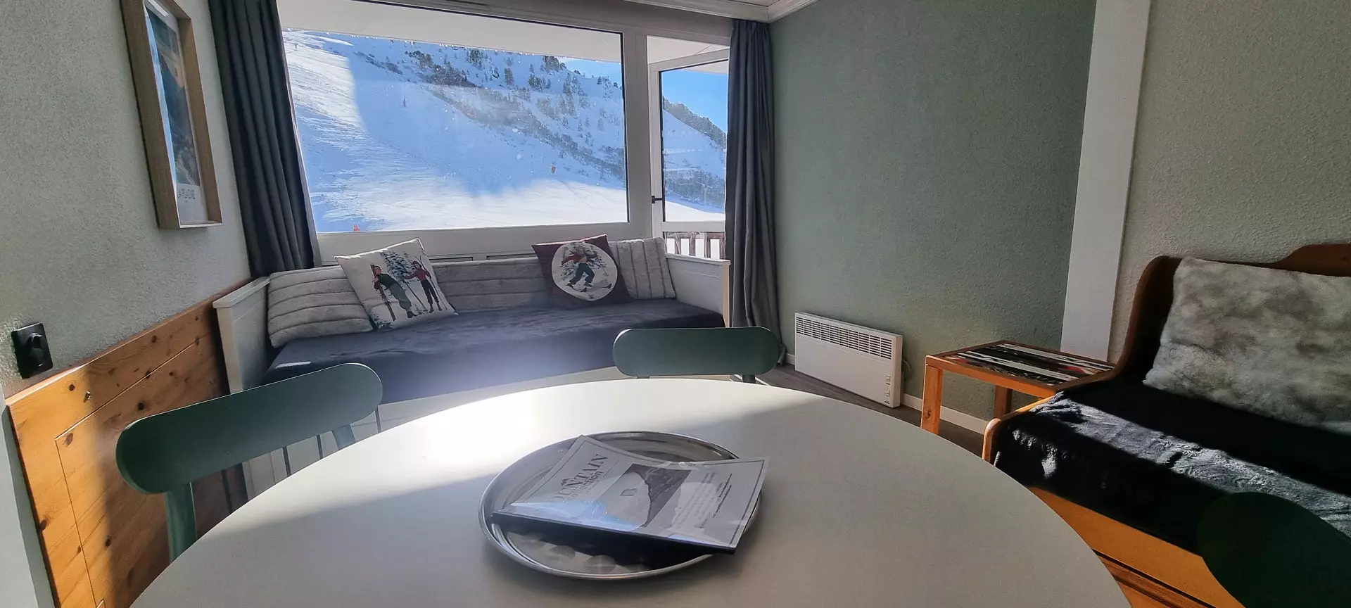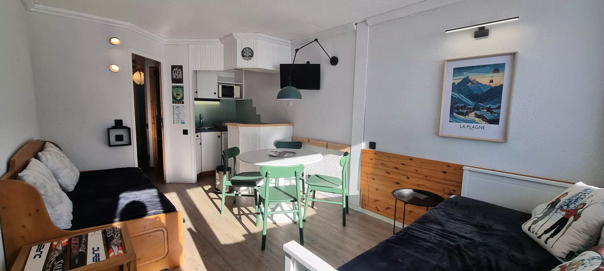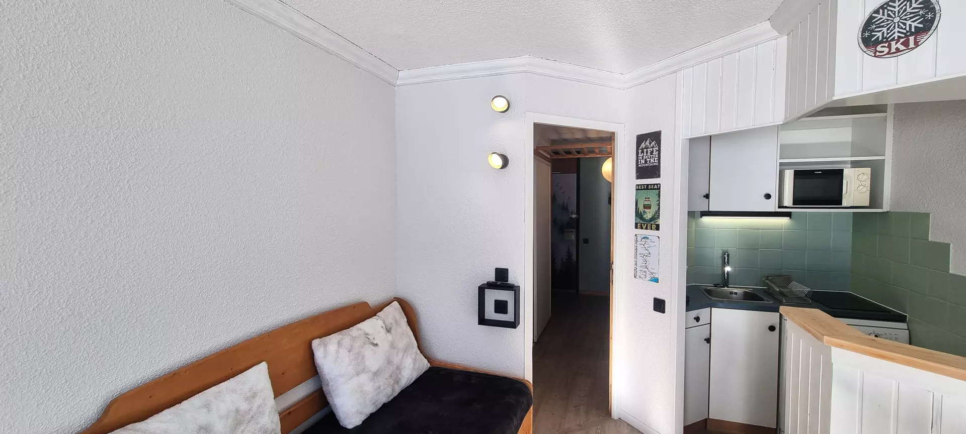 Dieses Studio befindet sich auf Ebene „M“ des Paquebot des Neiges und ist mit dem Aufzug „Chamois“ erreichbar. Es besteht aus einer zum Wohnzimmer offenen Küche, einem Badezimmer und einer separaten Toilette. Der Südbalkon bietet einen herrlichen Blick auf die Pisten von Aime 2000.